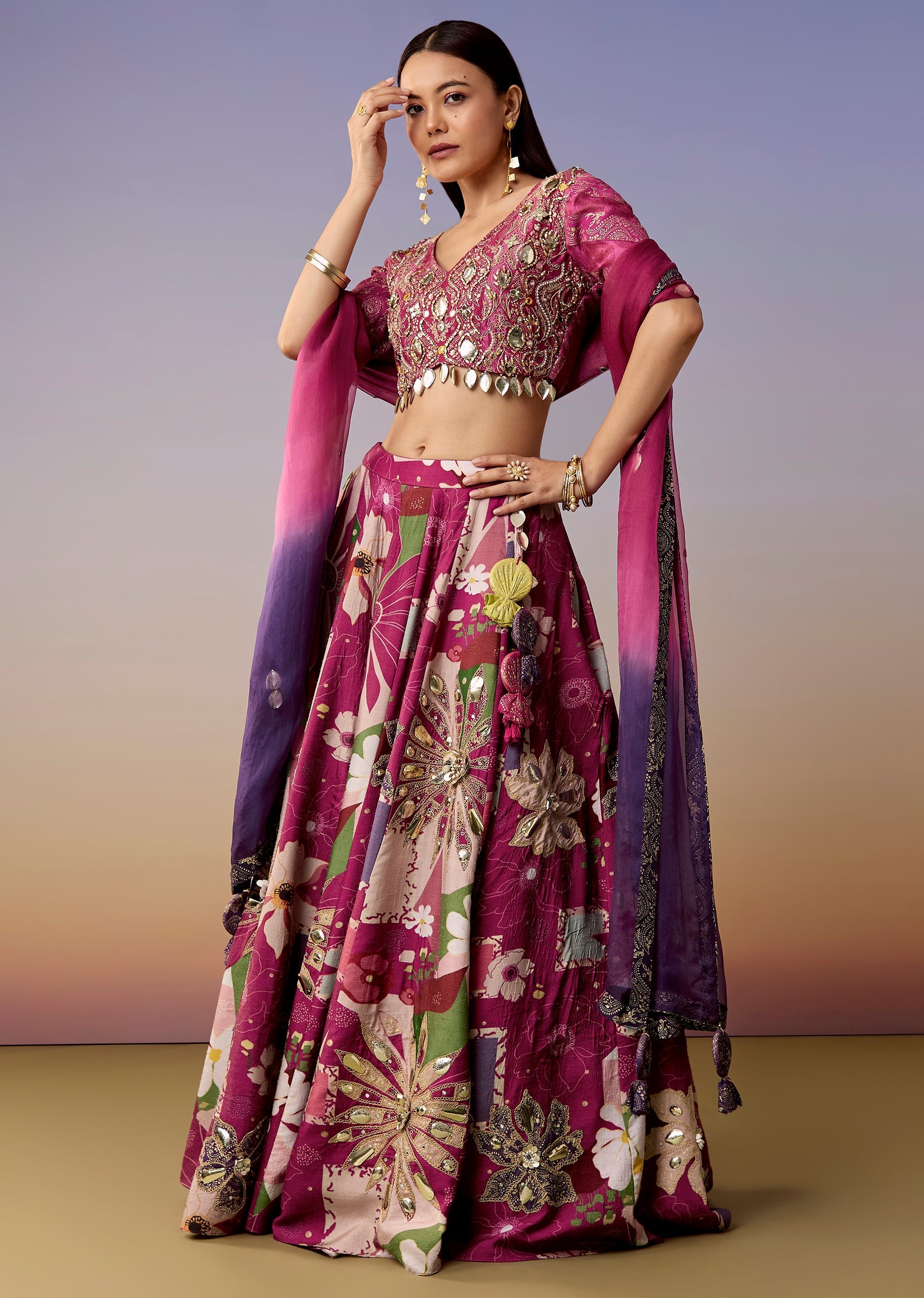 Wine Floral Abstract Bridesmaid Lehenga Set