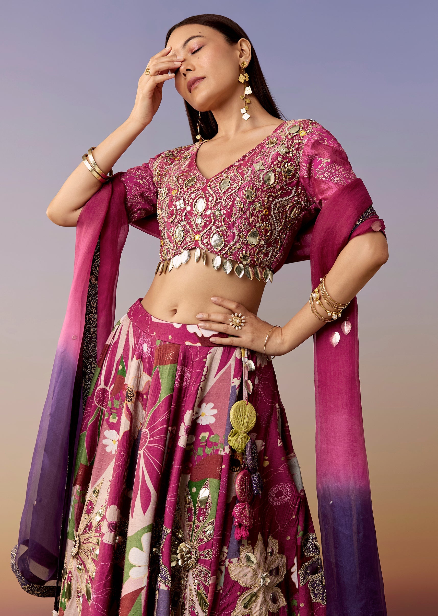 A bold wine set featuring a half-sleeve V-neck choli with beadwork, paired with a floral-abstract printed flared lehenga and dupatta. A standout pick for mehendi and sangeet nights. Awarded as... More Product Details