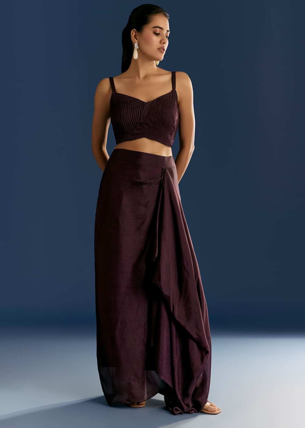 Wine Georgette Pintuck Croptop And Fancy Skirt With Embroidered Cape