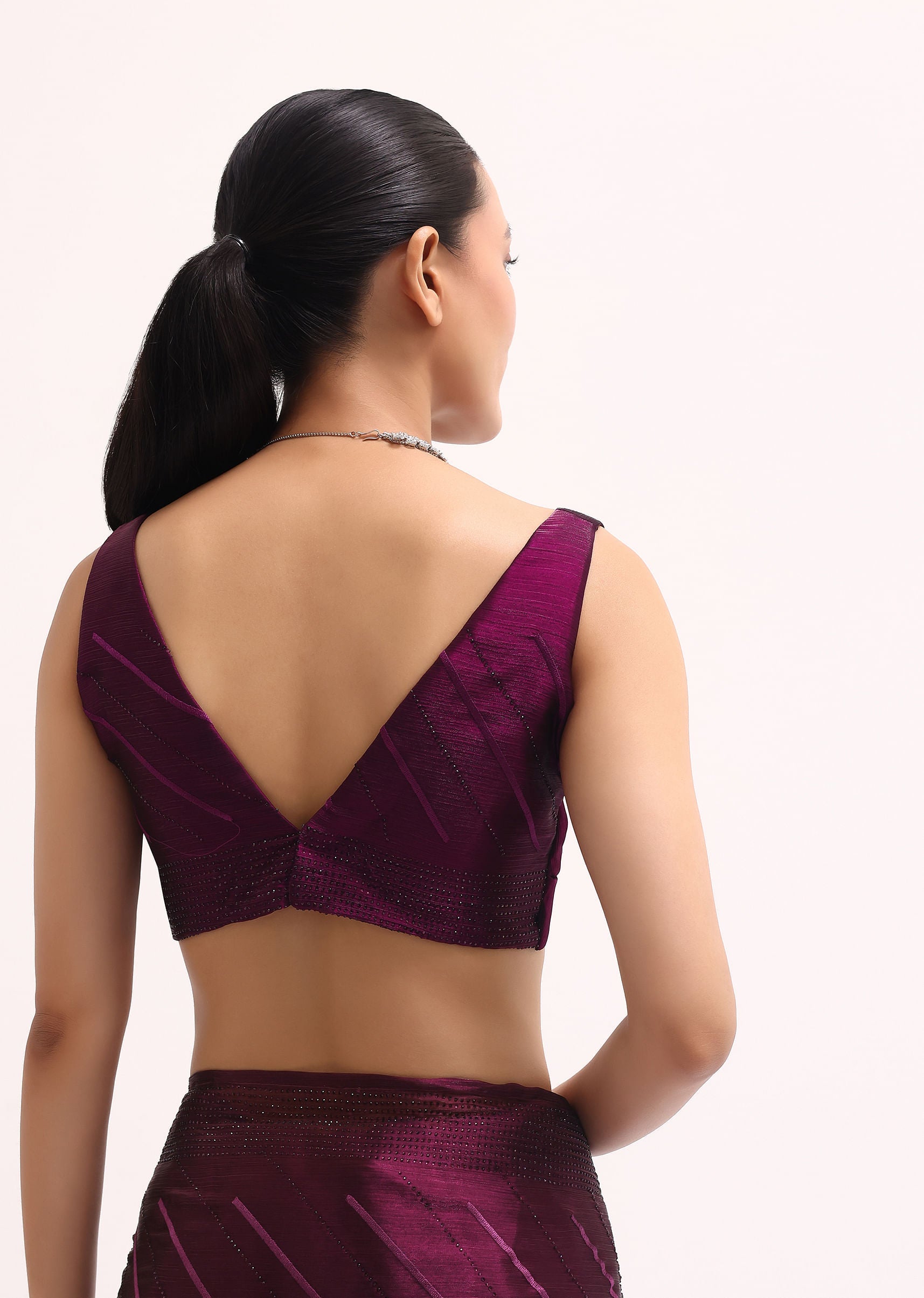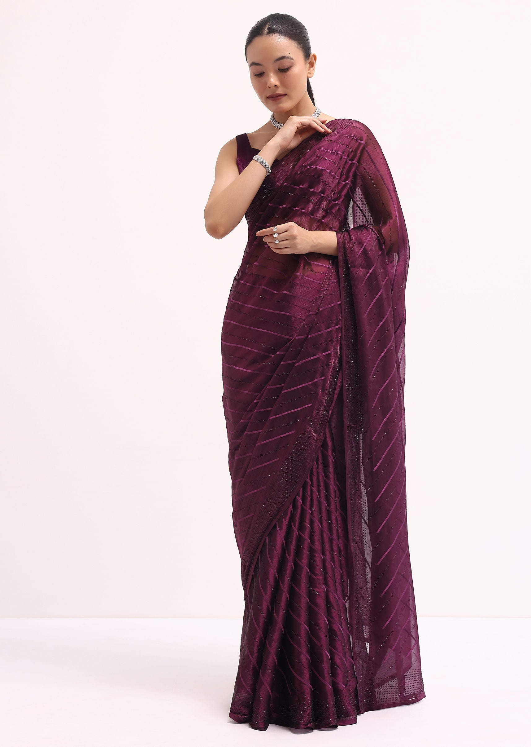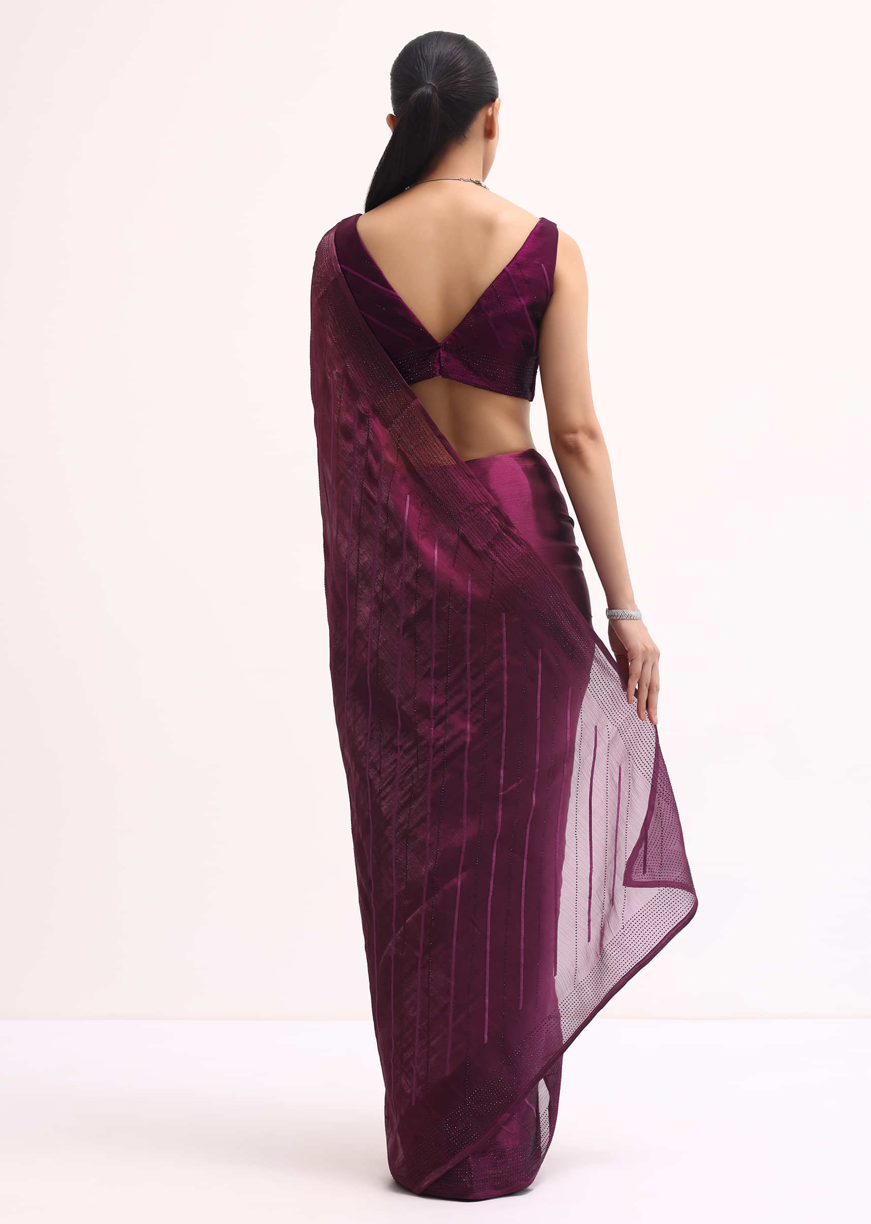 Make a grand entrance with our stunning wine saree ideal for weddings and festive events. The saree is made from elegant glass tissue fabric and embellished with swarovski crystals all over. It includes an unstitched blouse. Awarded as the Most Trusted Brand, we're delivering styles you love, just as promised.