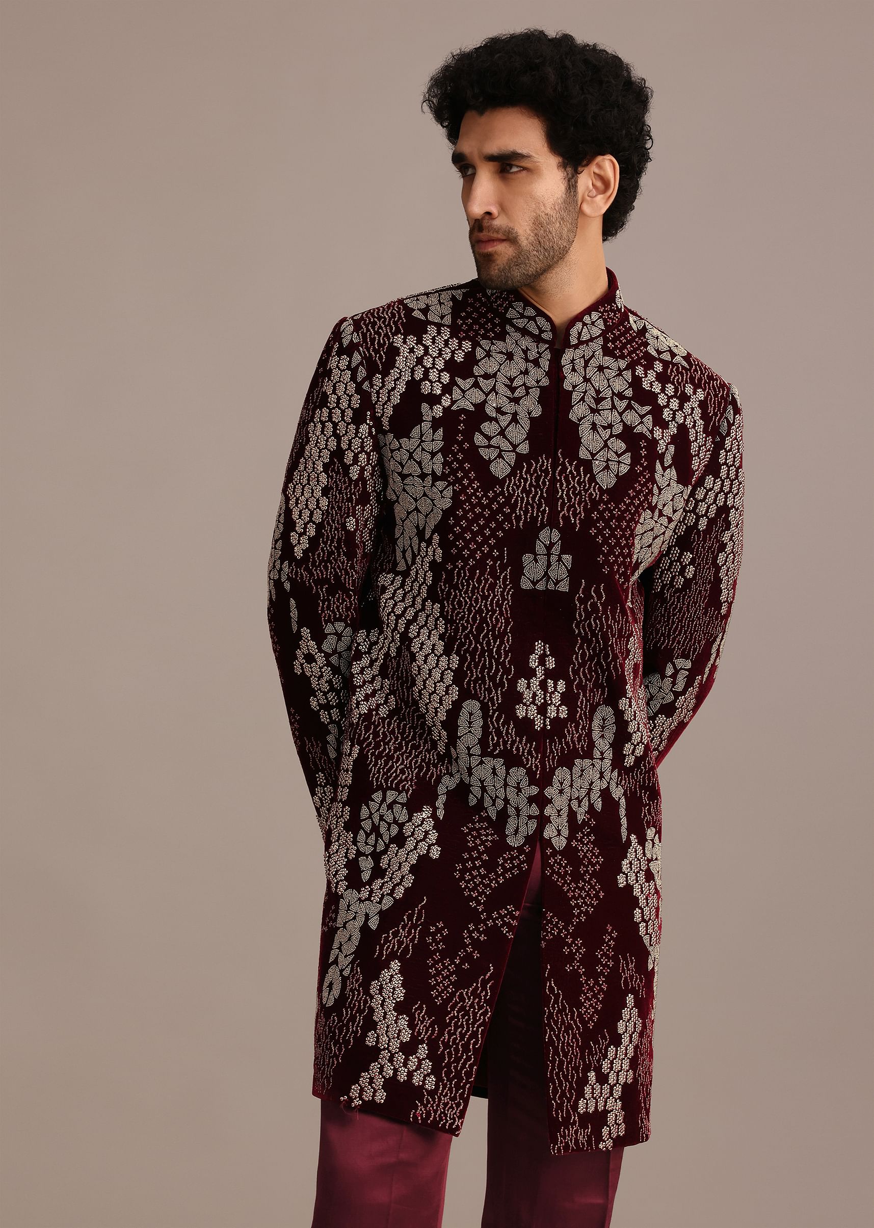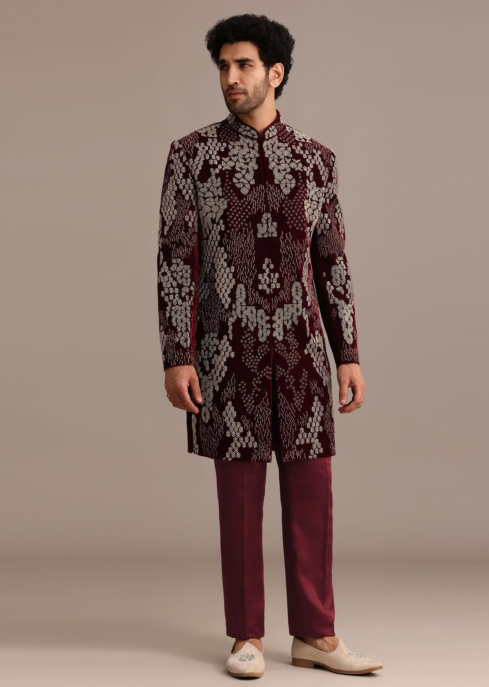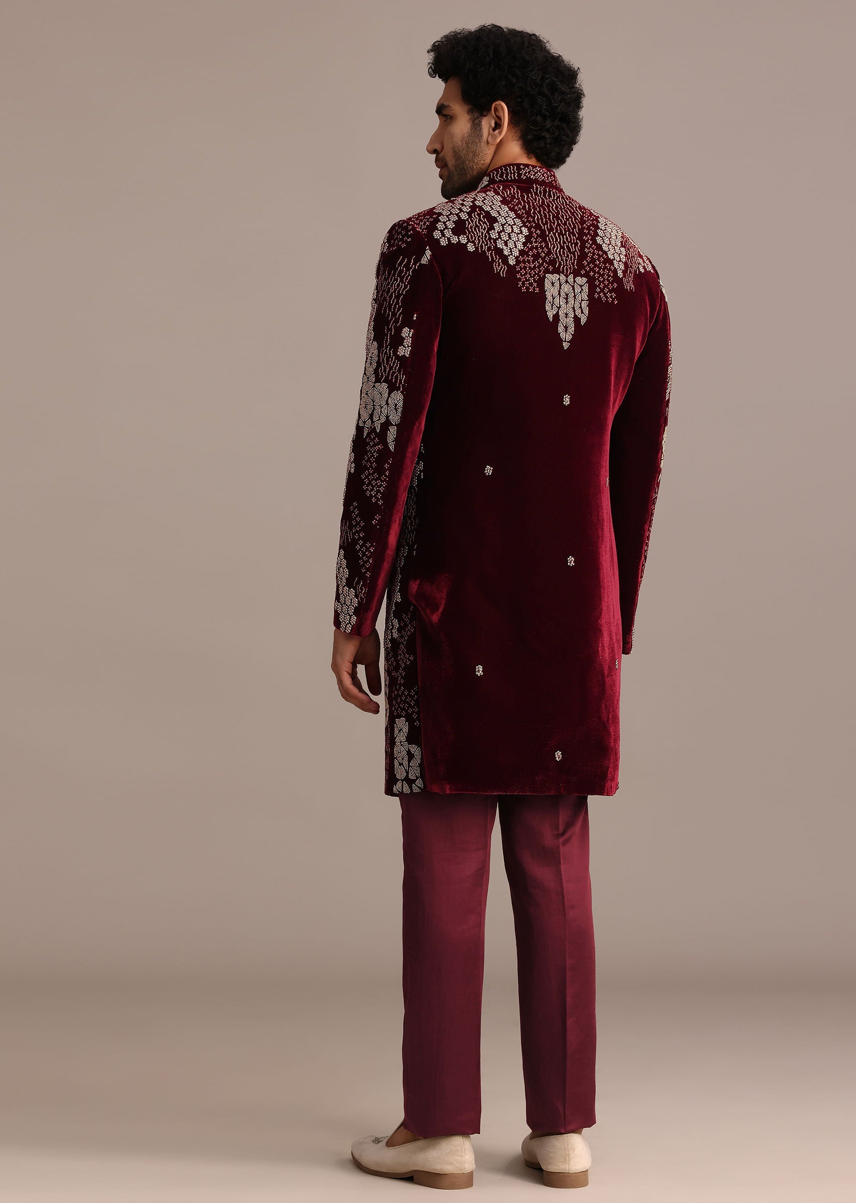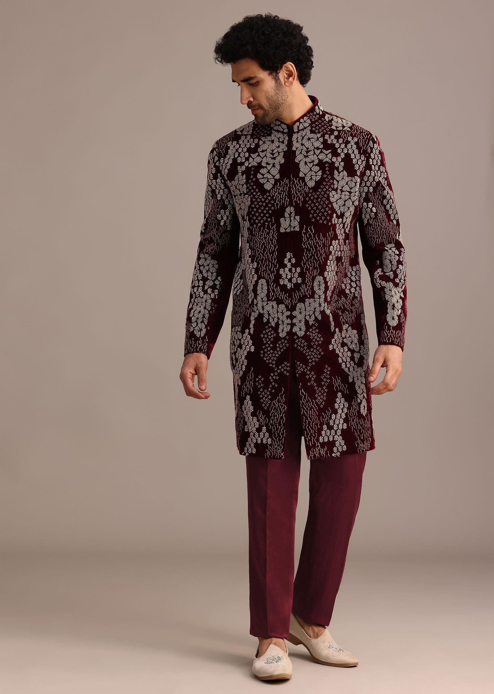 In a striking jewelled tone, this indo-fusion contemporary silhouette blends new-age designs with traditions. The luxurious velvet base makes if ideal for cocktail parties and wedding celebrations. Featuring a mandarin... More Product Details