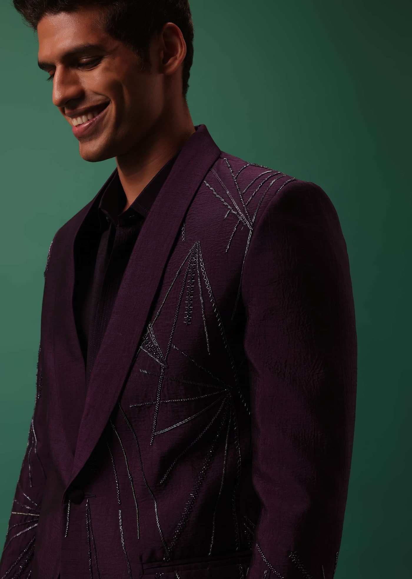 Wine Hand Embroidered Tuxedo Set With Fusing Pants