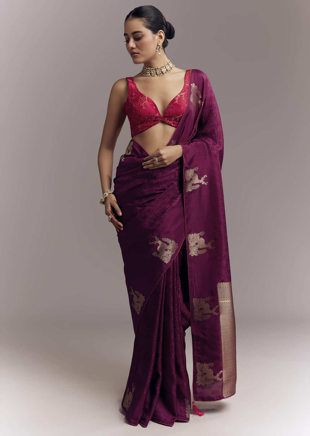 Wine Jacquard Silk Woven Saree With Brocade Work And Embroidery