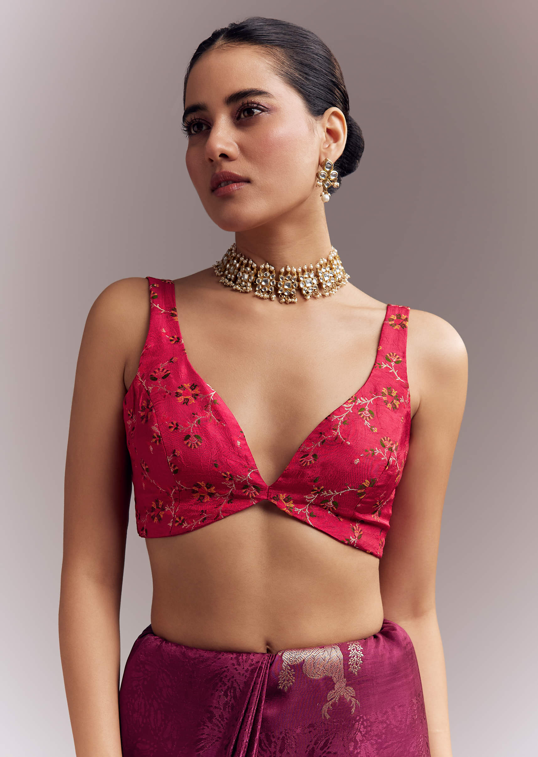 Rich tone meets sculpted texture as this wine jacquard silk woven saree sets a poised foundation. Zari brocade and red piping outline the saree neatly, while tassels and a contrast... More Product Details