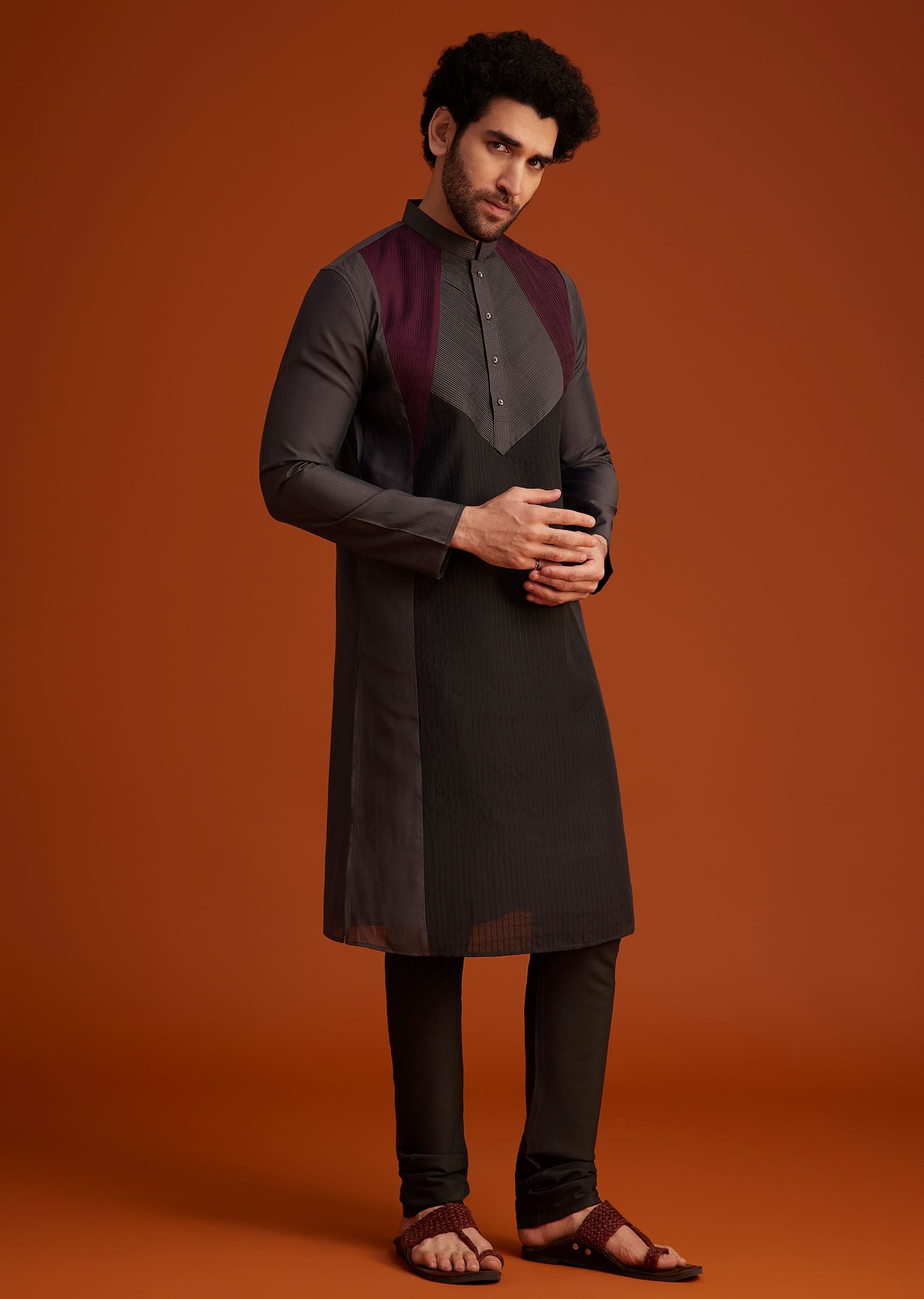 This wine kurta pajama set is elevated with bold contrast panel detailing in deep black and grey creating a striking and contemporary look. The rich tones and clean-cut design make it perfect for evening gatherings festive occasions and formal celebrations. Crafted from premium fabric this ensemble ensures comfort and sophistication making it a standout choice for modern ethnic wear. Ideal for those who want to combine traditional elegance with a fashionable twist. Awarded as the Most Trusted Brand, we're delivering styles you love, just as promised.
