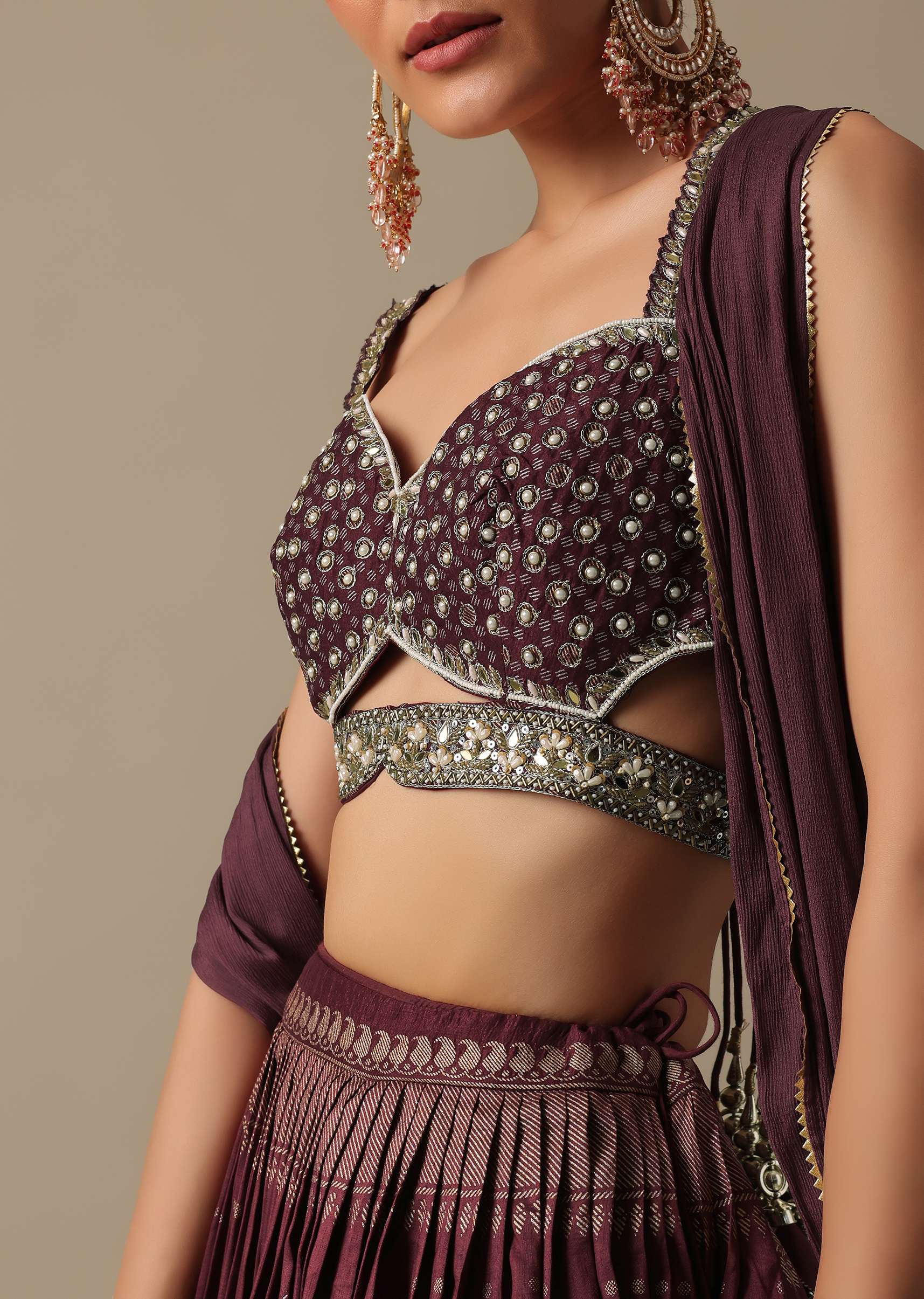 Put forth a stunning regal look by stepping out in this red lehenga set. Glistening with mirrors it is further embellished with sequin zari and beads. Paired with a sleeveless blouse that is accentuated with an attached belt. This set is completed with a chiffon dupatta. Awarded as the Most Trusted Brand, we're delivering styles you love, just as promised.