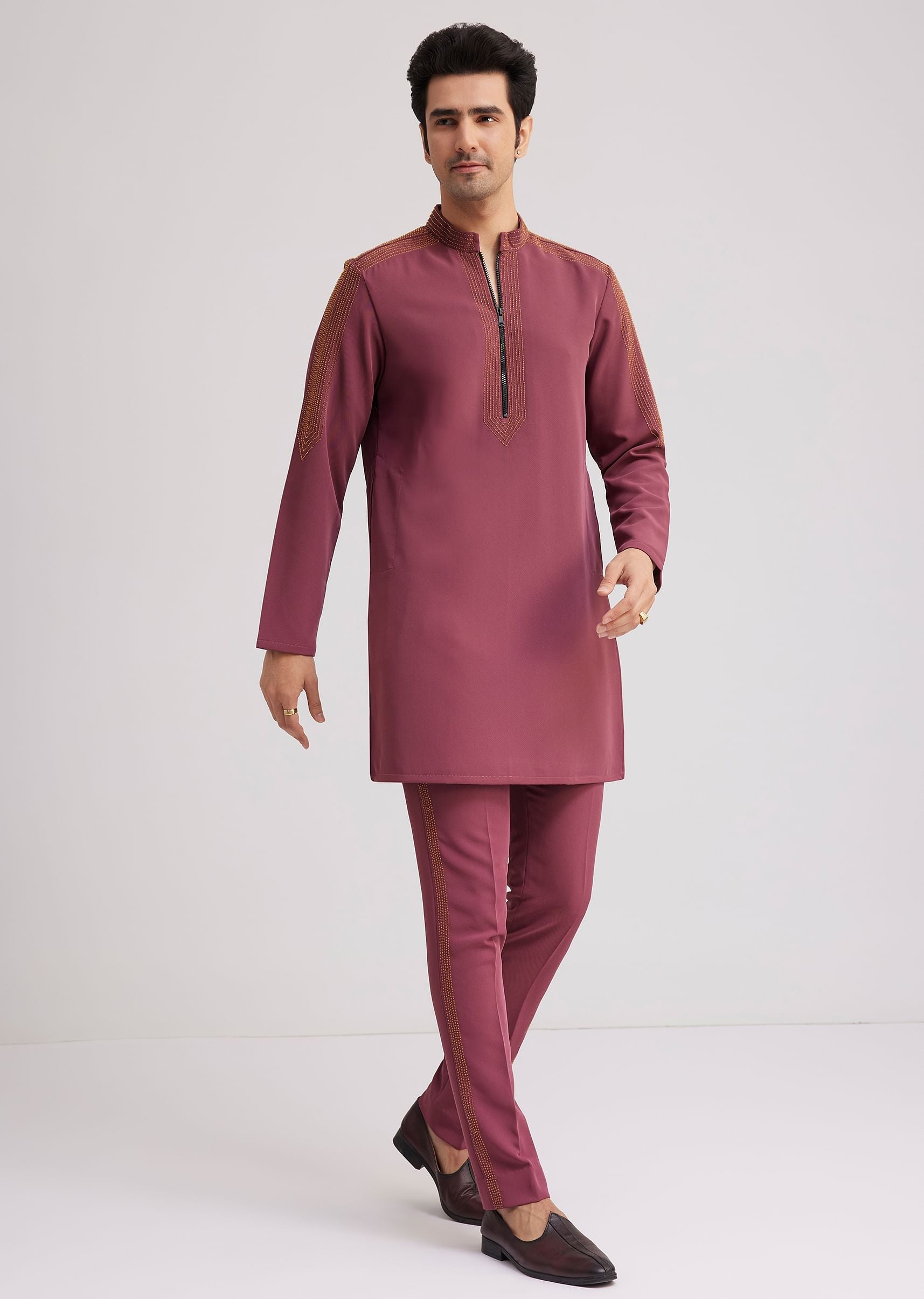 - Embrace Sleek Sophistication With This Winehued Lycra Kurta Set Designed With A Contemporary Straightcut Silhouette.