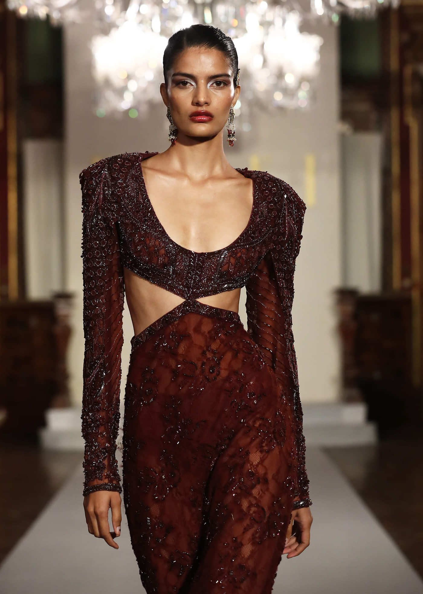 The structured gown contours gracefully while the cut-outs keep it modern and breathable.