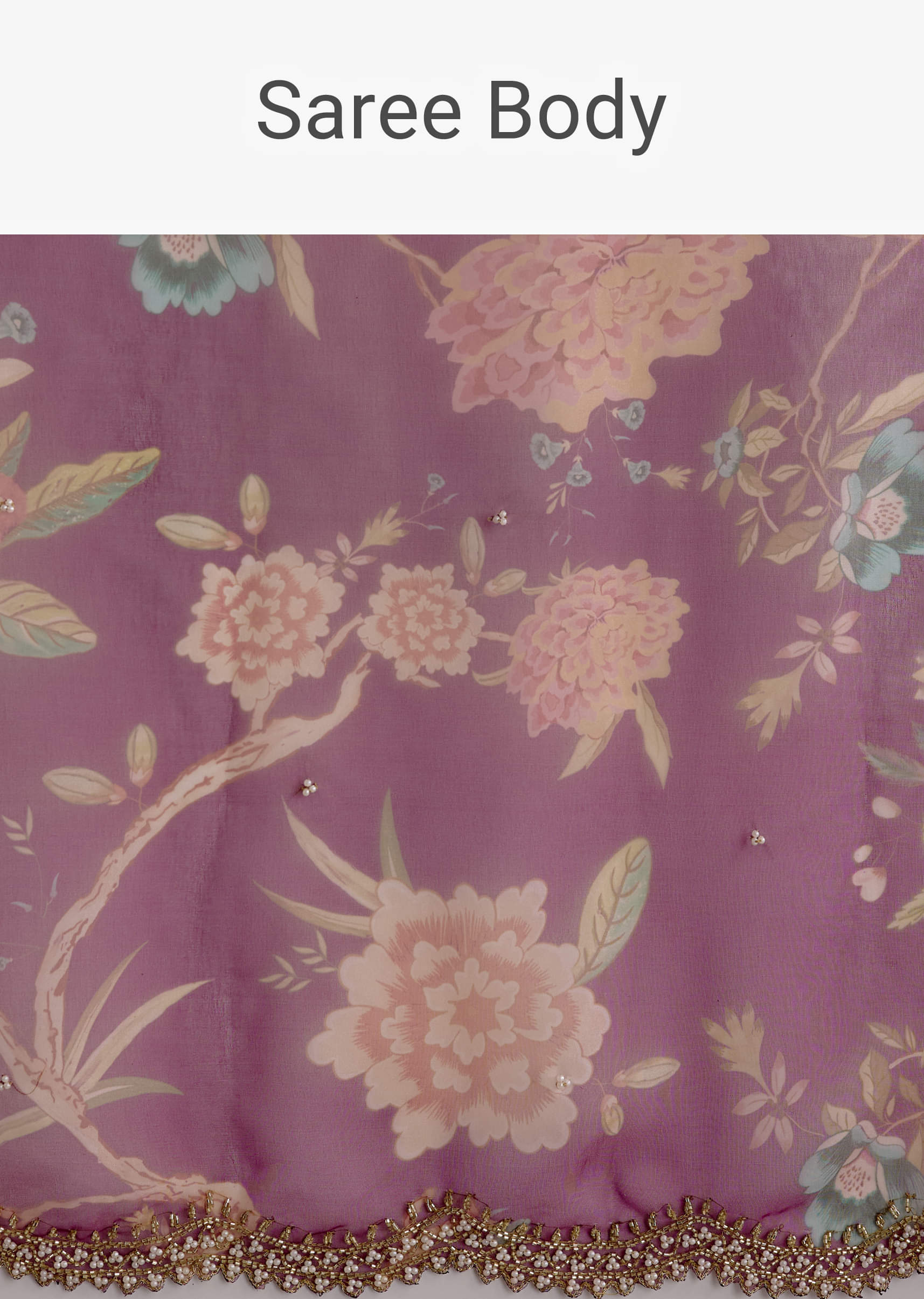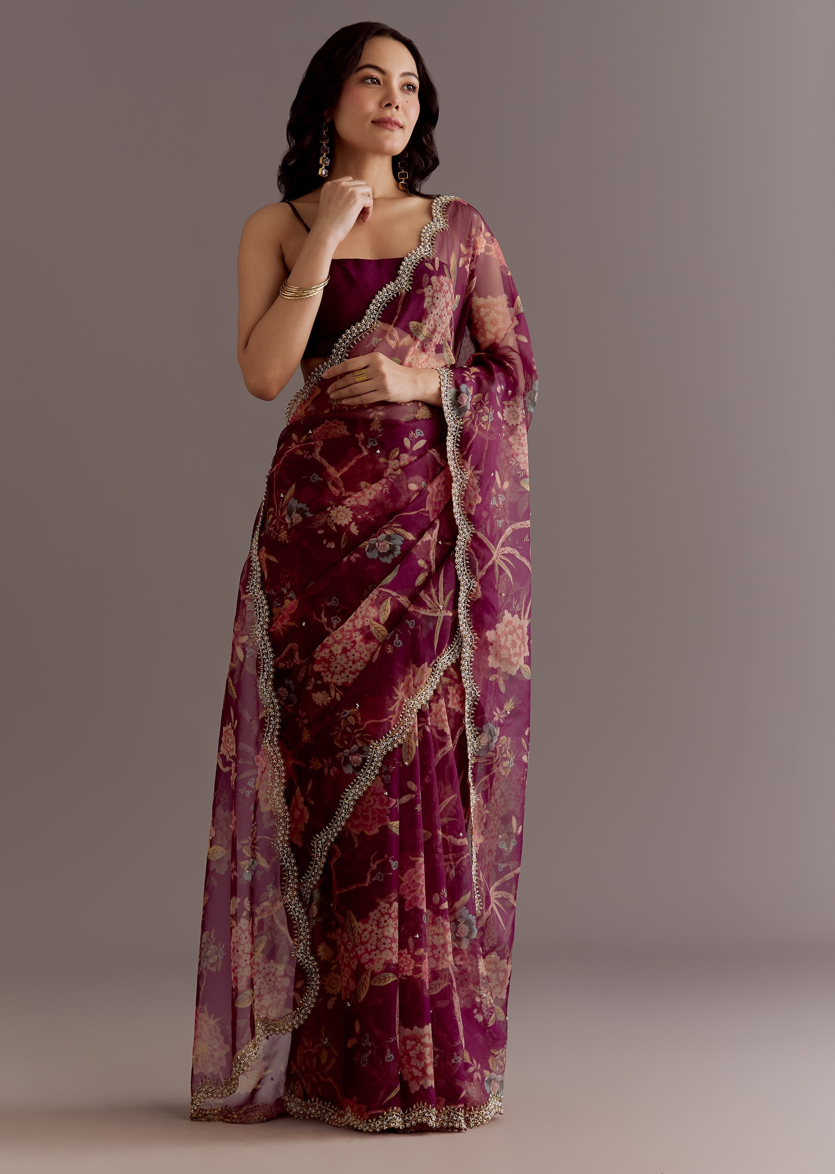 Wine Organza Saree With Floral Print And Hand Embellished Border