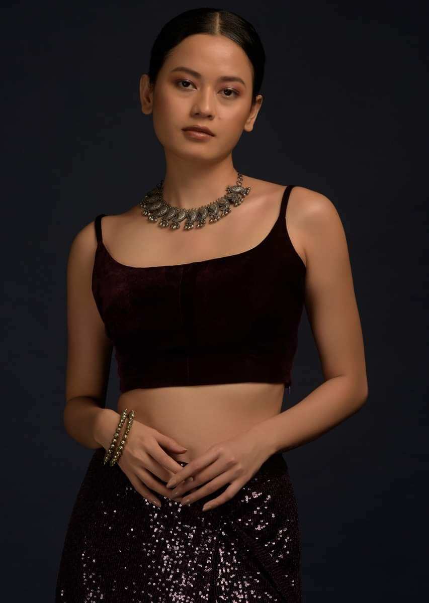 Wine Purple Blouse In Velvet With Straps On The Shoulder And Tube Neckline