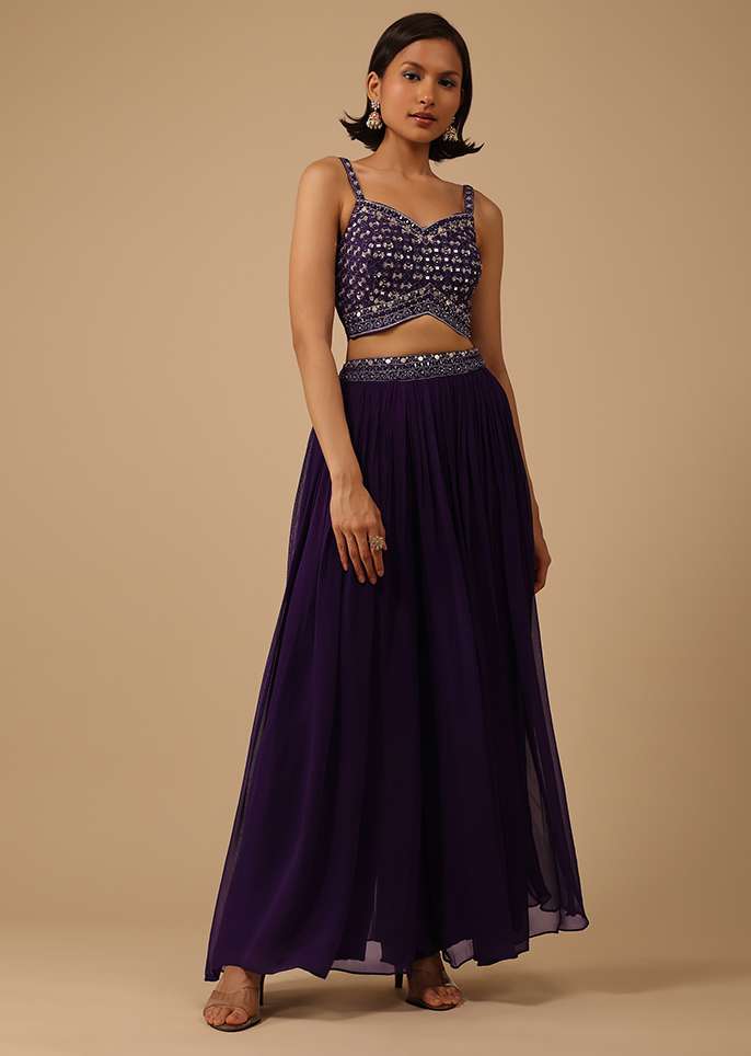 Wine Purple Palazzo Suit In Georgette With Mirror And Sequins Embroidery