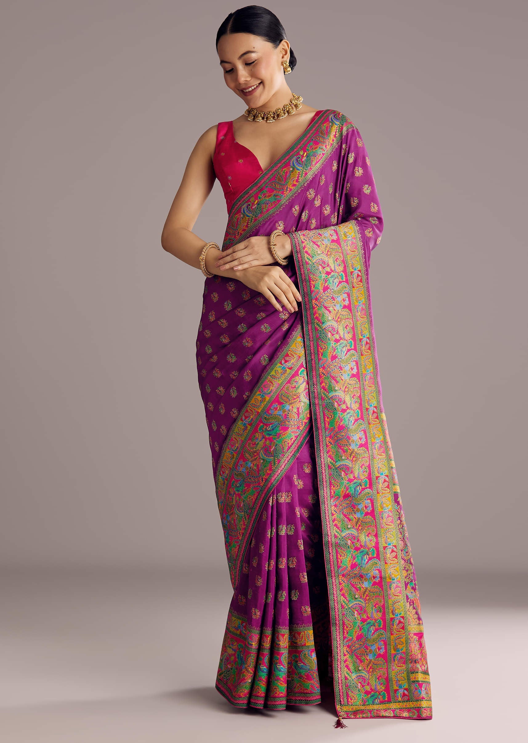 Wine Purple Saree With Multicolor Woven Motifs And Buttis