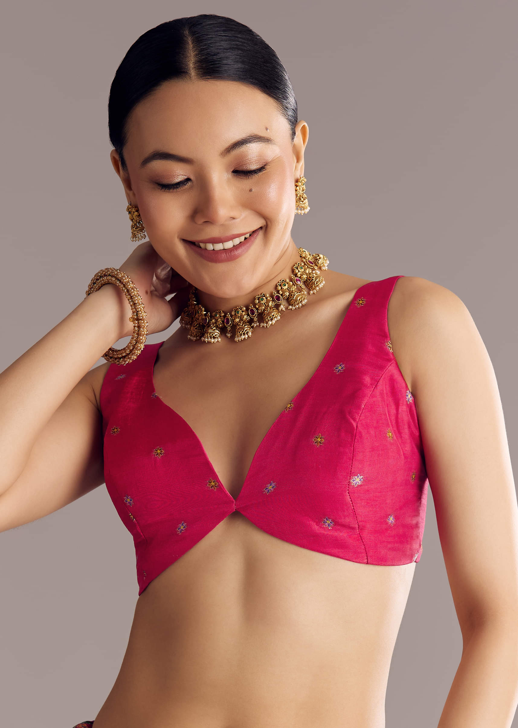 Pair with kundan chandbalis and a sleek braid adorned with fresh flowers.