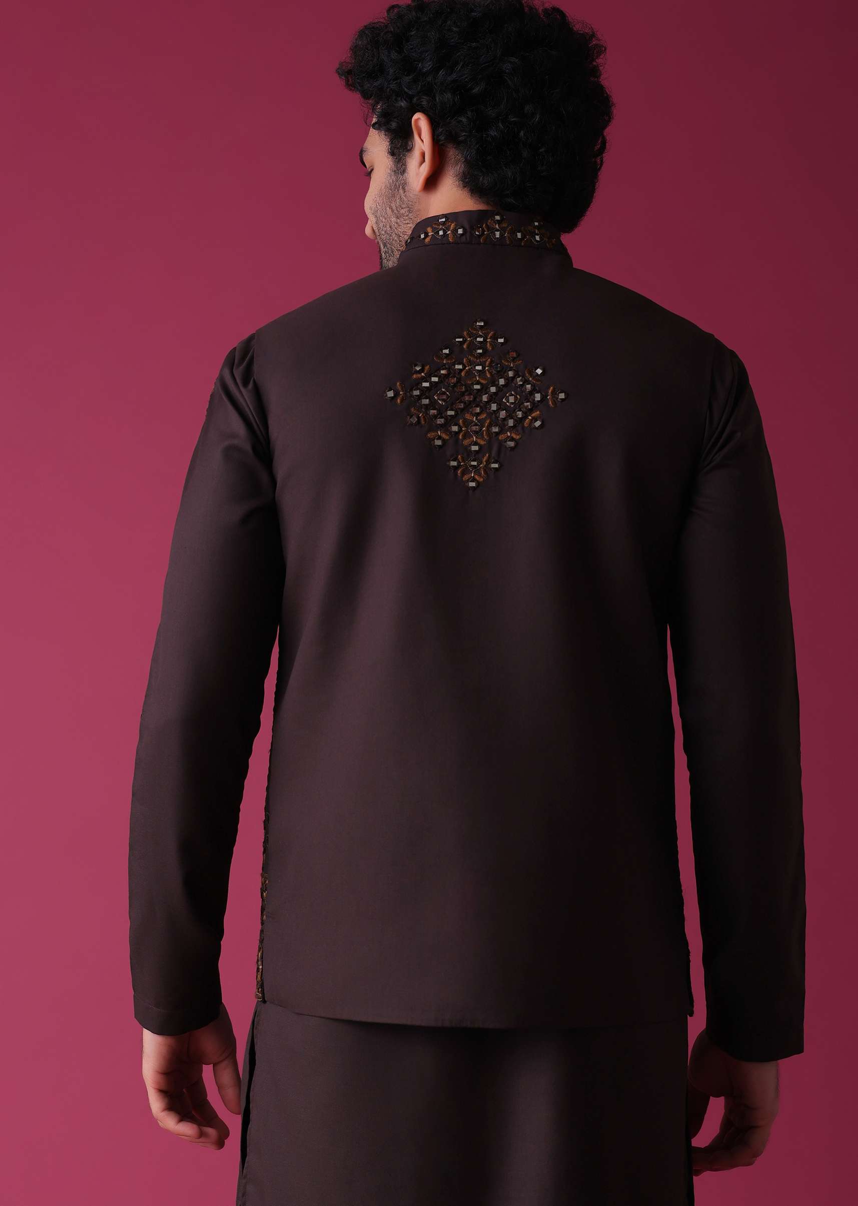 Wine Red Jacket Kurta Set In Silk With Heavy Threadwork And Abla