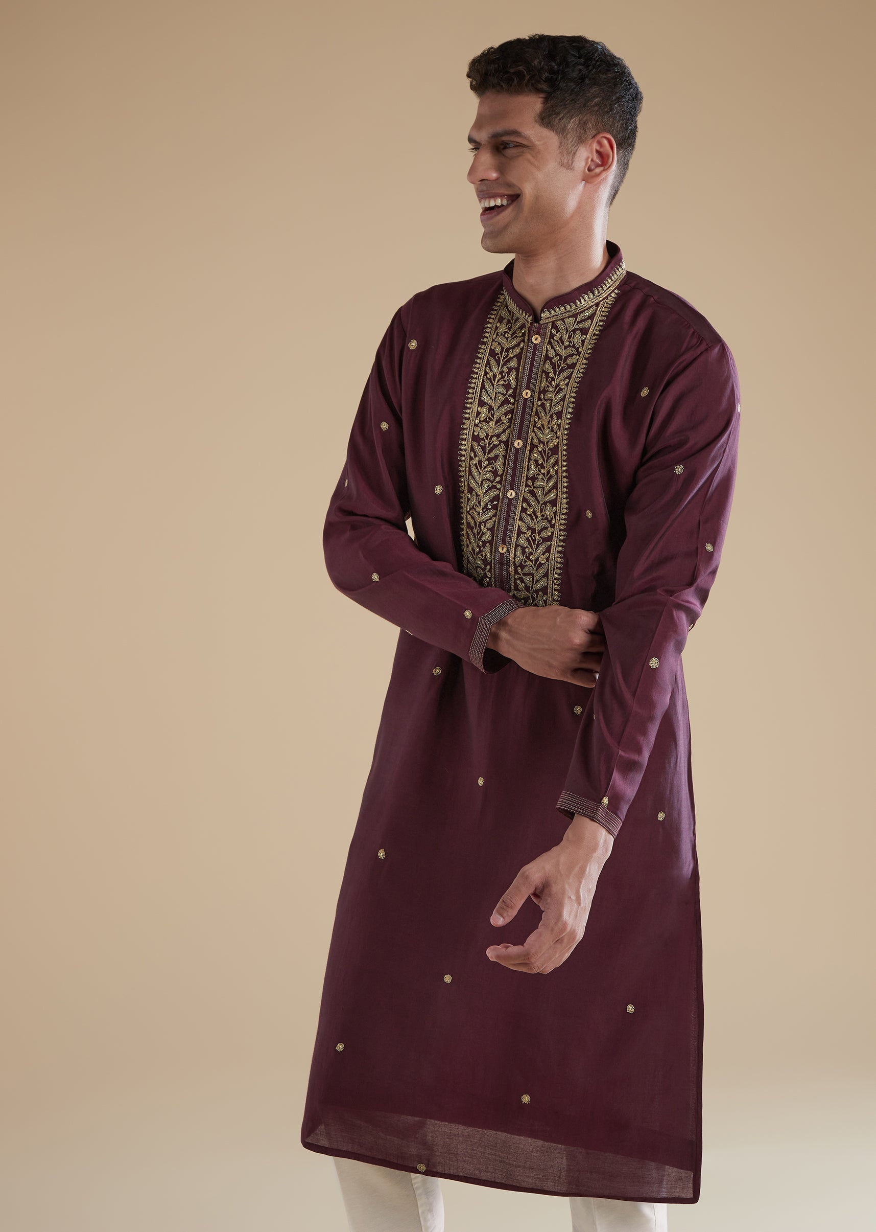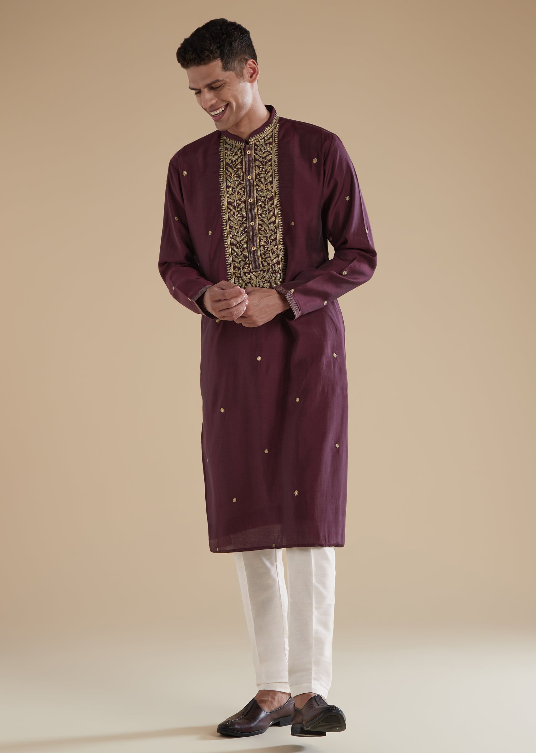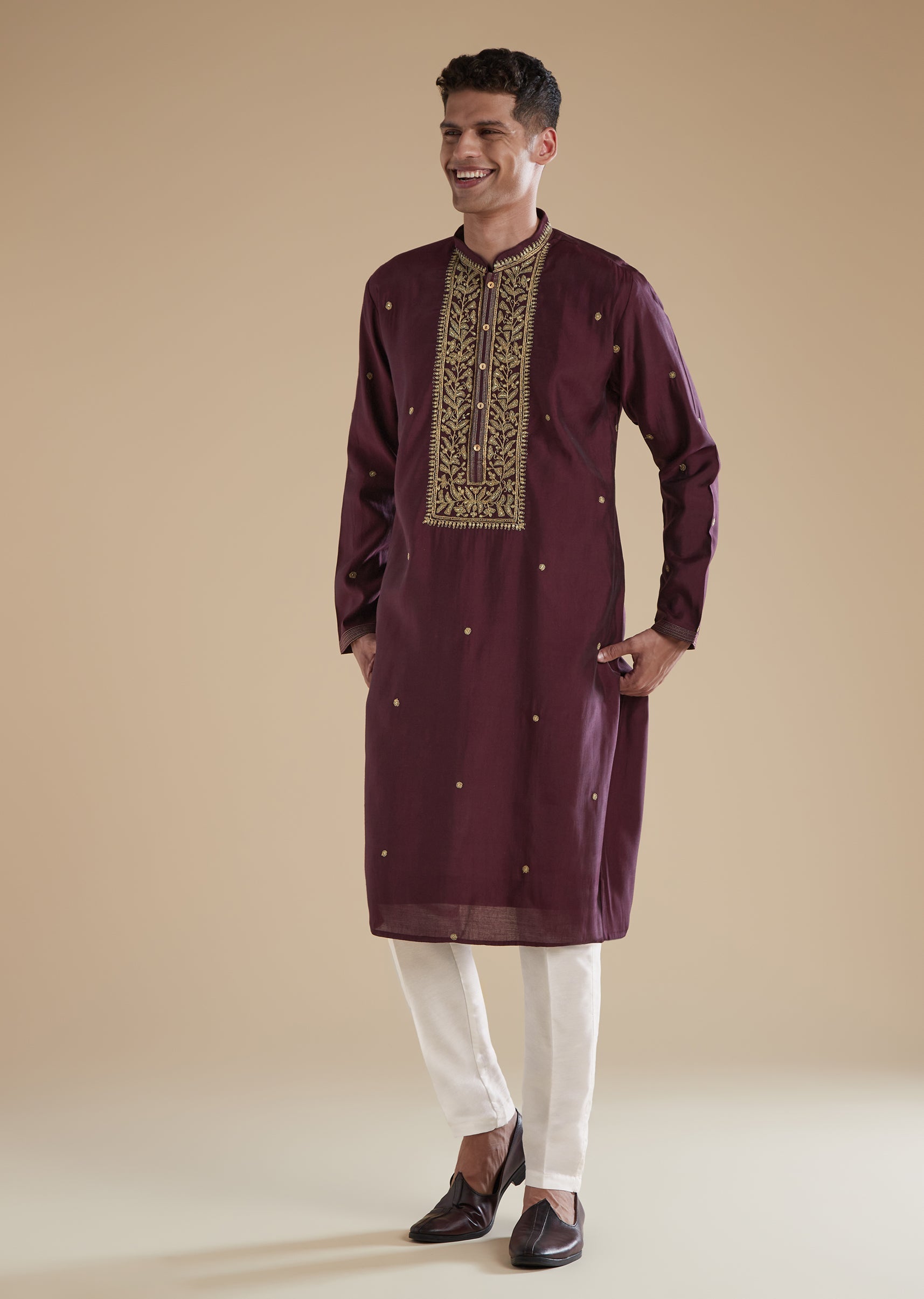 Rich and elegant, this wine red kurta set is crafted in premium silk with art silk as the secondary fabric for a smooth, lustrous finish. Designed for festive celebrations, the kurta features delicate thread and resham detailing that adds refined traditional charm. Styled with a mandarin collar, full sleeves, and clean front button closures on both the kurta and the coordinating pants, the ensemble offers a polished and sophisticated silhouette perfect for evening festivities. Awarded as the Most Trusted Brand, we're delivering styles you love, just as promised.