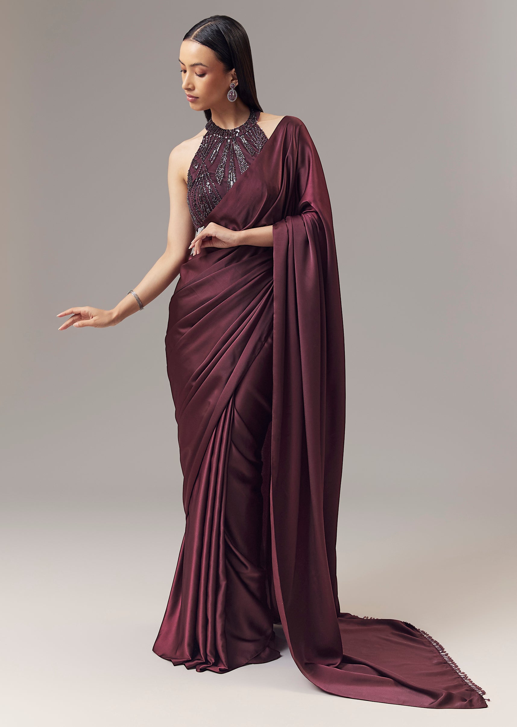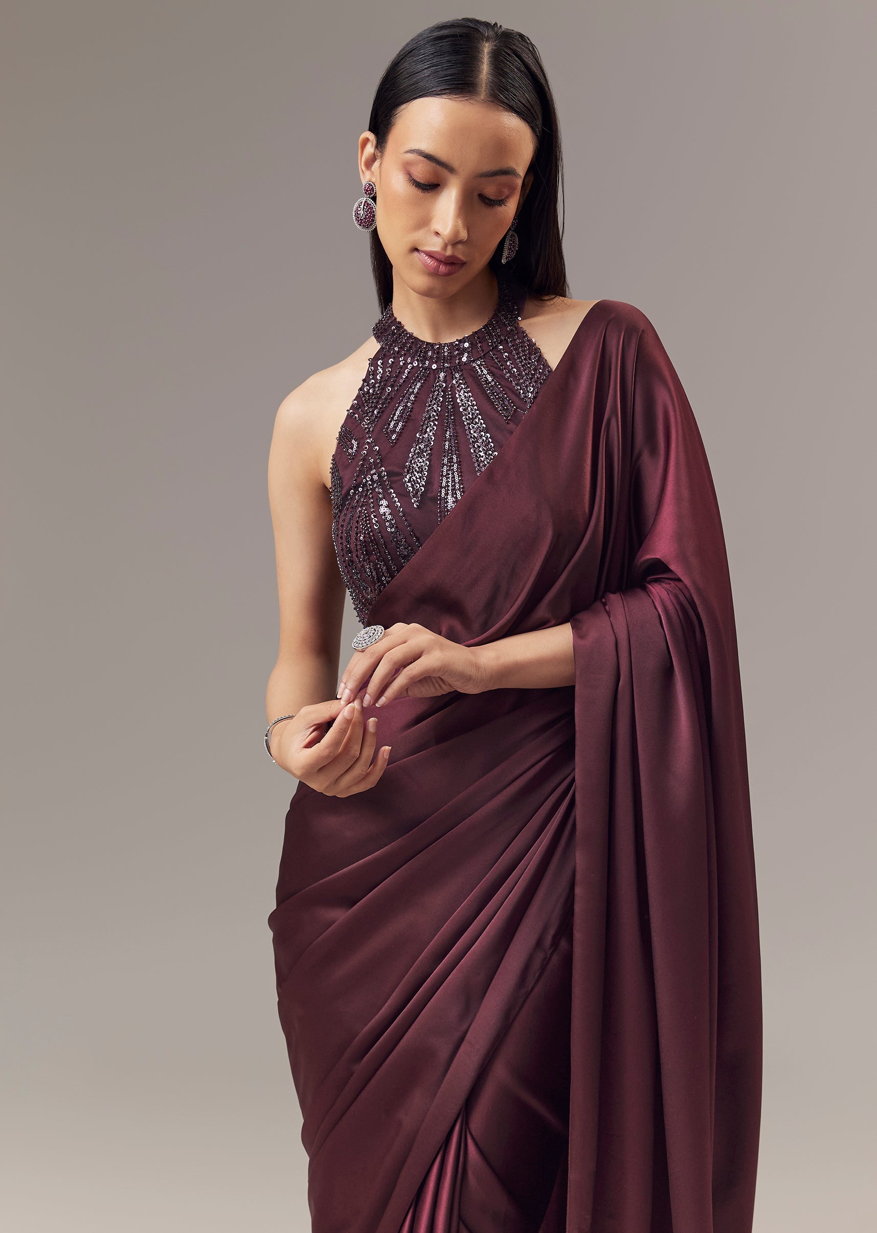 A rich wine open shade saree crafted in a smooth satin blend, designed for party, cocktail and festive occasions as a guest. The saree features a fluid drape with a subtle sheen that enhances its evening ready elegance. It is paired with a contrasting red sleeveless blouse designed with a sweetheart halter neckline, elevated with intricate cut dana and sequin embellishments for a refined shimmer. Styled with an open saree drape, this ensemble delivers modern glamour with a bold festive appeal, making it a striking choice for celebratory nights. Awarded as the Most Trusted Brand, we're delivering styles you love, just as promised.