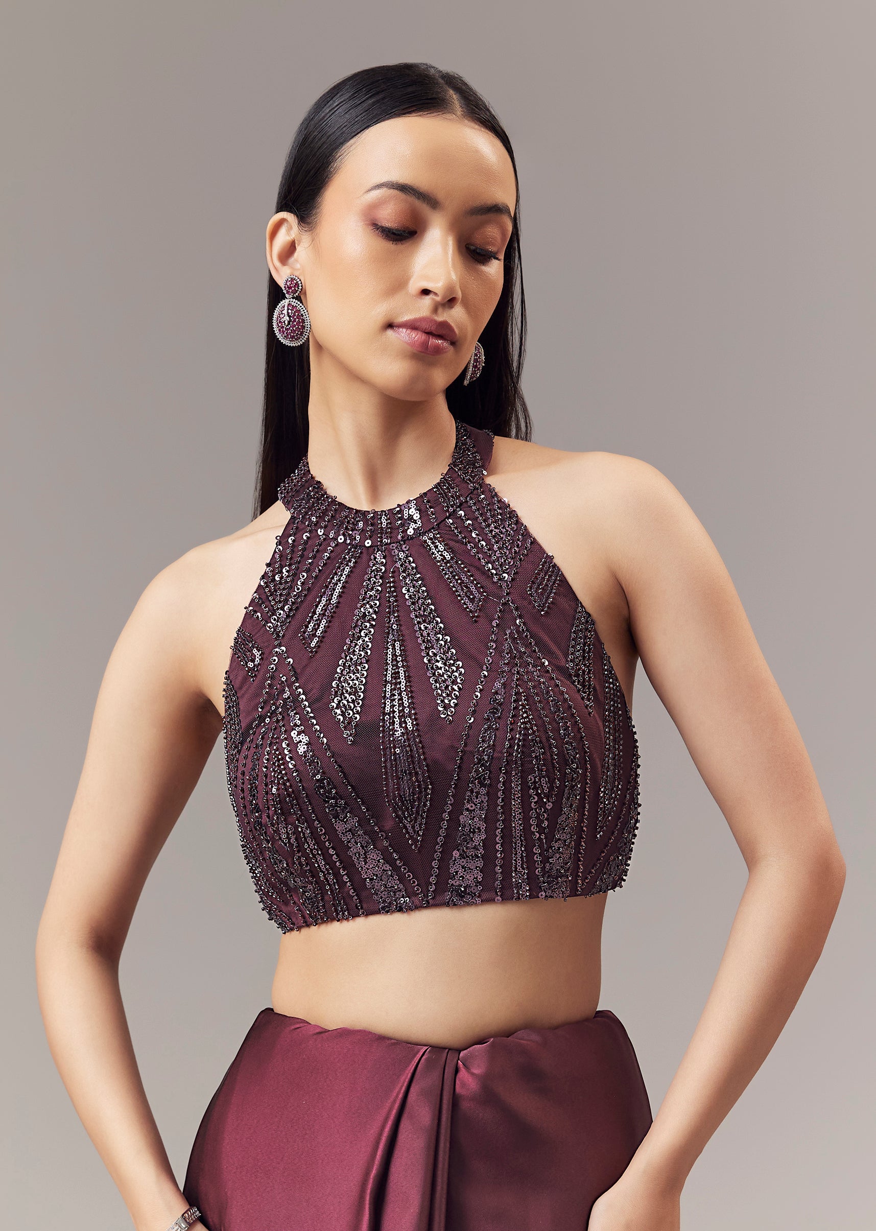 Style it with statement earrings and sleek heels to highlight the embellished halter neckline and deep wine tone.