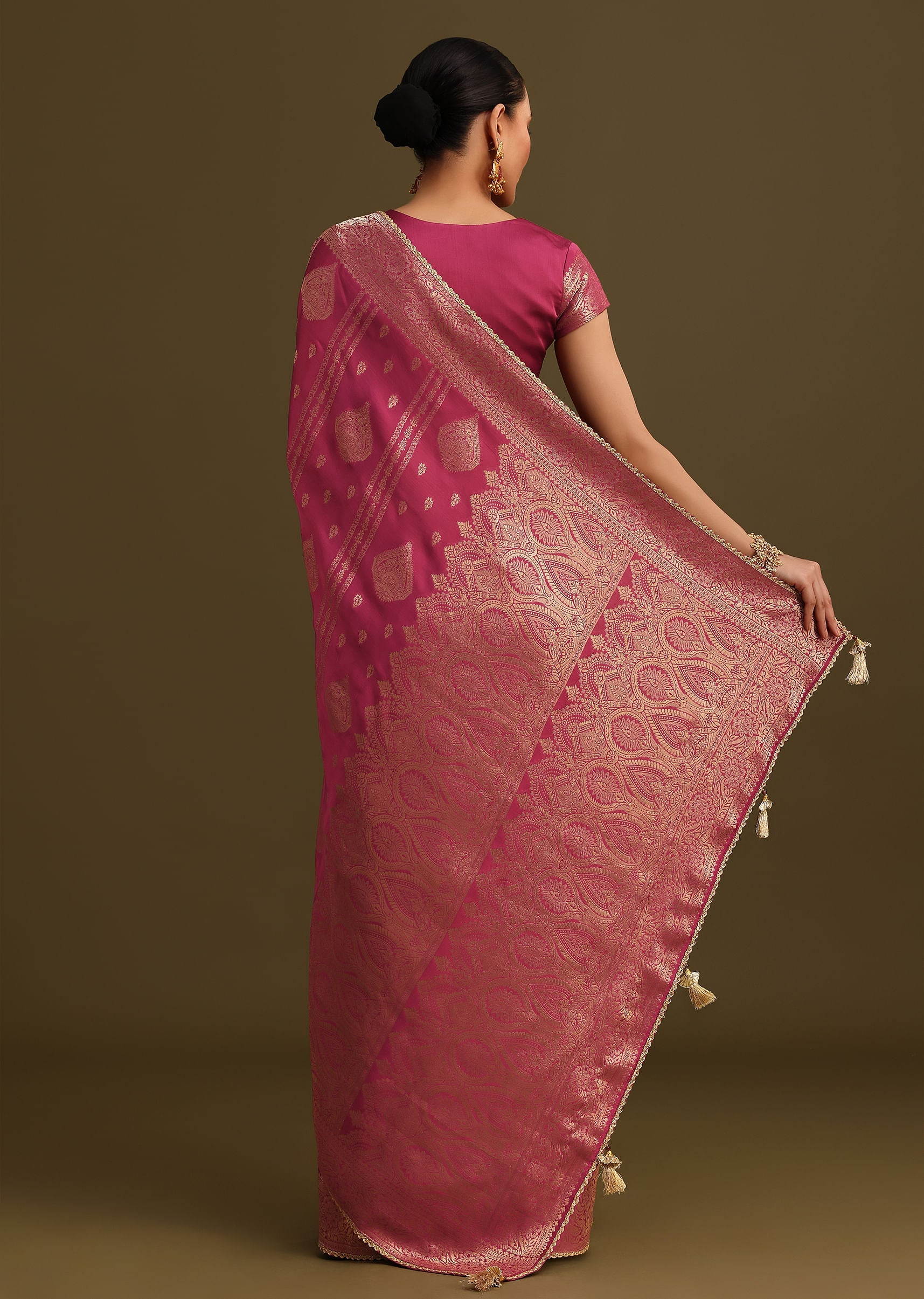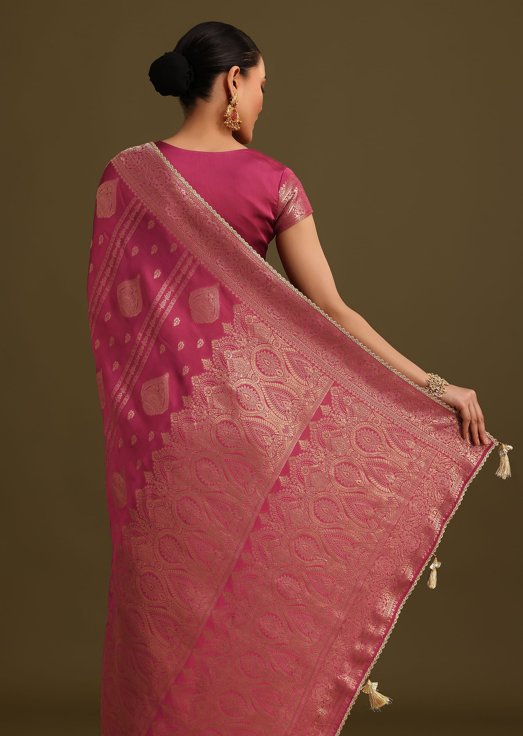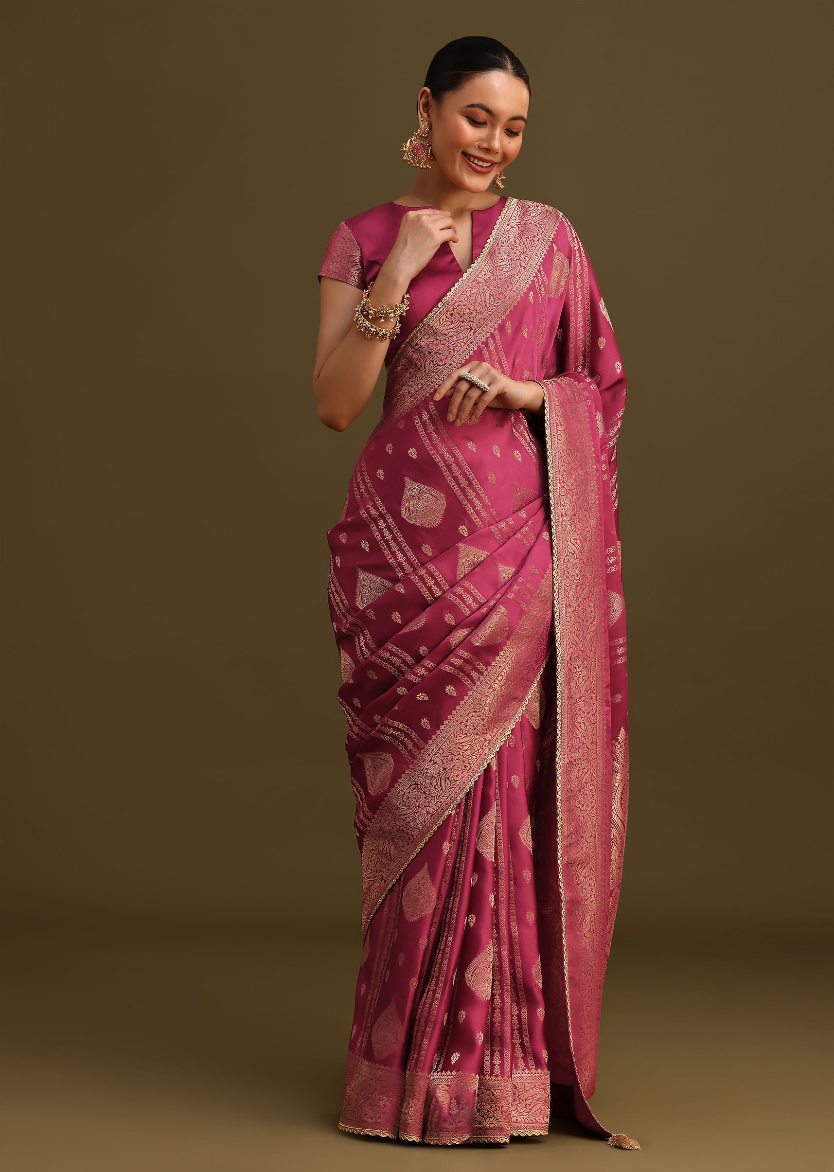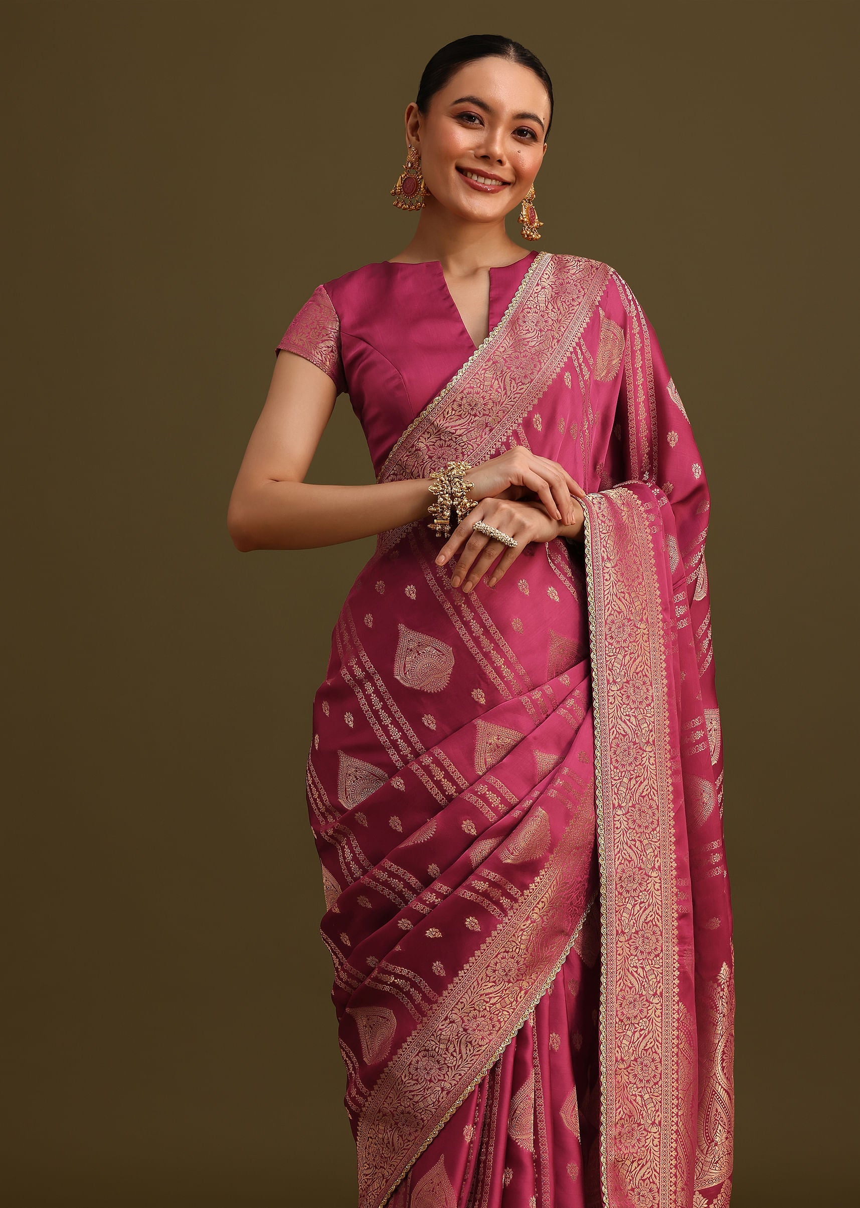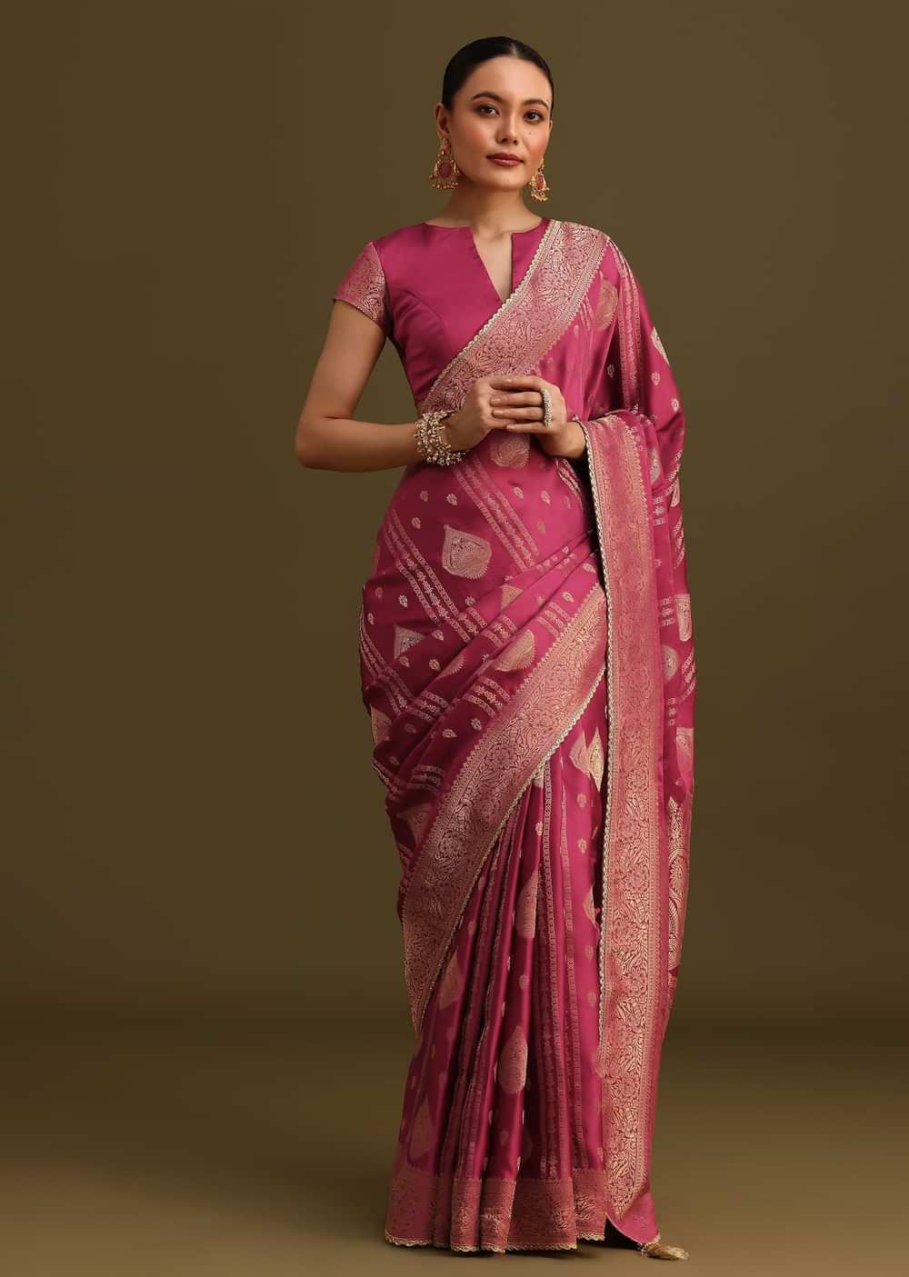 The deep wine hue, with intricate zari weave, reminiscent of the finest vintage, drapes gracefully over your frame. Unstitched, it allows you to customize the blouse to your liking. This festive look is perfect for celebrating life's special moments. It's a perfect blend of tradition and modernity, a testament to the enduring beauty of Indian craftsmanship. Awarded As The Most Trusted Brand We'Re Delivering Styles You Love Just As Promised.