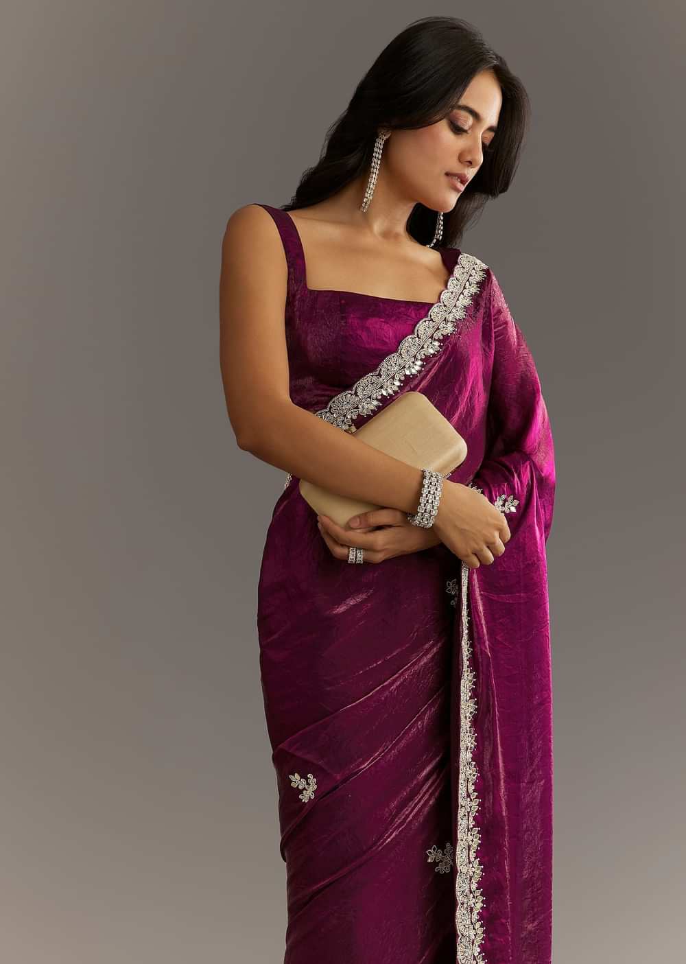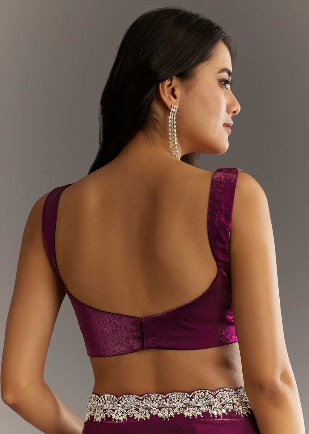 A winetinted enchantment this satin saree glows with zardosi gotapatti and stonecutdana—a tapestry for the bold and beautiful.Awarded as the Most Trusted Brand we're delivering styles you love just as promised.