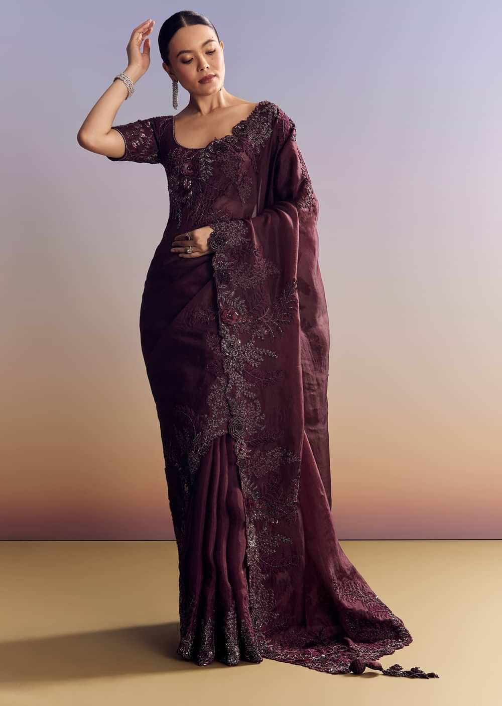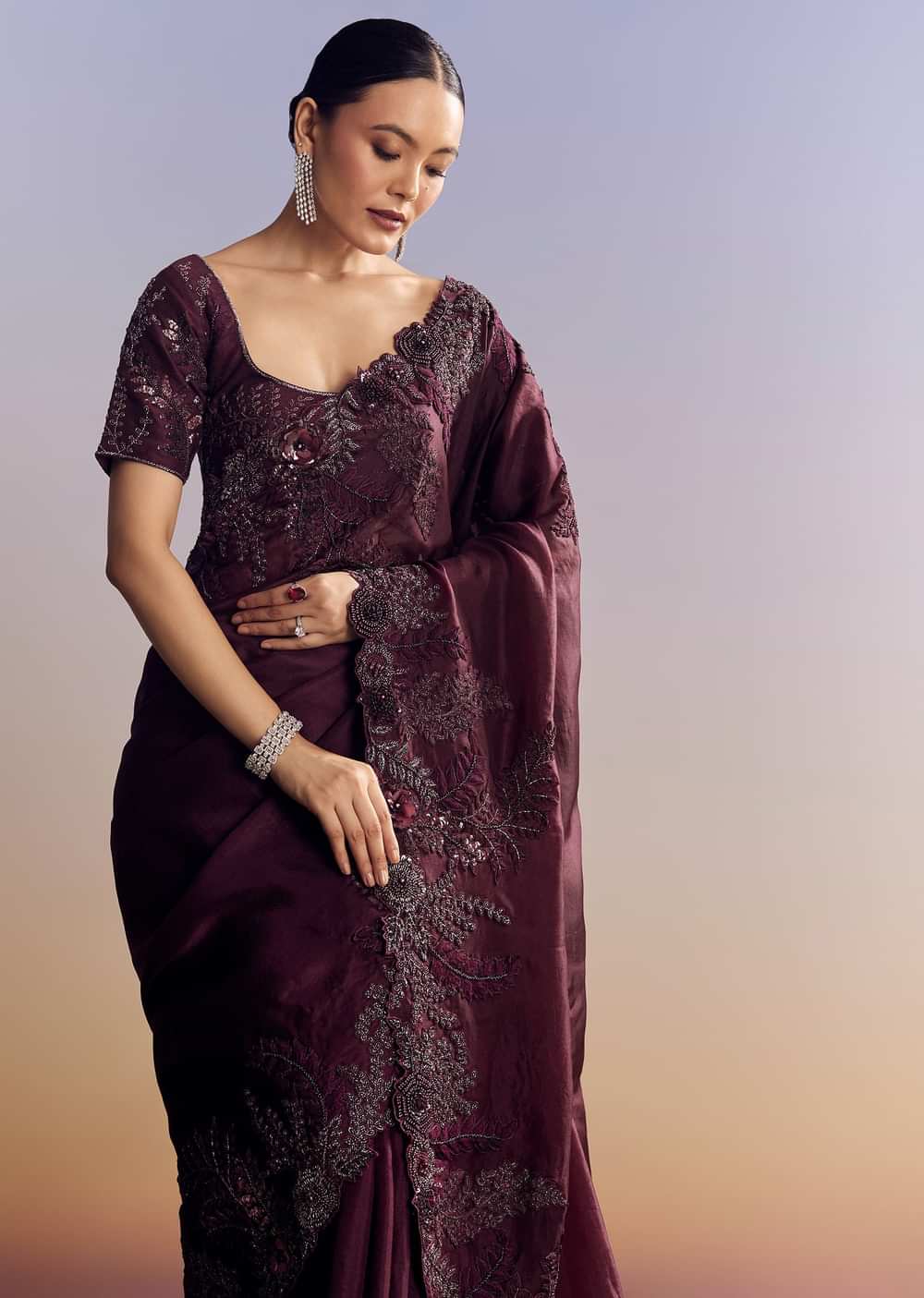 A deep wine-colored satin saree adorned with dense floral embroidery using cutdana, sequins, and beads. Comes with an unstitched blouse. Ideal for Parties, Sangeet, and Engagement occasions. Awarded as the Most Trusted Brand, we're delivering styles you love, just as promised.