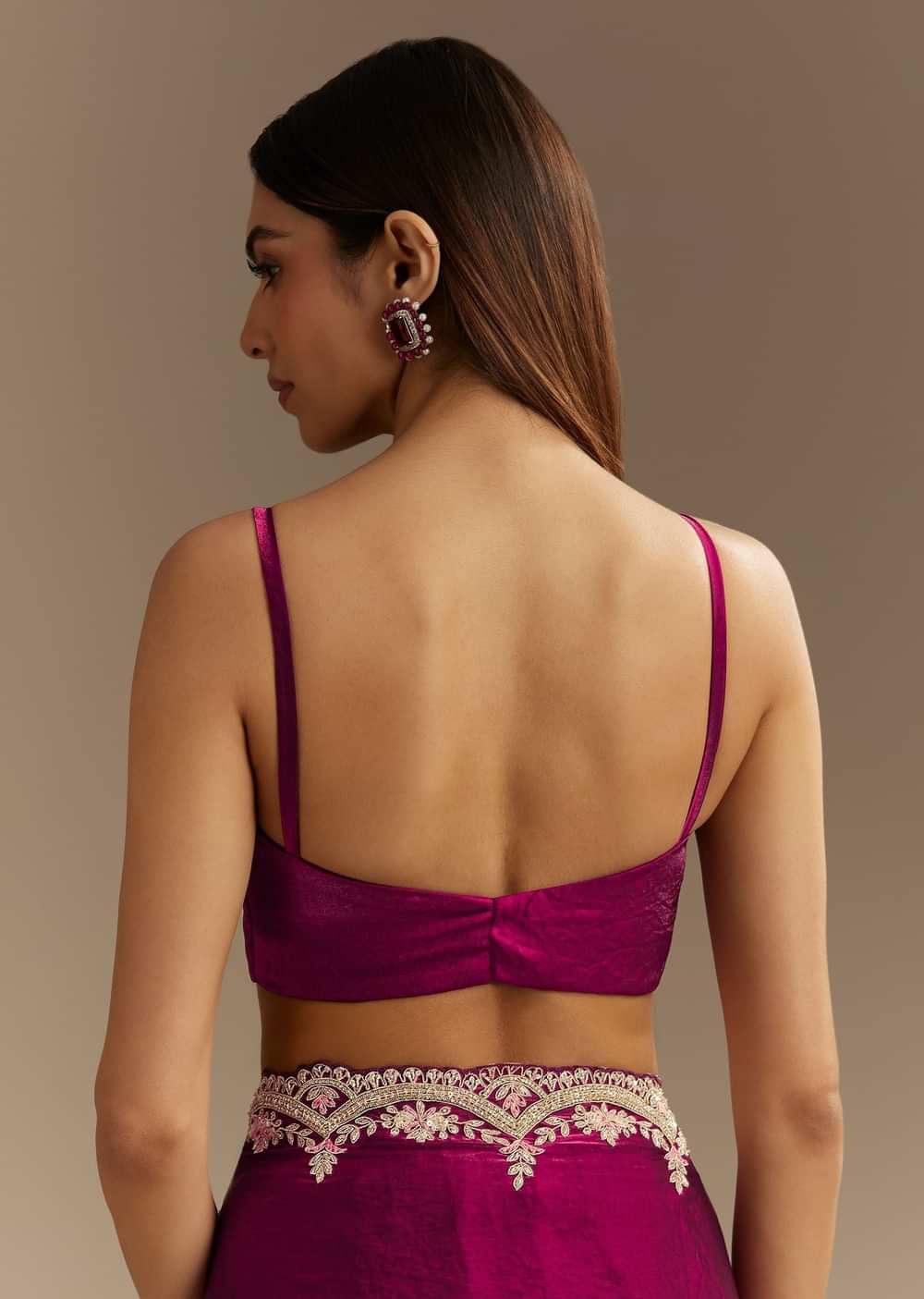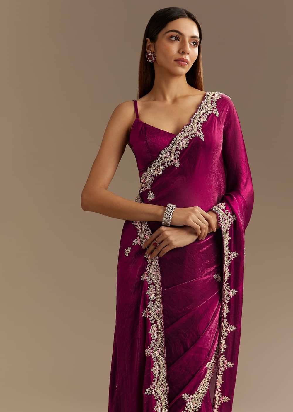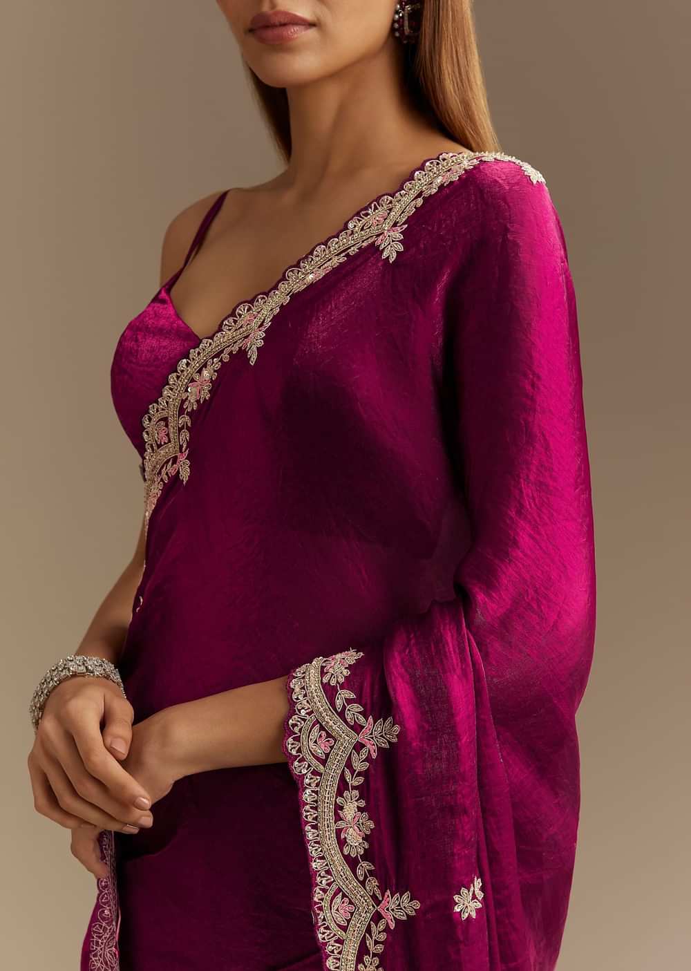 Drape Yourself In Refined Elegance With This Wine Satin Saree Adorned With Intricate Zardosi Cutdana And Sequins Embroidery. The Smooth Satin Fabric Flows Effortlessly Enhancing Its Luxurious Appeal While The Scallop Border Adds A Touch Of Grandeur. The Rich Wine Hue Exudes Regal Charm Making It A Perfect Choice For Evening Celebrations And Festive Gatherings. A Statement Of Timeless Beauty This Saree Is Designed To Captivate With Every Drape.Awarded As The Most Trusted Brand We'Re Delivering Styles You Love Just As Promised.