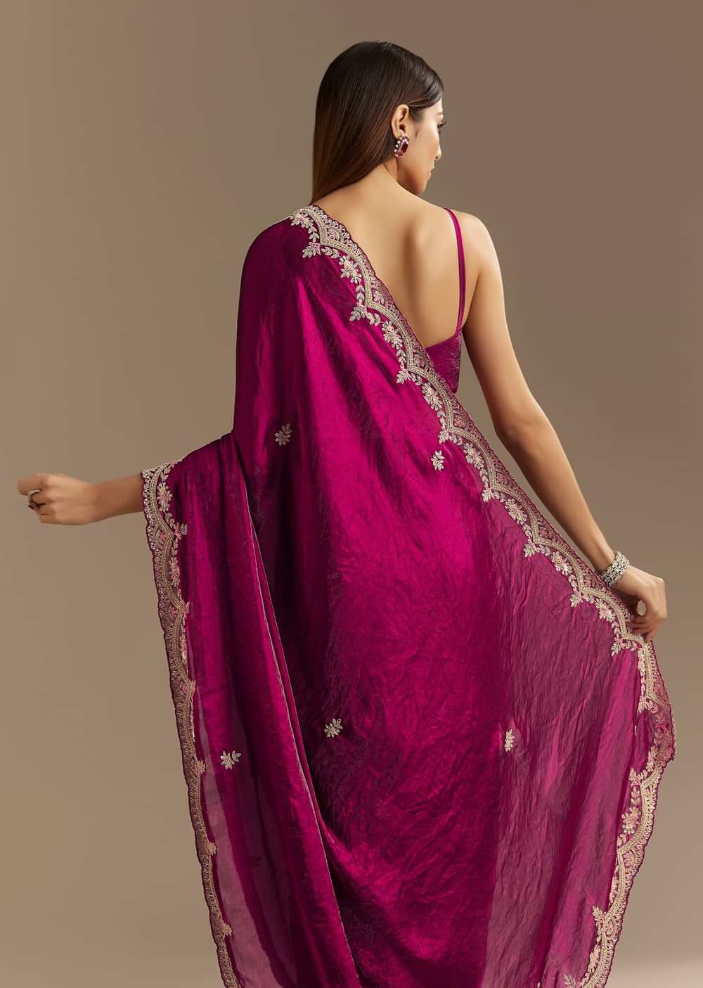 Wine Satin Sequins Saree With Zardosi Cutdana Embroidery And Scallop Border