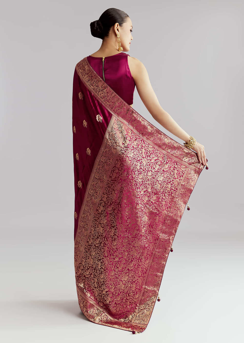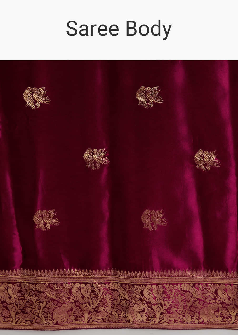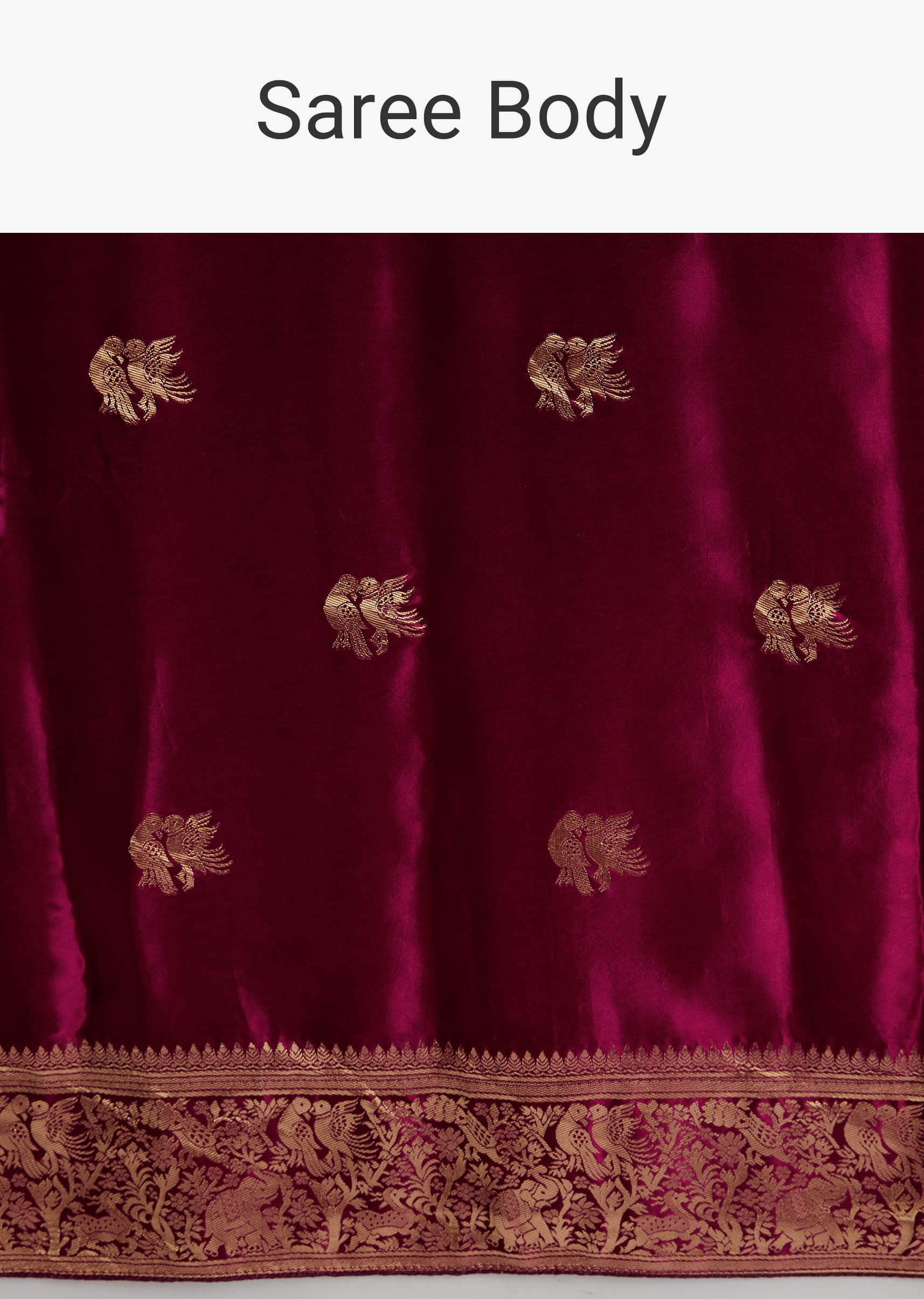 Wine Satin Silk Woven Saree With Heavy Zari Embroidery
