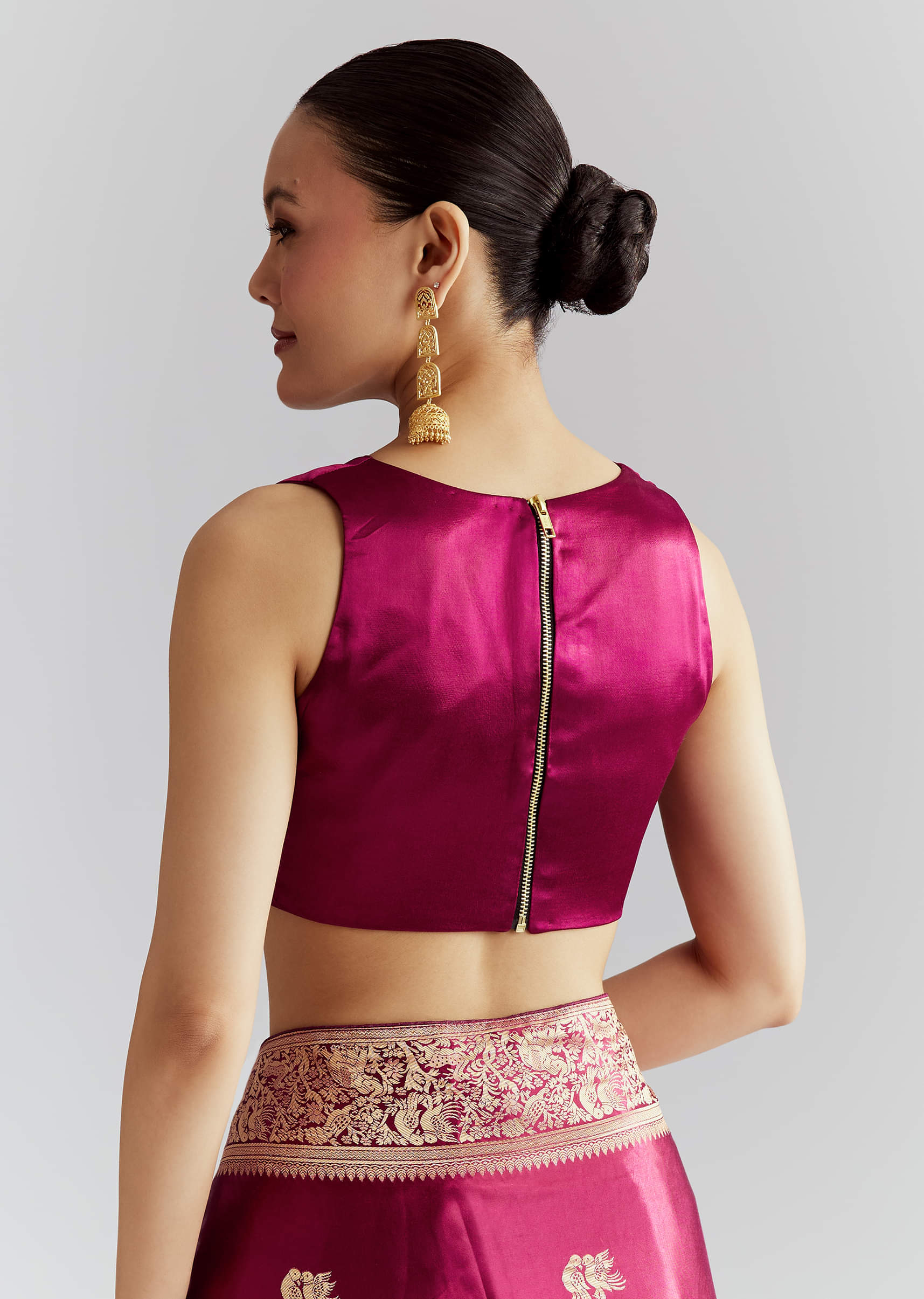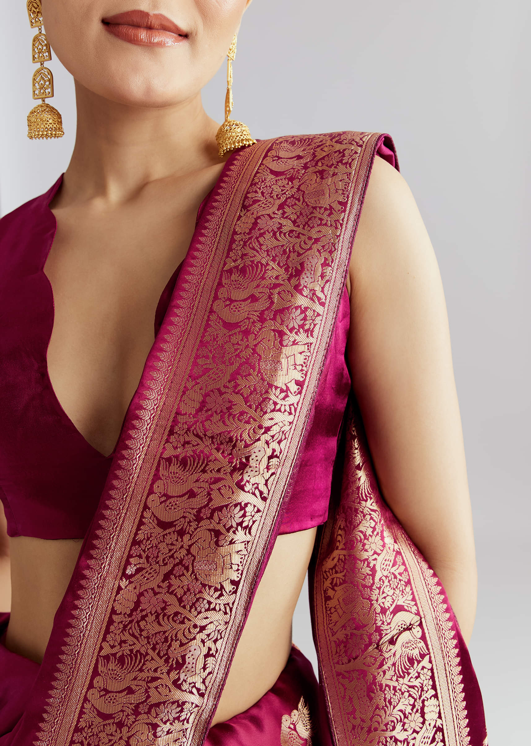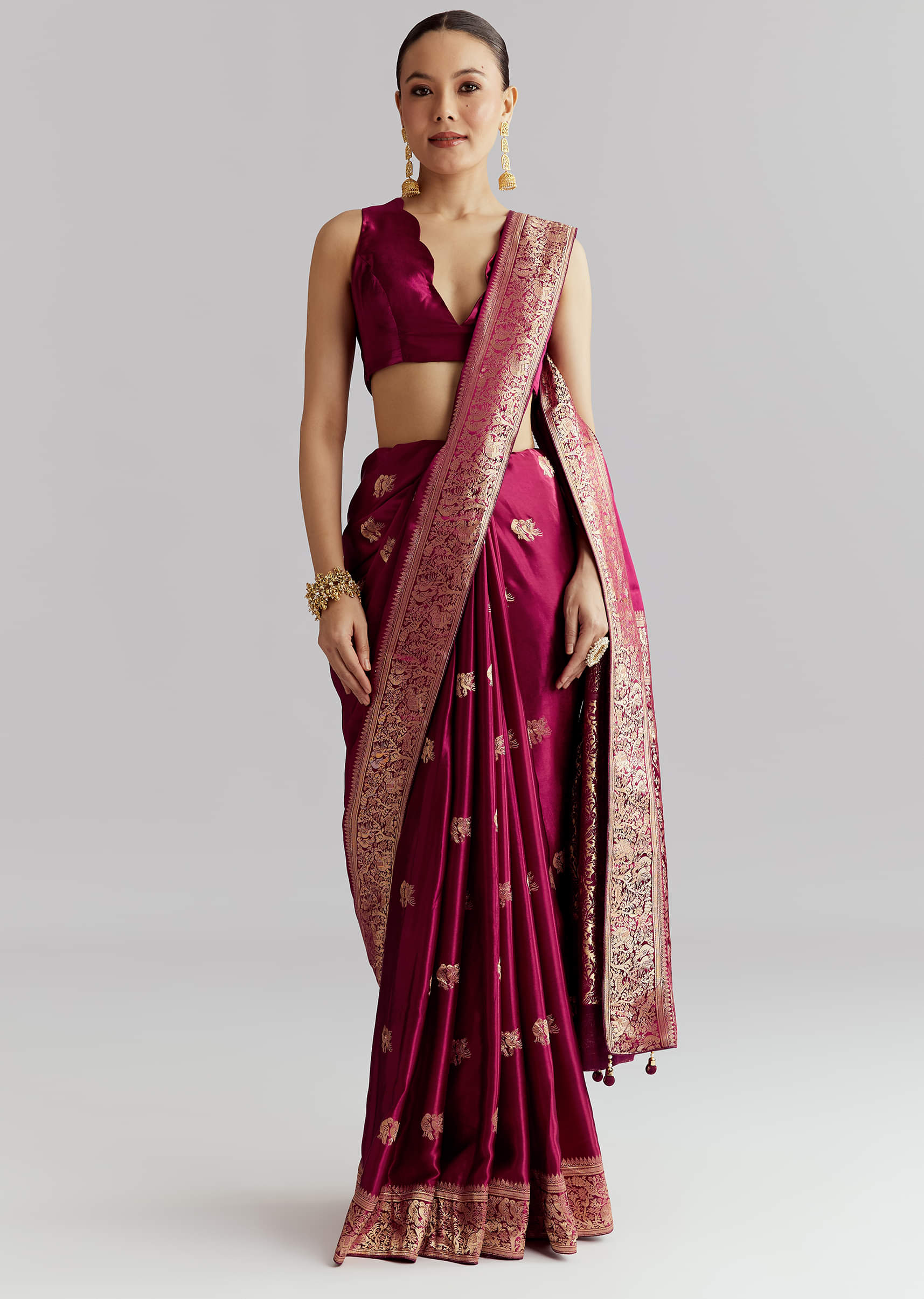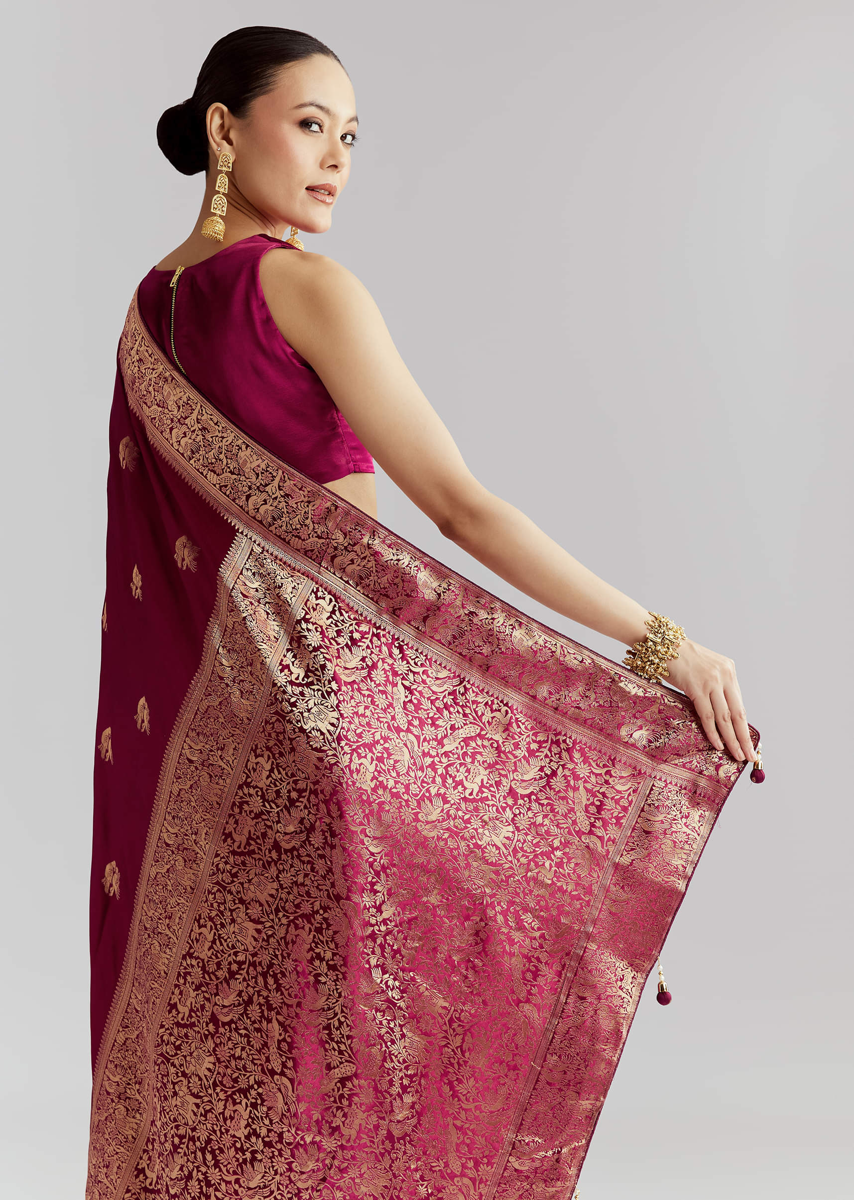 Wine Satin Silk Woven Saree With Heavy Zari Embroidery