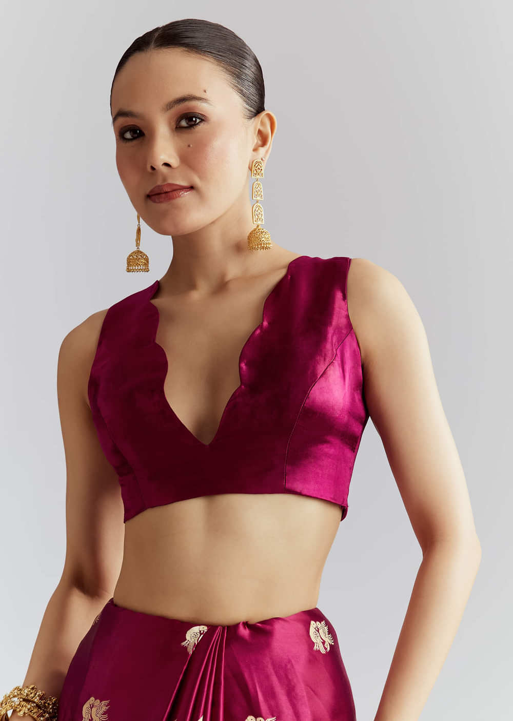 Fit Tips:The blouse should feel fitted and smooth, while the satin pleats hold their fall and the pallu glides without fuss.