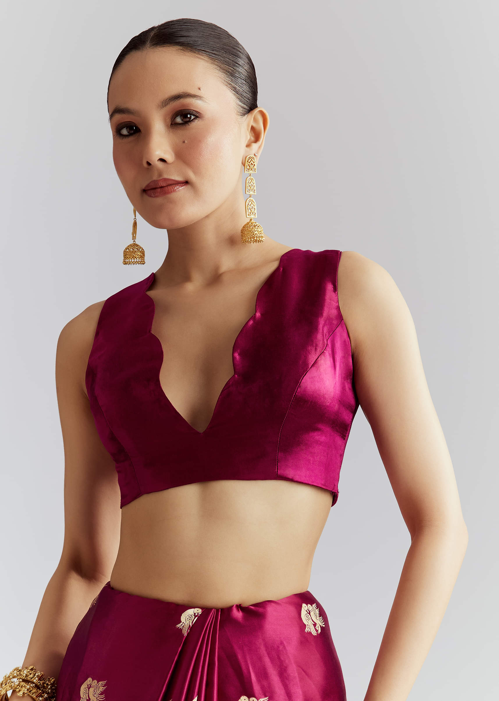 Evening by design, this wine satin silk woven saree pairs a plush sheen with heavy zari butti and borders where bird motifs glide across the drape. The detail reads intricate... More Product Details