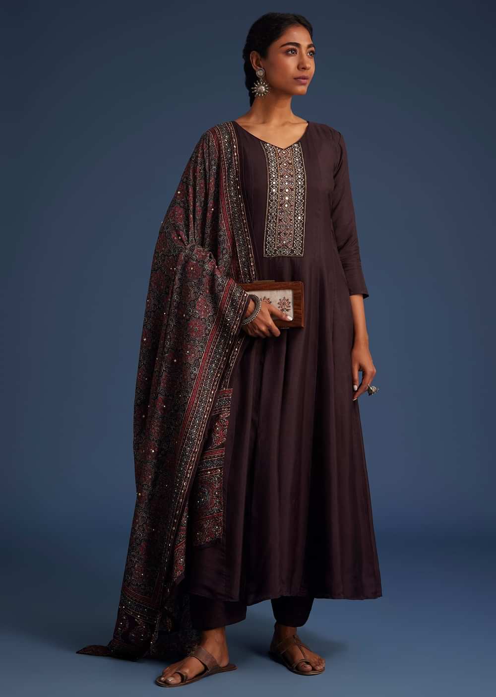 Wine Silk Anarkali Set With Ajrakh Print Dupatta
