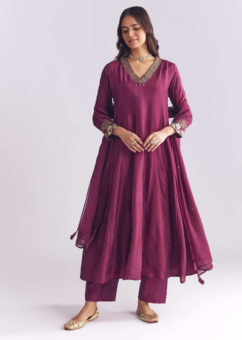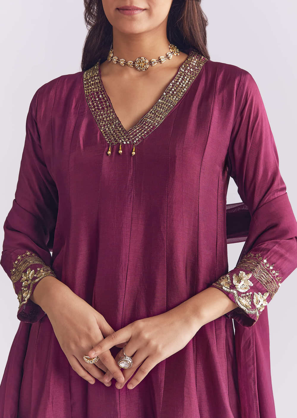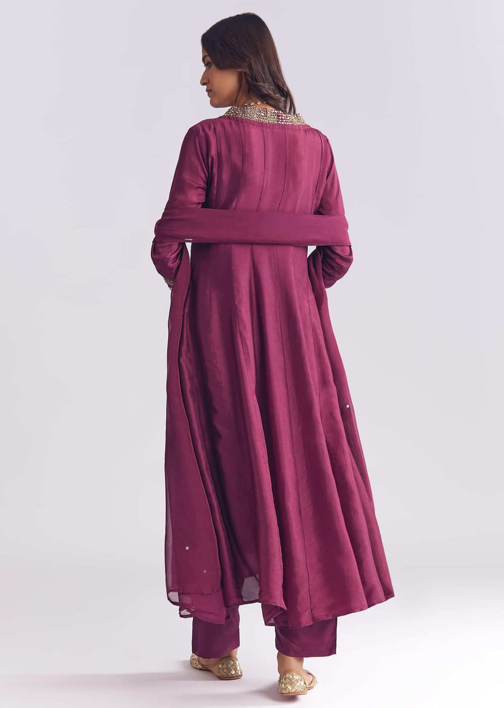 Wine Silk Anarkali Suit With Sequins And Cutdana Work
