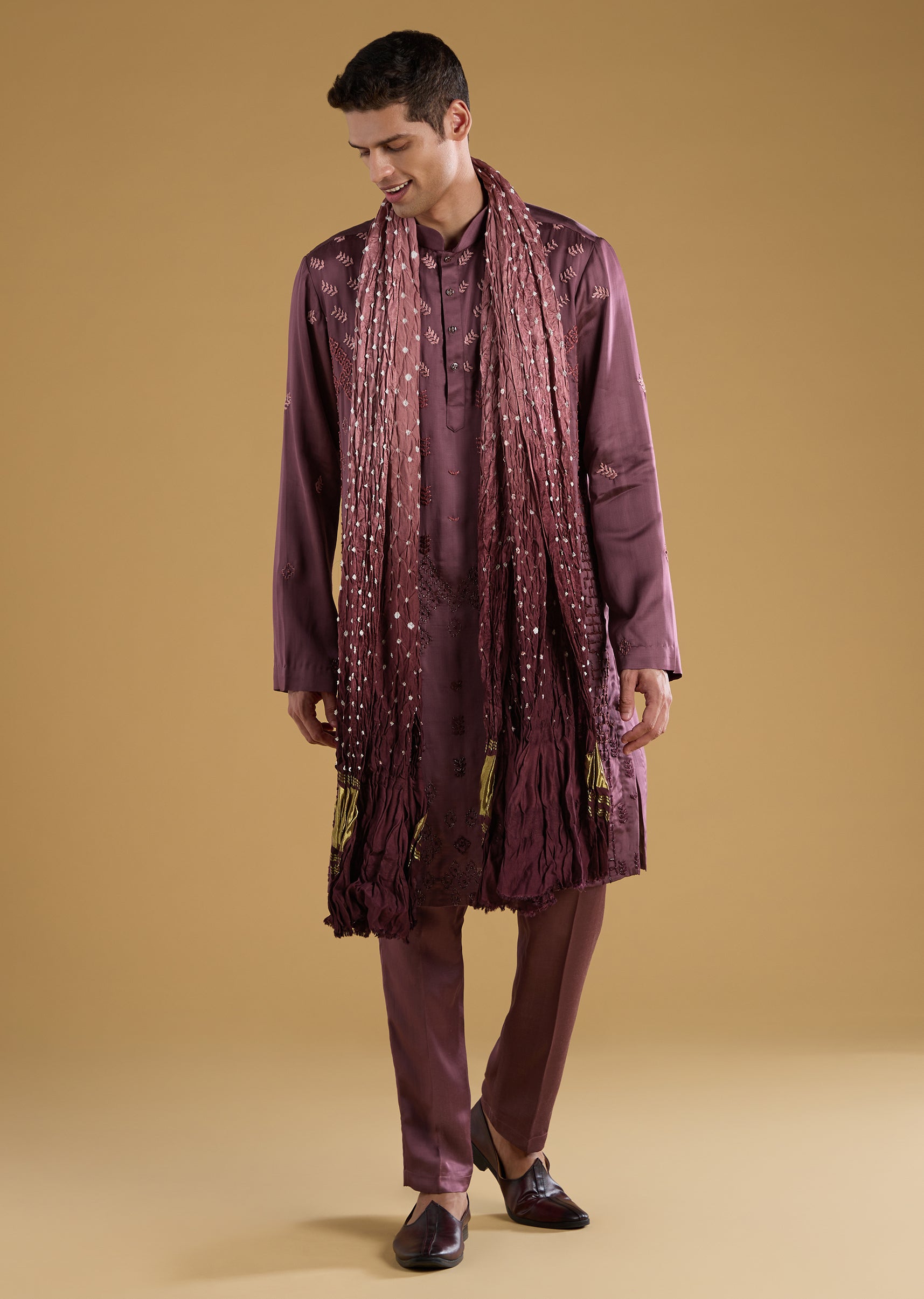 Wine Silk Embroidered Kurta Set with Dupatta