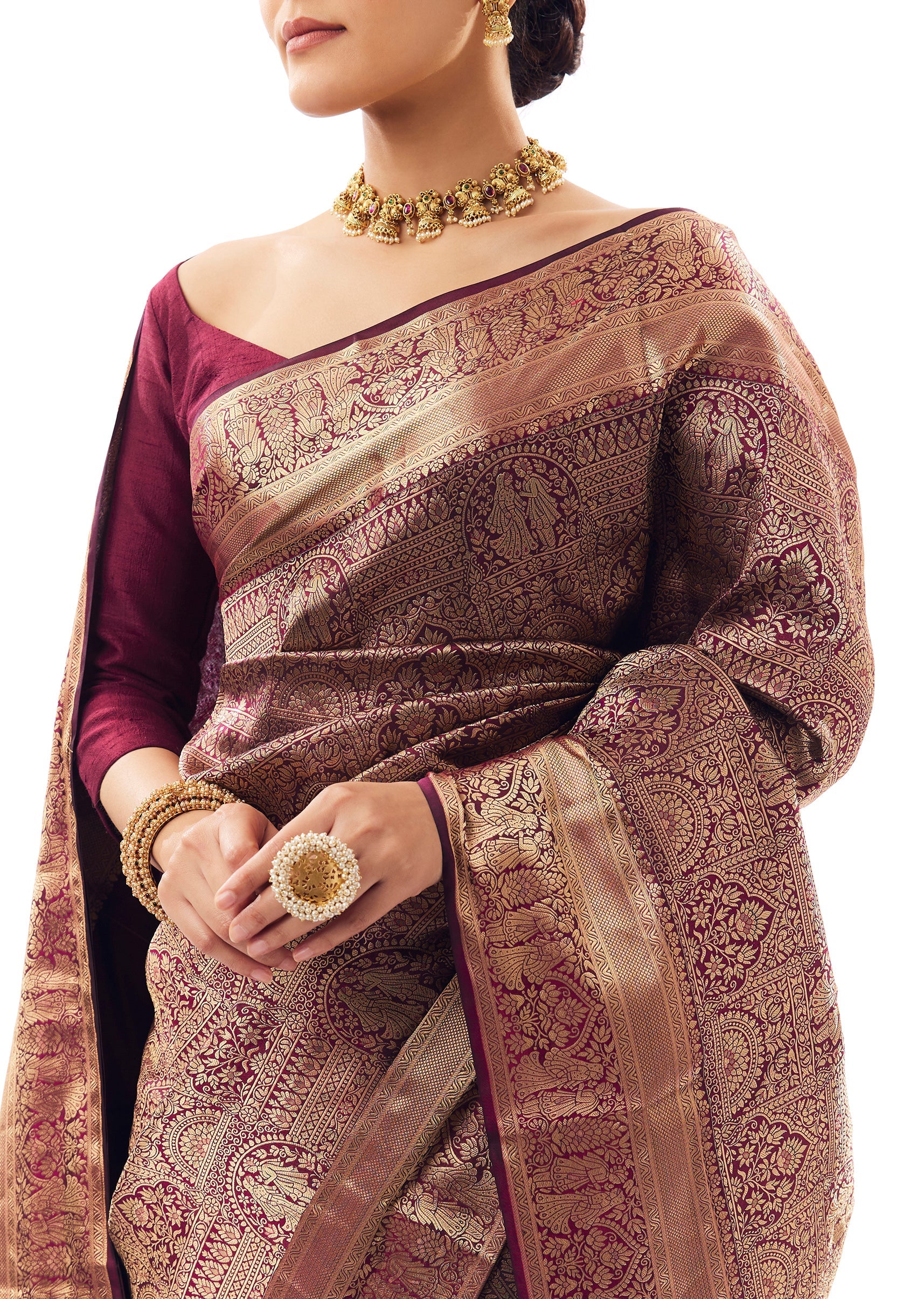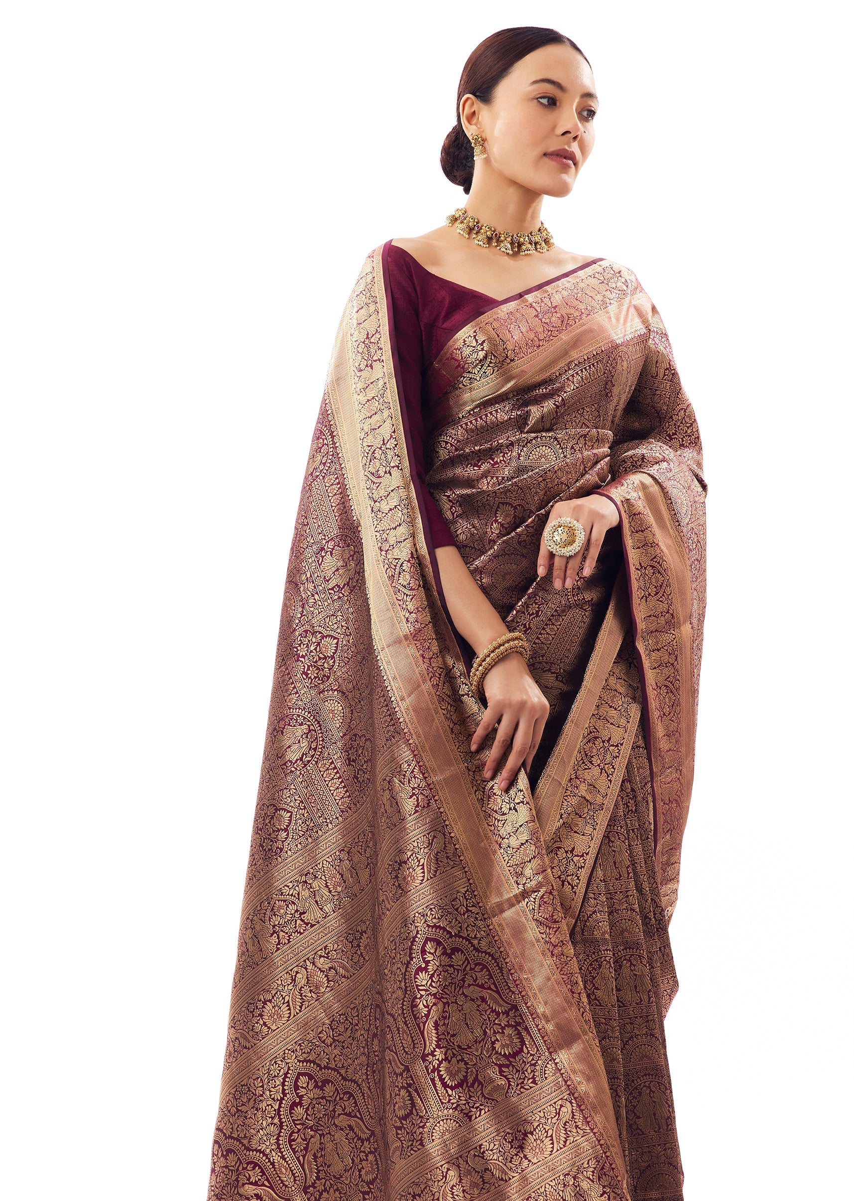 A true wedding-occasion saree—this wine tissue silk piece features kanjivaram-style weaving and traditional bride & groom motifs for that heritage feel. The broad border adds grandeur, making it a stunning... More Product Details