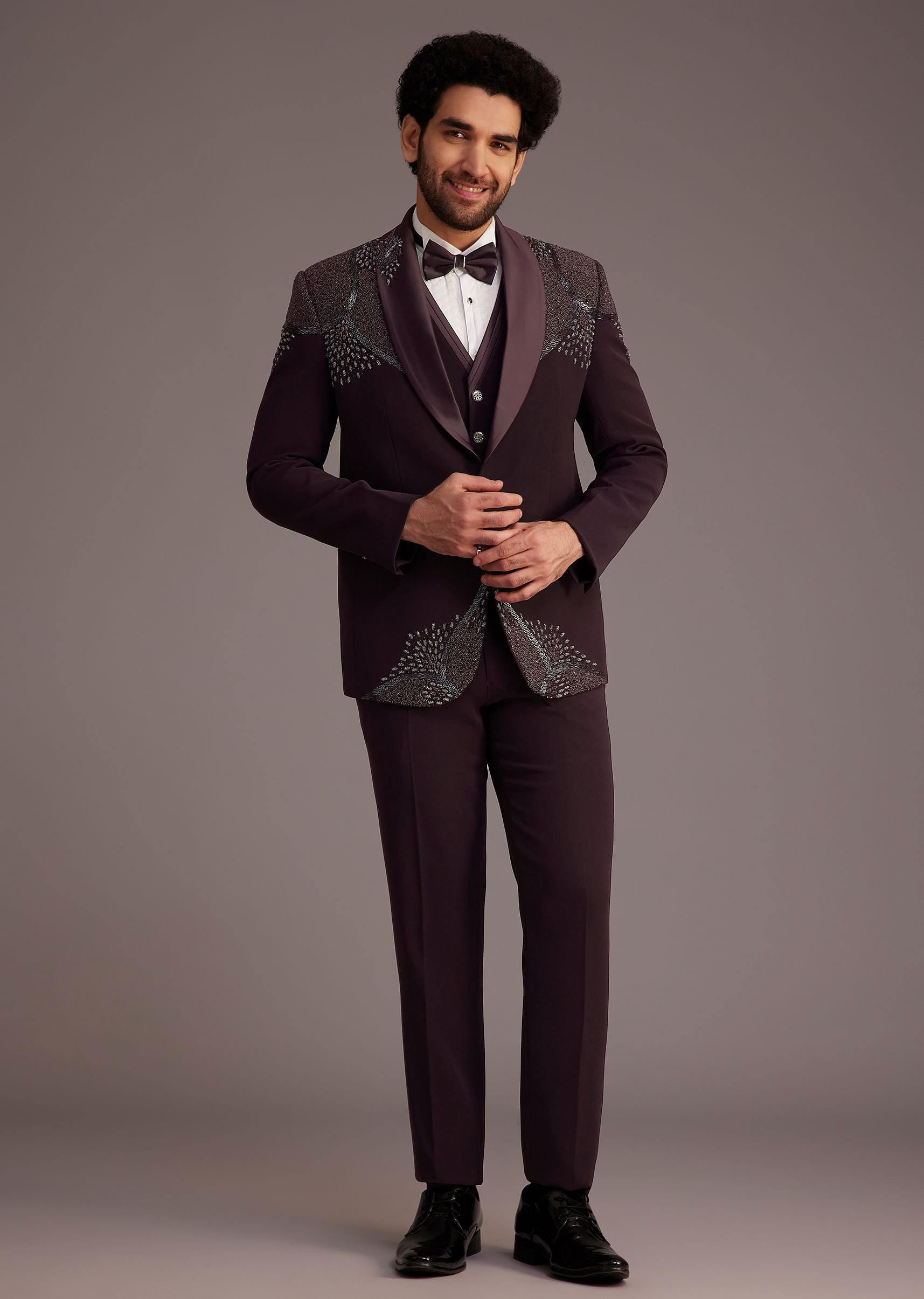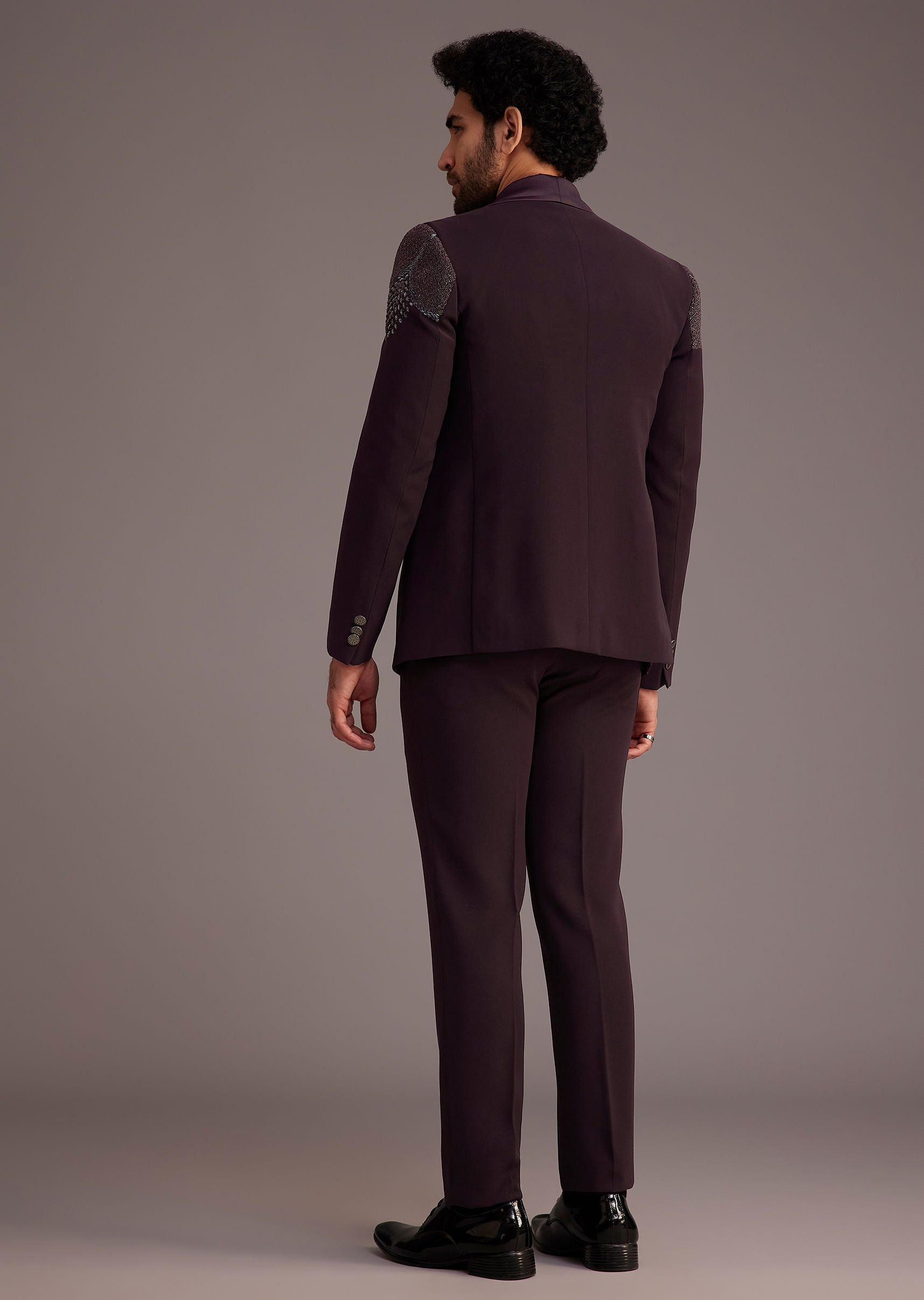 Wine Tuxedo With Beaded Detailing And Satin Peak Lapel