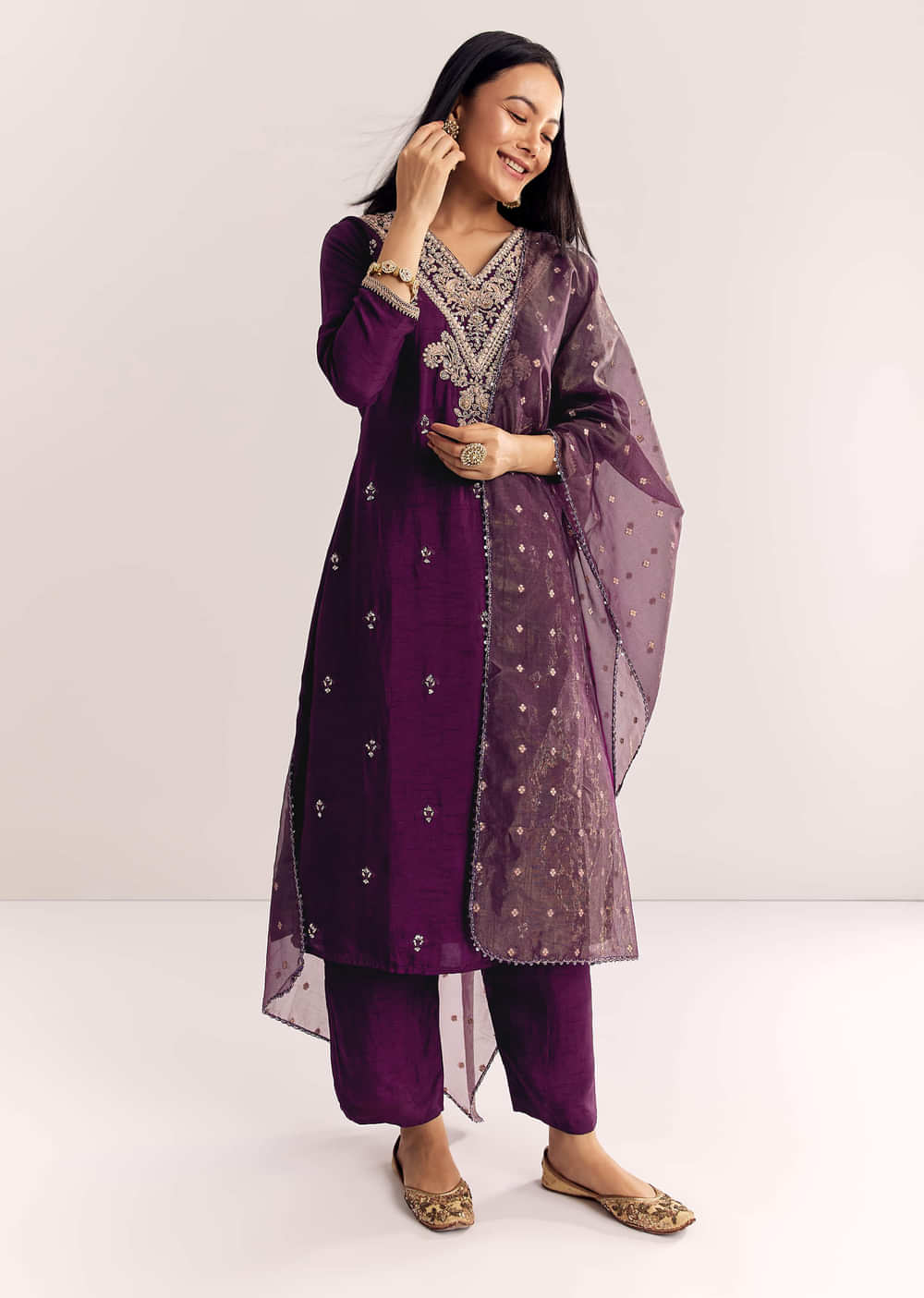 A deep wine Dola silk kurta featuring meticulous zardosi embroidery, styled with a flowy organza drape for refined elegance. Made for twilight soirées under starlit skies. Kurta sleeves border may... More Product Details