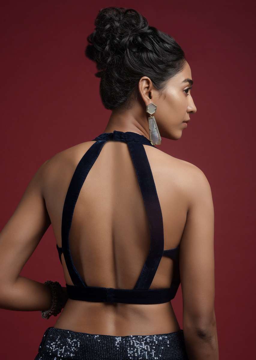 Navy Blue Blouse In Velvet With Halter Straps And Sweetheart Neckline