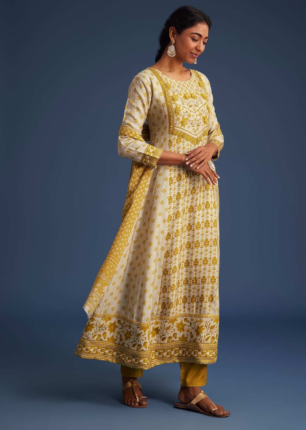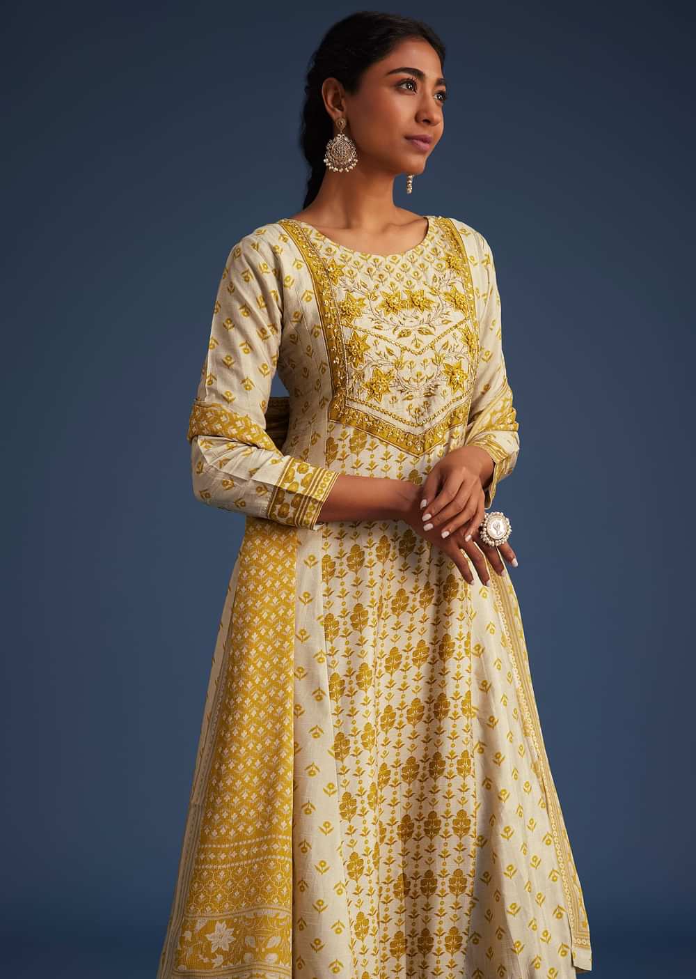 Yellow And Cream Silk Printed Anarkali Set With Chiffon Dupatta