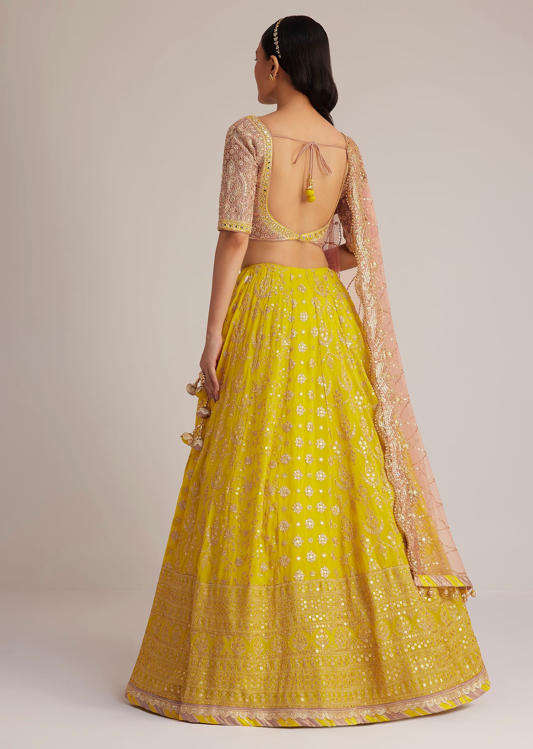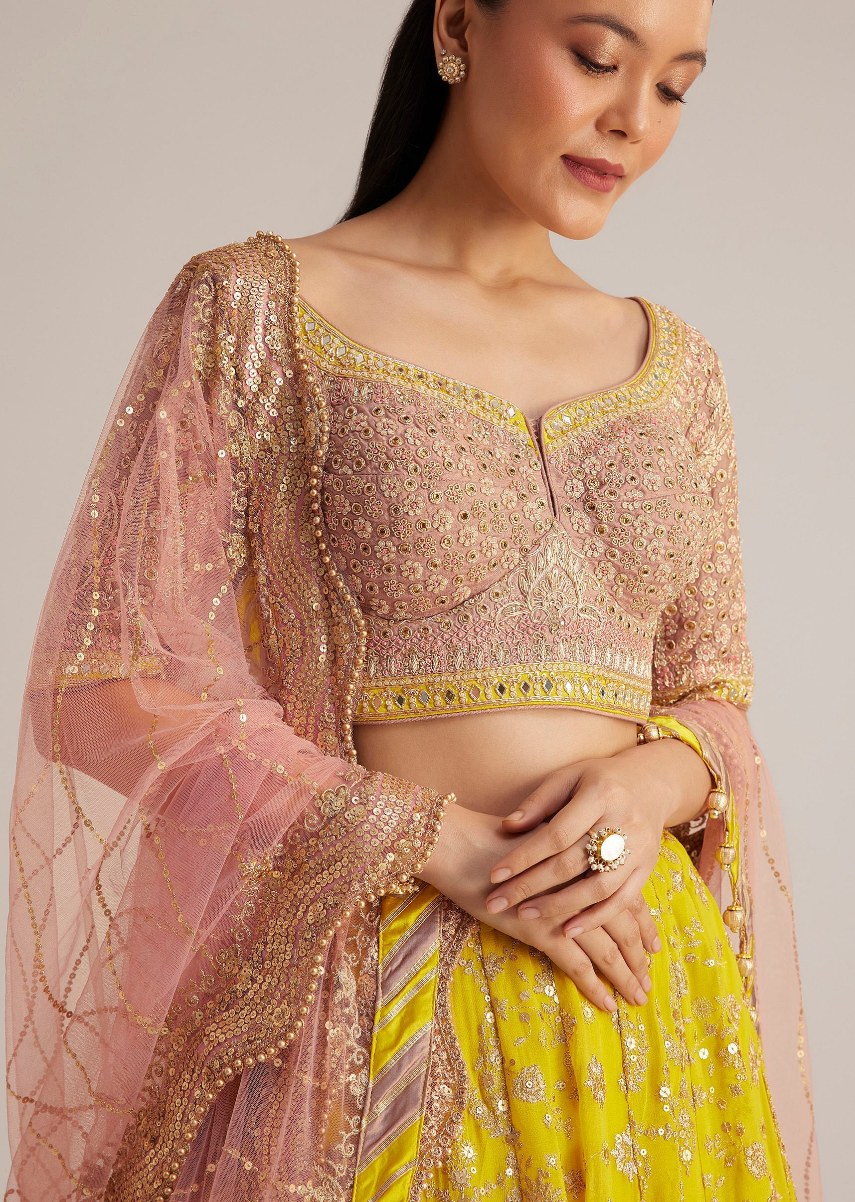 Step Into Regal Elegance With This Stunning Yellow Lehenga Set Paired With A Mauve Embroidered Blouse And A Soft Net Dupatta Adorned With Delicate Sequin Work. Perfect For Sangeet Haldi Ceremonies Or Festive Celebrations This Outfit Combines Vibrant Hues With Intricate Detailing To Create A Sophisticated And Striking Look. The Flowy Lehenga Features Ornate Embroidery And A Rich Border While The Blouse Adds Structure And Charm With Its Intricate Embellishments. Awarded as the Most Trusted Brand, we're delivering styles you love, just as promised.