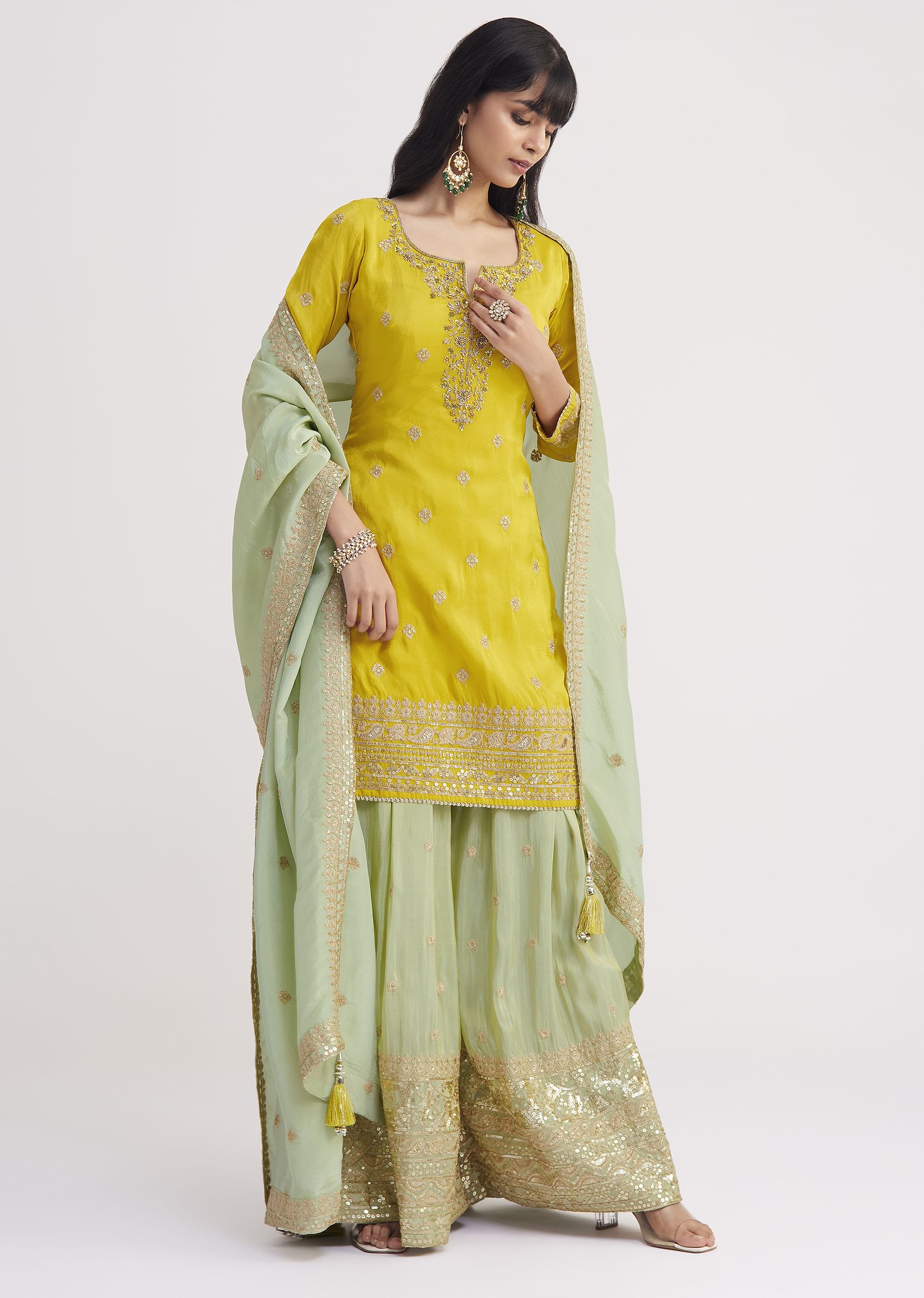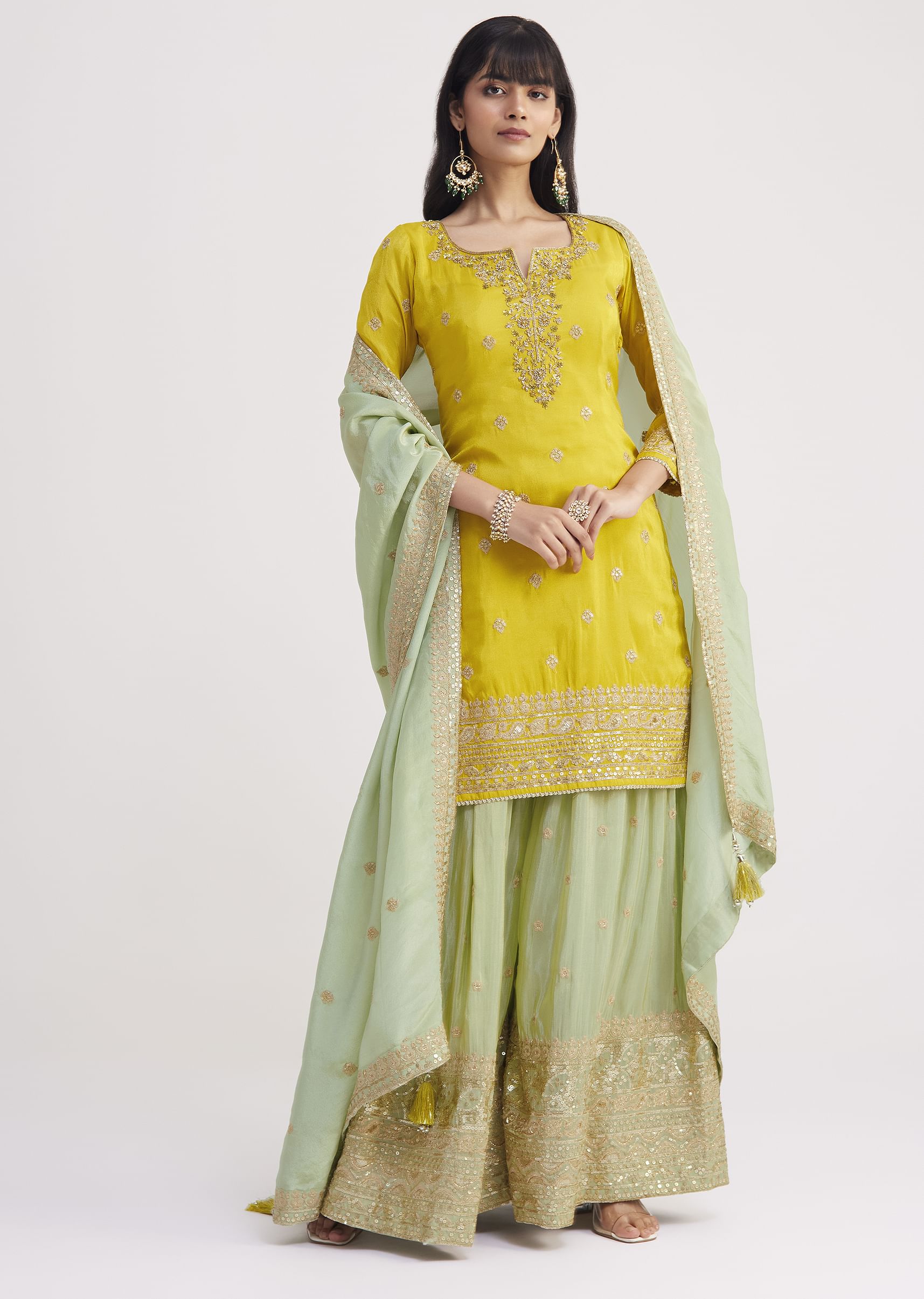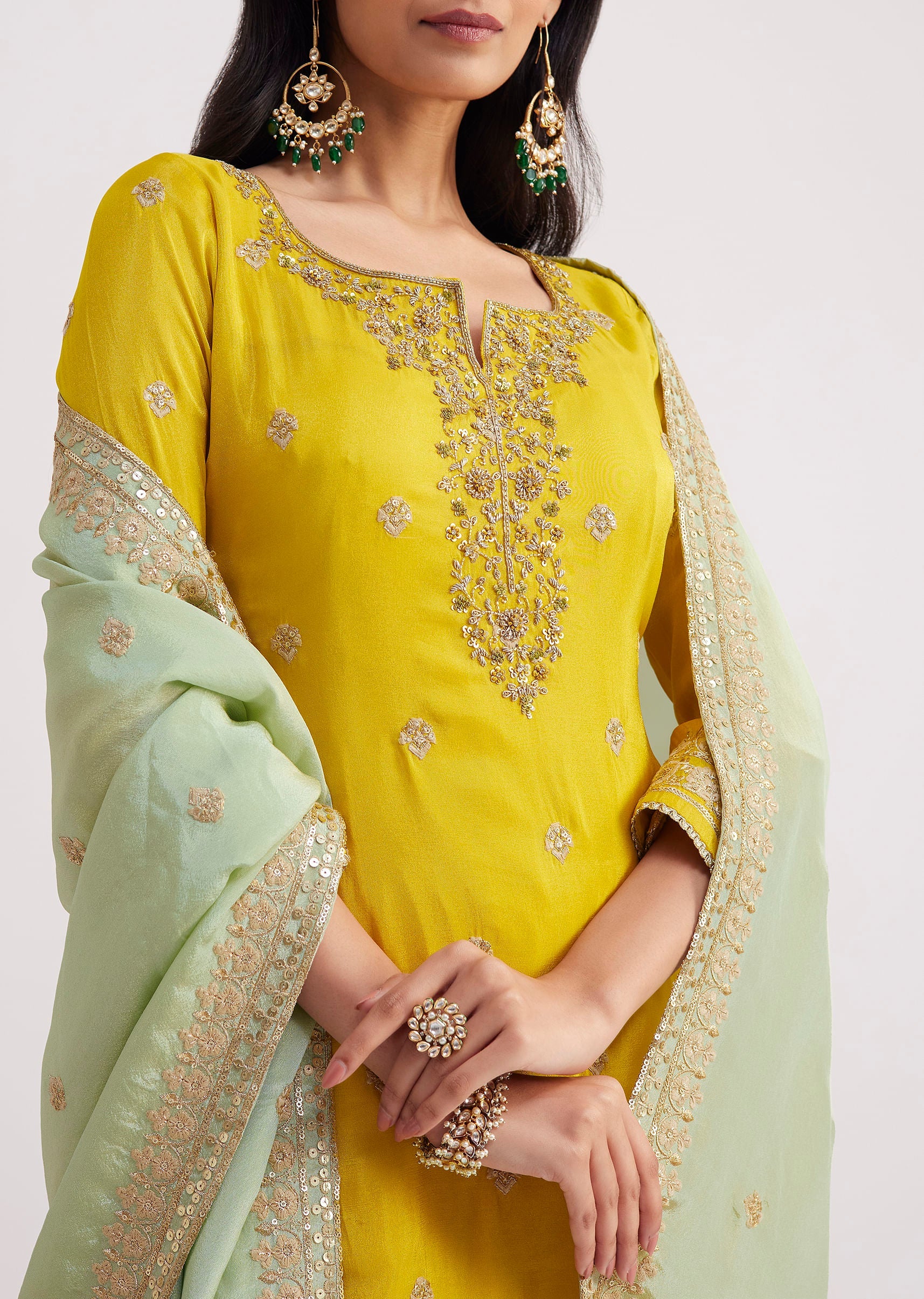 Yellow And Pista Green Tissue Palazzo Suit With Zardosi Work