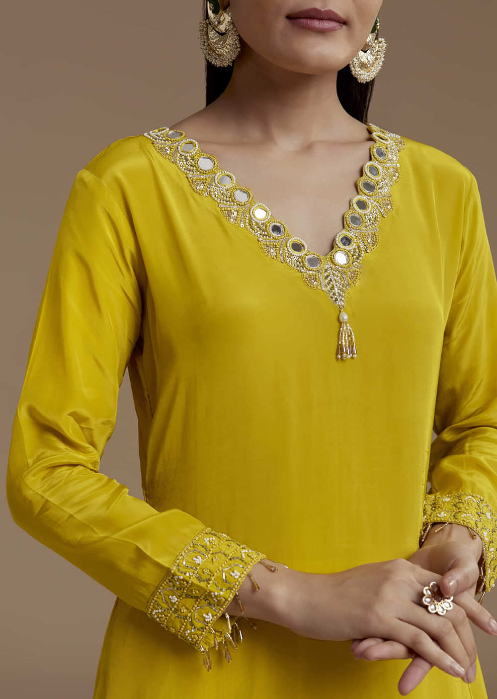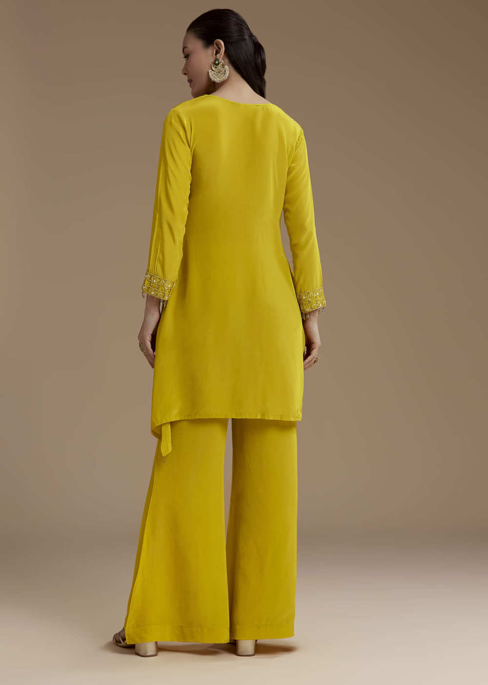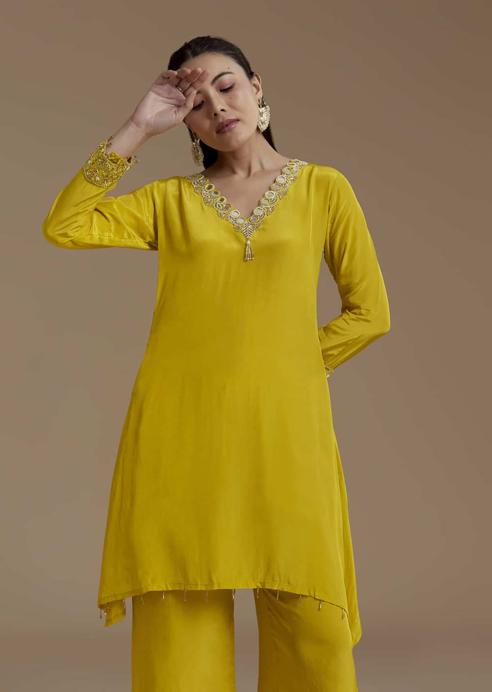 Radiate festive joy in this bright yellow kurta and palazzo set that blends graceful movement with artisanal shimmer. Featuring mirror and moti embellishments, the asymmetric hem adds a playful twist,... More Product Details