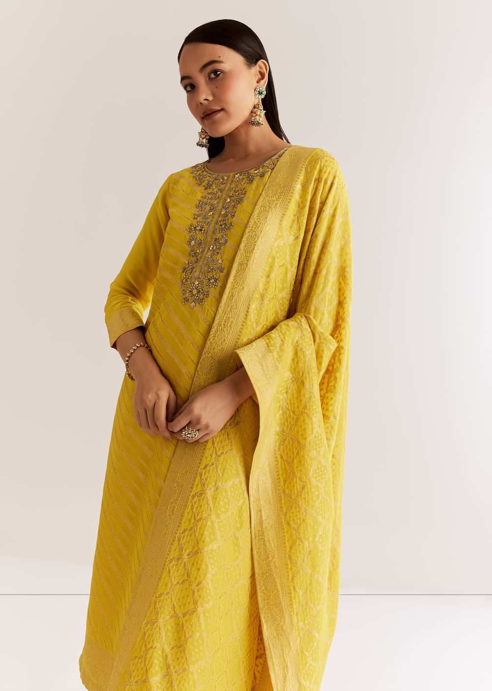 A vibrant yellow georgette banarasi kurta detailed with zardosi and cutdana work on the neckline. Comes with a luxurious dupatta that completes the rich festive appeal. Awarded as the Most... More Product Details