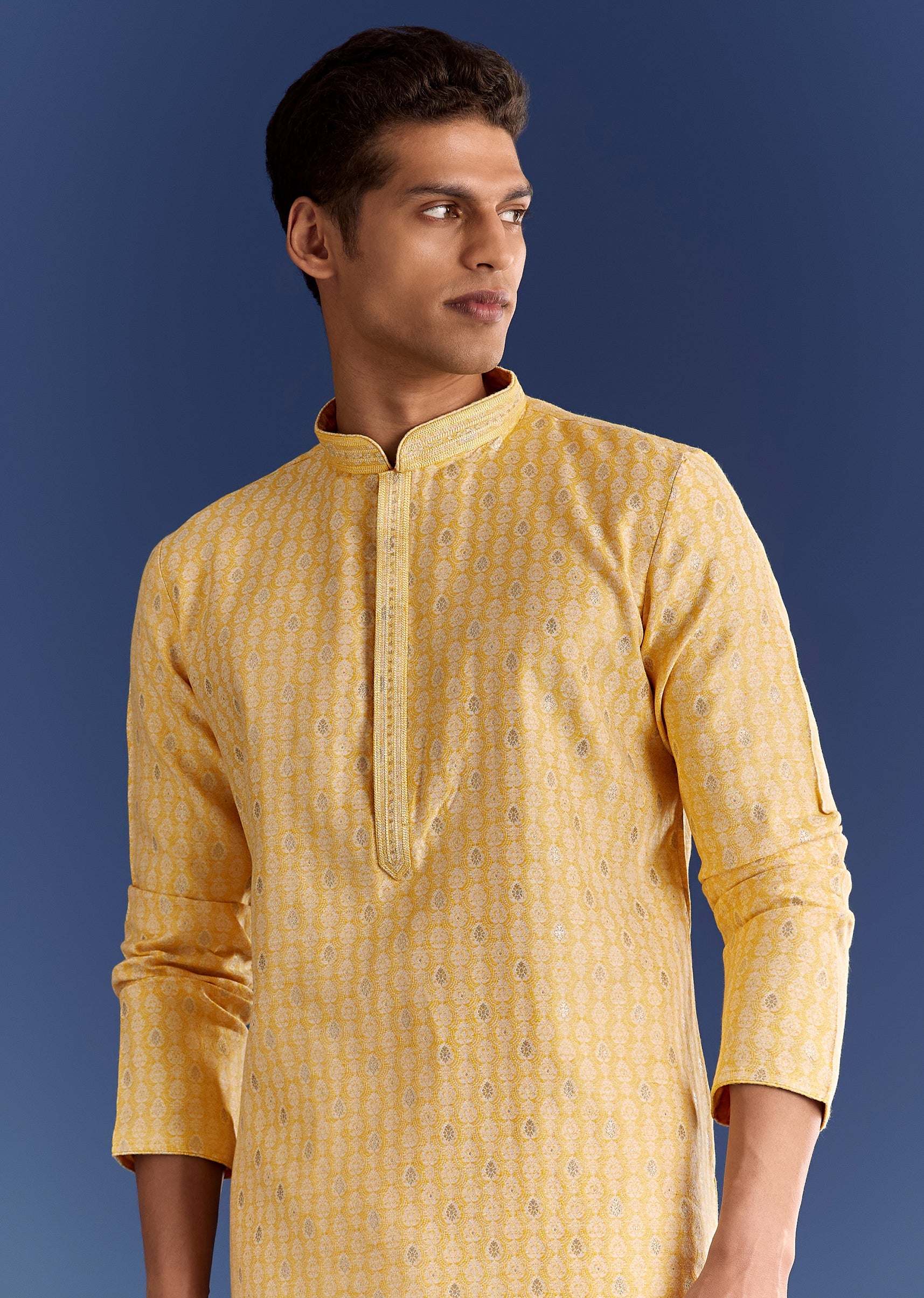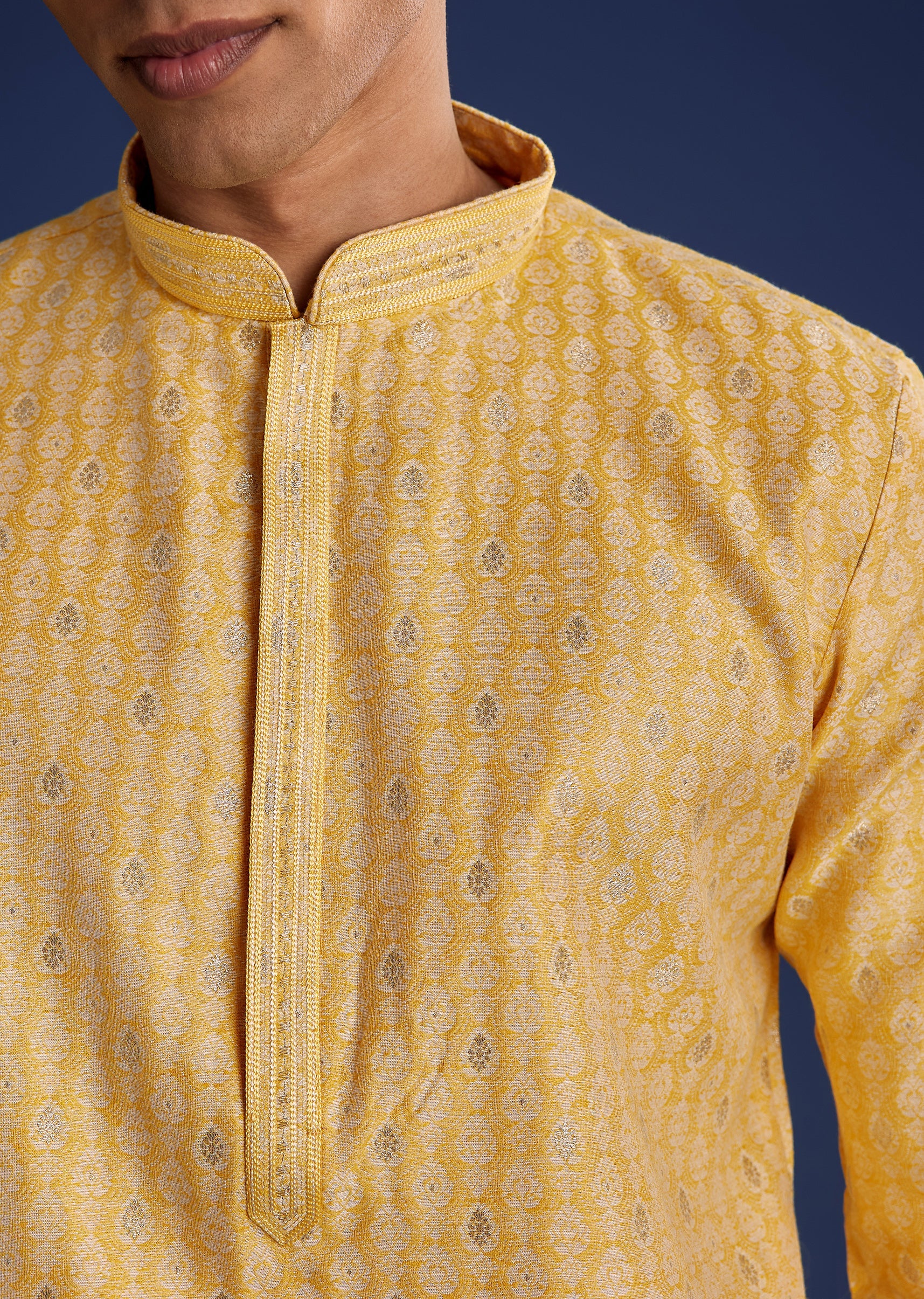 Bright and breezy, this mustard yellow jacquard kurta set is detailed with classic motifs for pooja-perfect dressing. Awarded as the Most Trusted Brand, we're delivering styles you love, just as... More Product Details