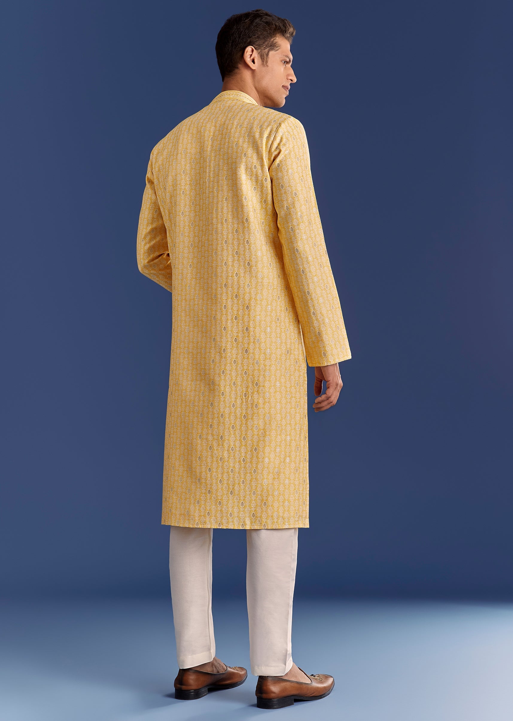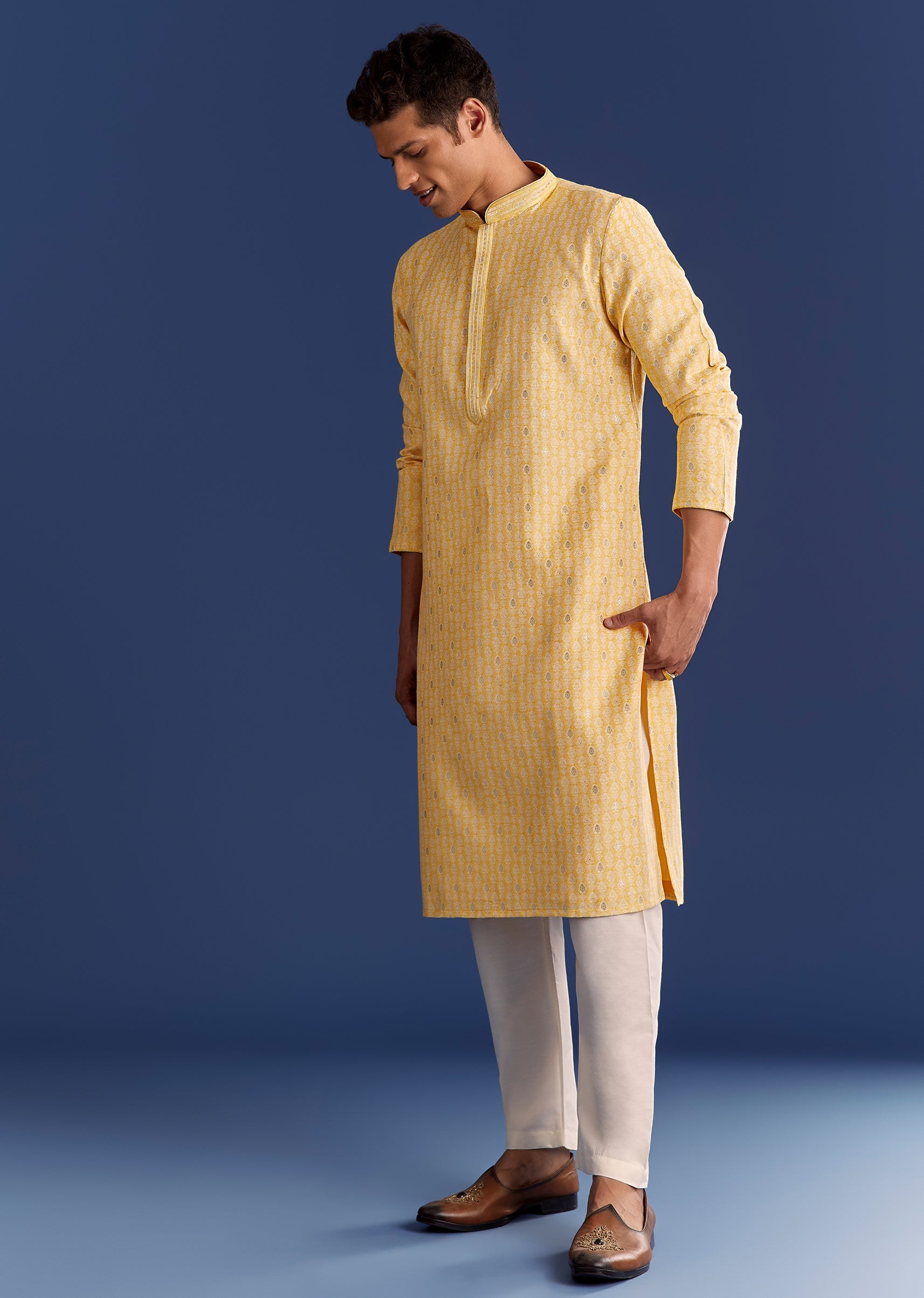 Bright and breezy, this mustard yellow jacquard kurta set is detailed with classic motifs for pooja-perfect dressing. Awarded as the Most Trusted Brand, we're delivering styles you love, just as promised.