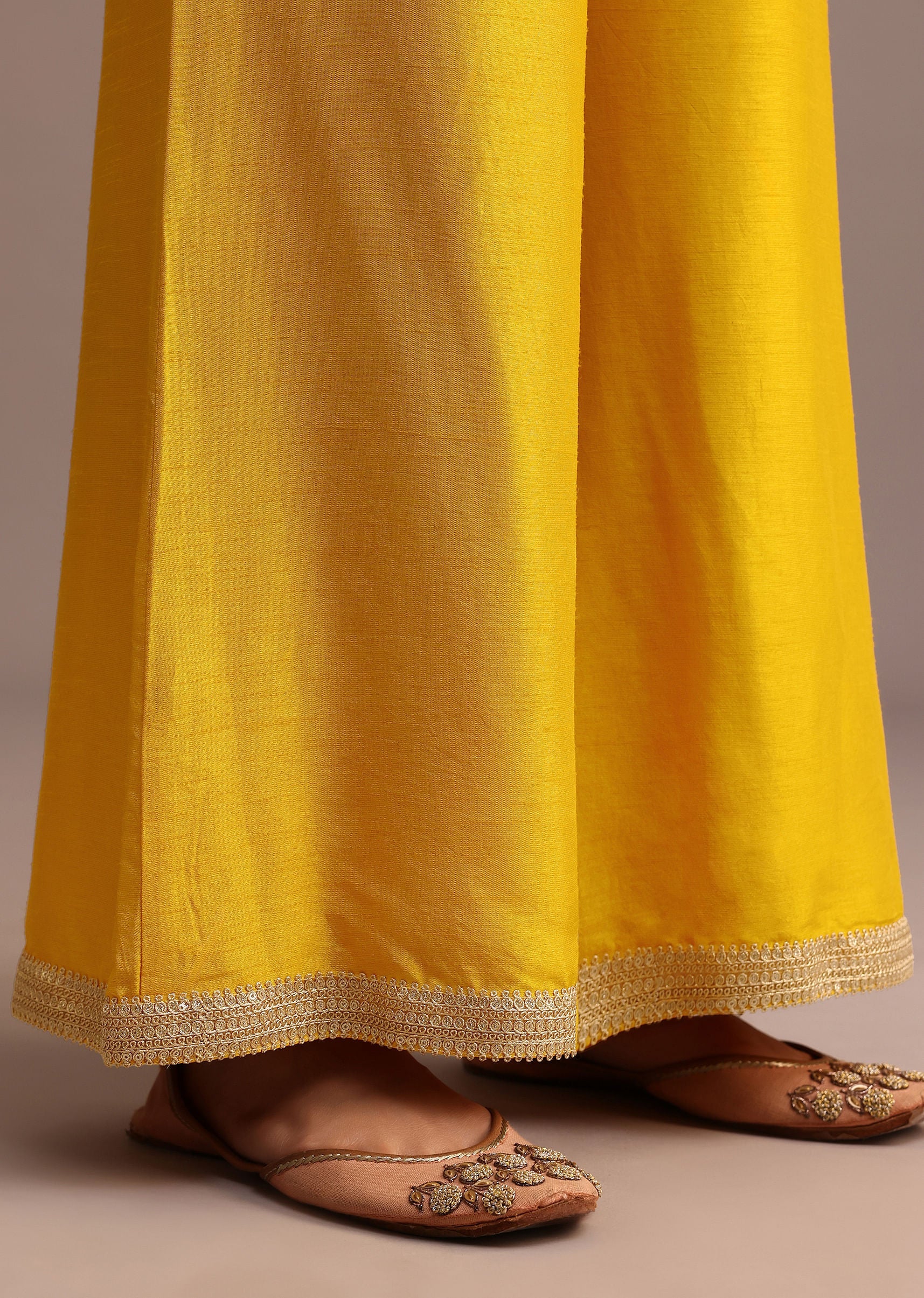 A ray of sunshine, this yellow brocade weave Anarkali set, with intricate cutdana and mirror work on the neckline, and a gorgeous brocade weave dupatta. The gotta work on the... More Product Details