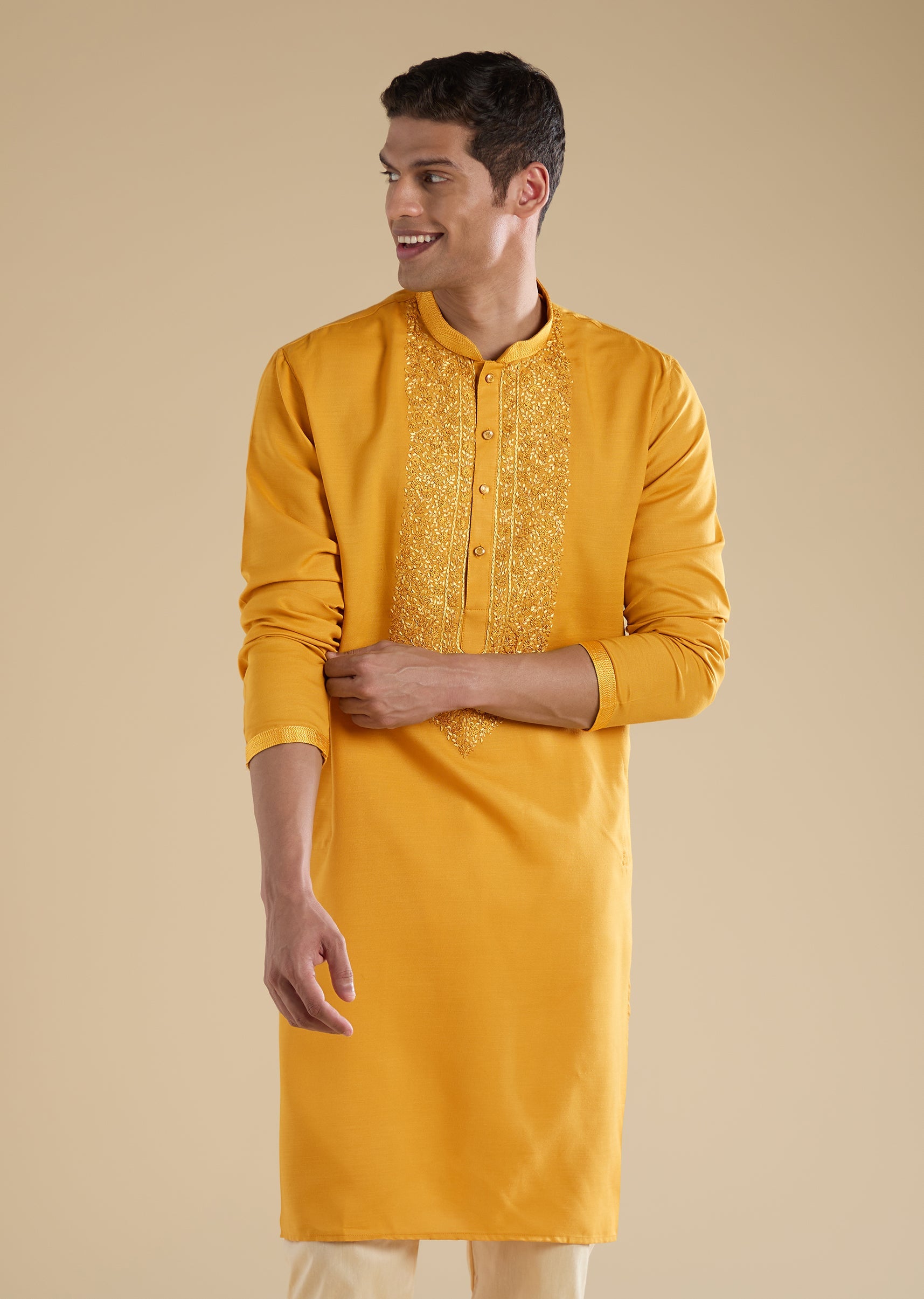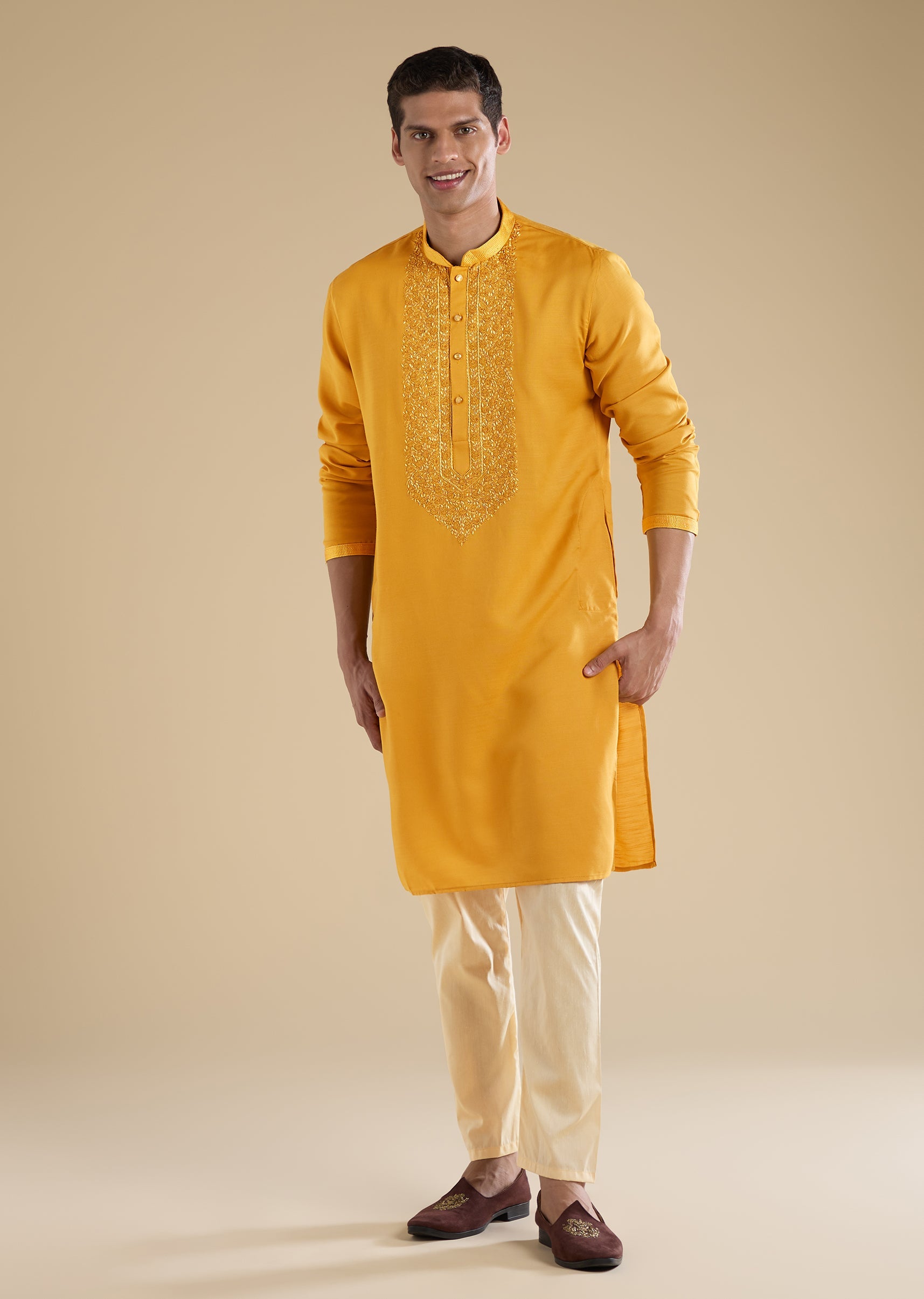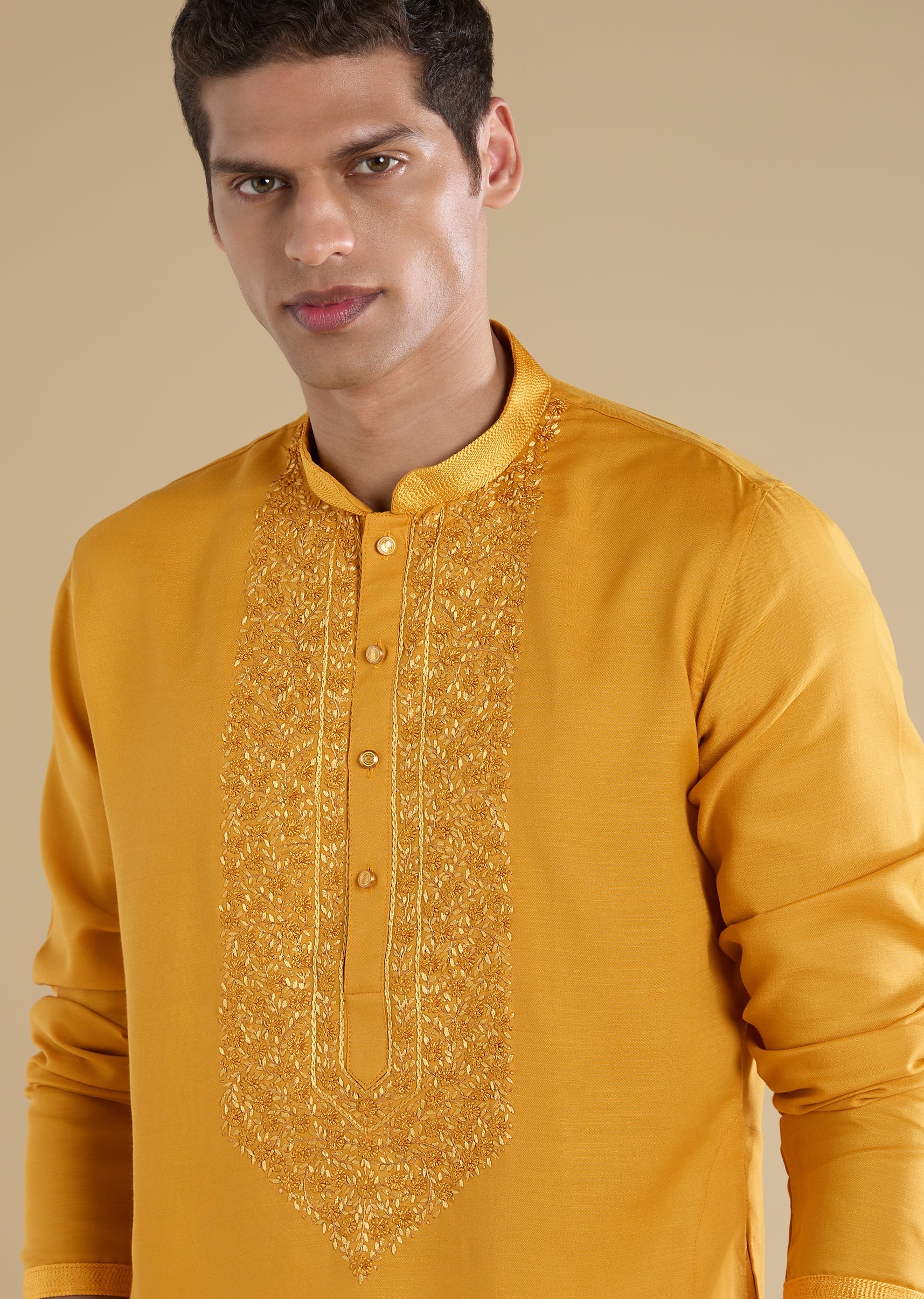 Bright and uplifting, this yellow kurta set adds a cheerful touch to casual and pooja wear. Designed with a mandarin collar, full sleeves, and clean resham thread detailing, it balances... More Product Details