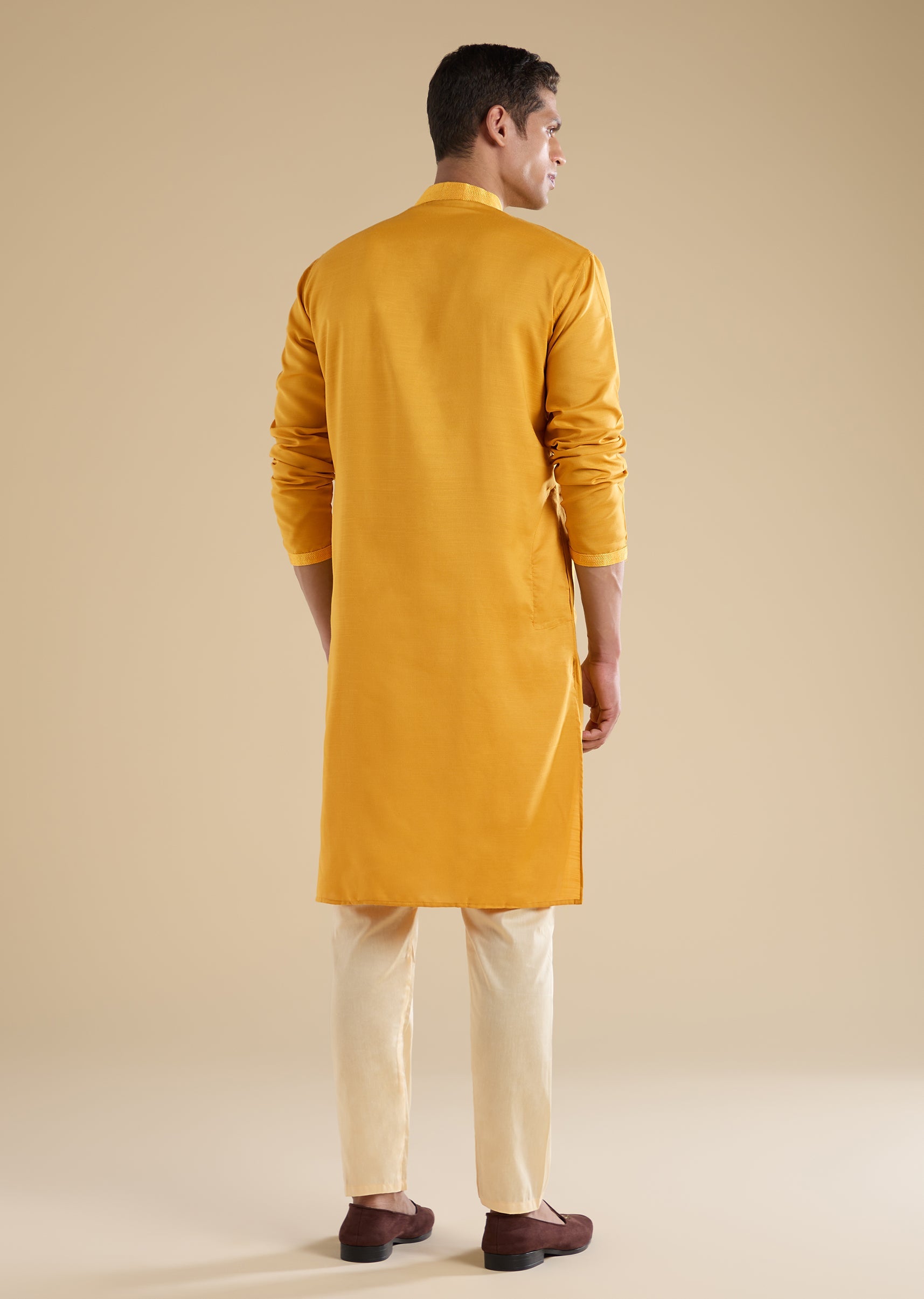 Bright and uplifting, this yellow kurta set adds a cheerful touch to casual and pooja wear. Designed with a mandarin collar, full sleeves, and clean resham thread detailing, it balances simplicity with tradition. Finished with straight-fit trousers featuring an elasticated drawstring waist, it ensures day-long comfort. Awarded as the Most Trusted Brand, we're delivering styles you love, just as promised.