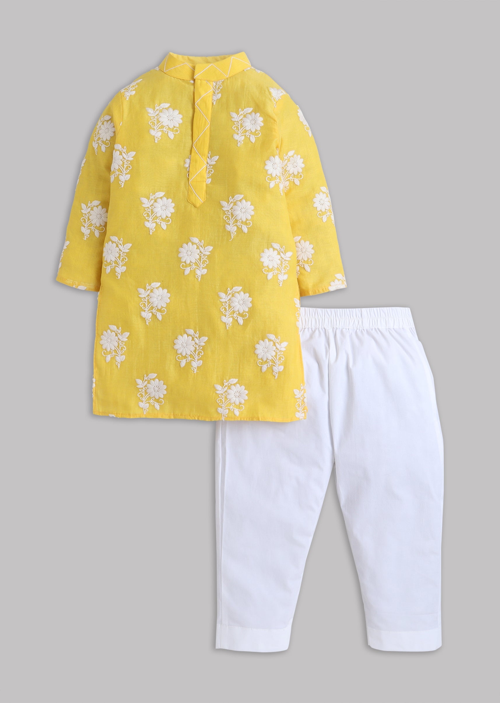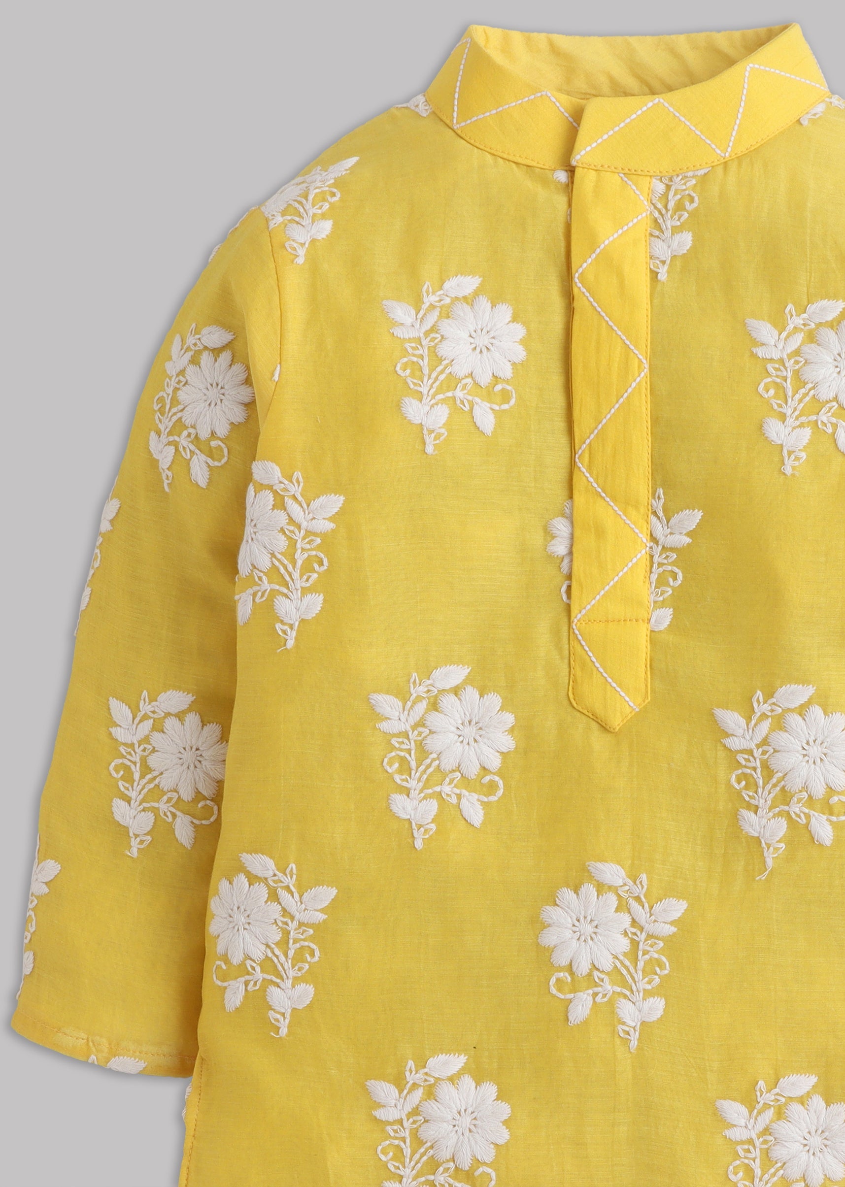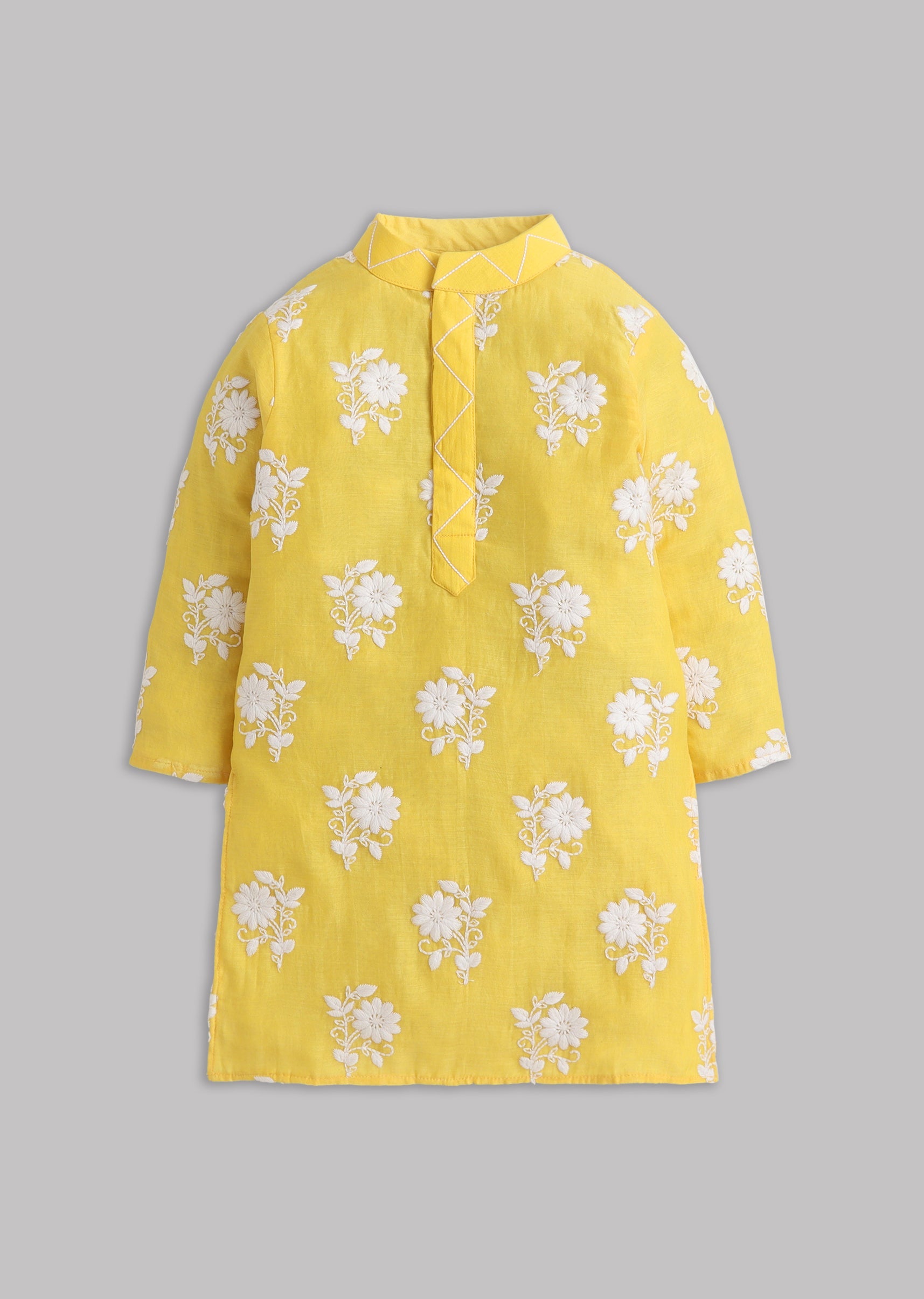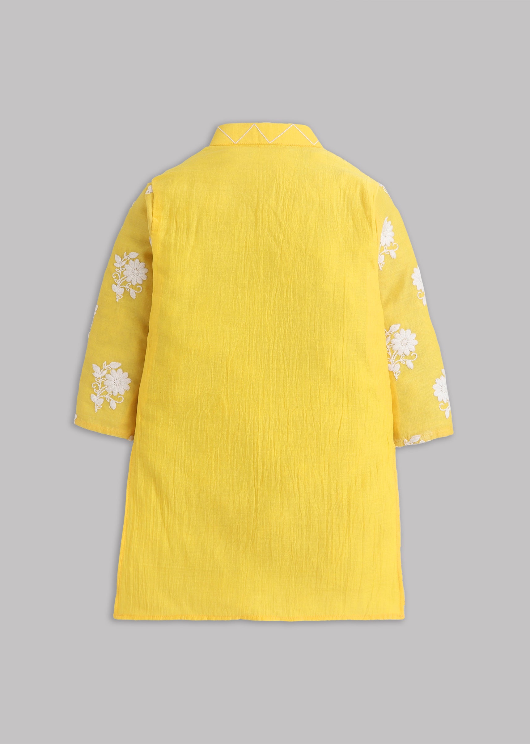 A vibrant yellow Chanderi kurta set with elegant embroidery, finished with full sleeves and a mandarin collar. Paired with a coordinated bottom—perfect for haldi or daytime festive wear. Awarded as... More Product Details