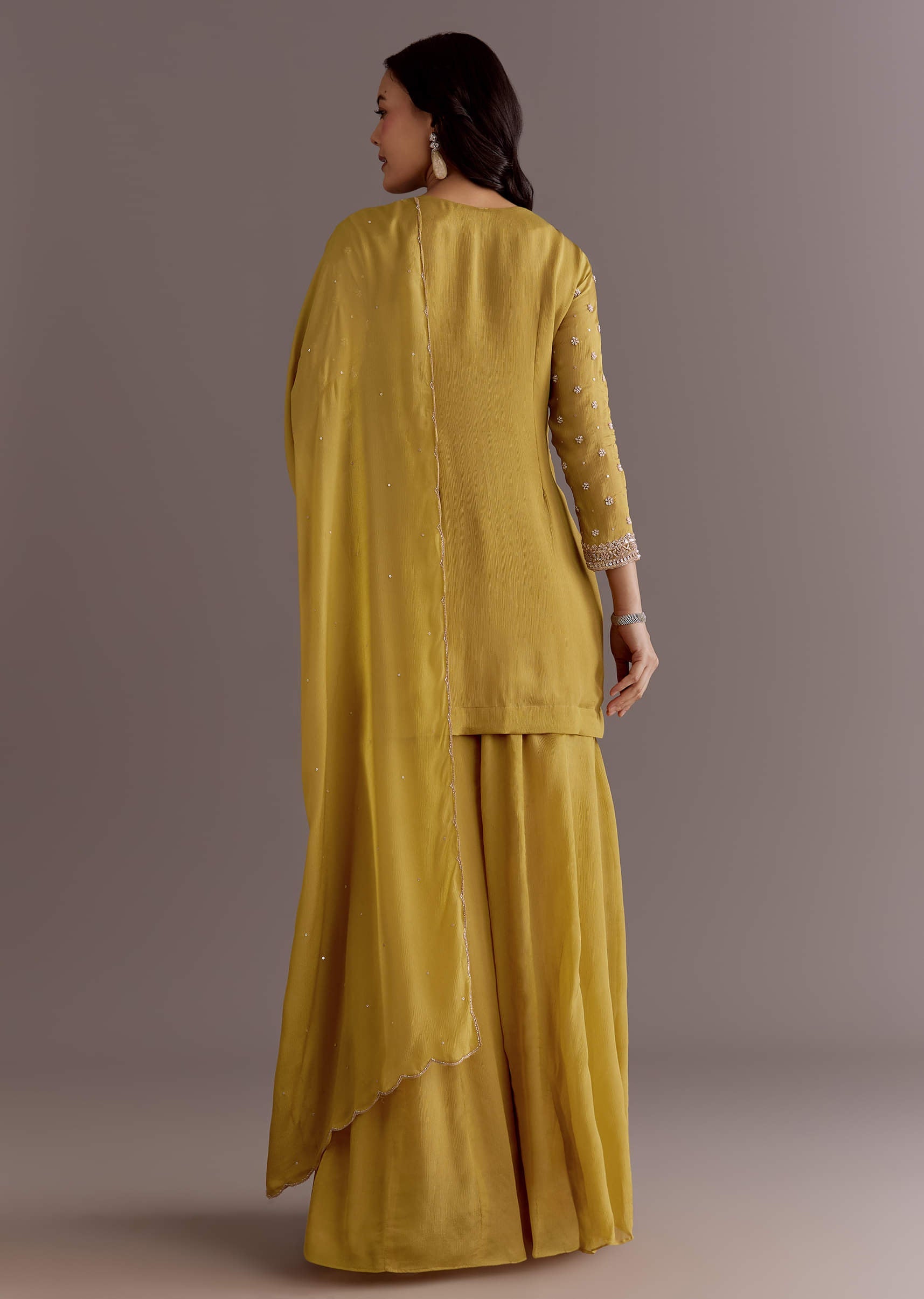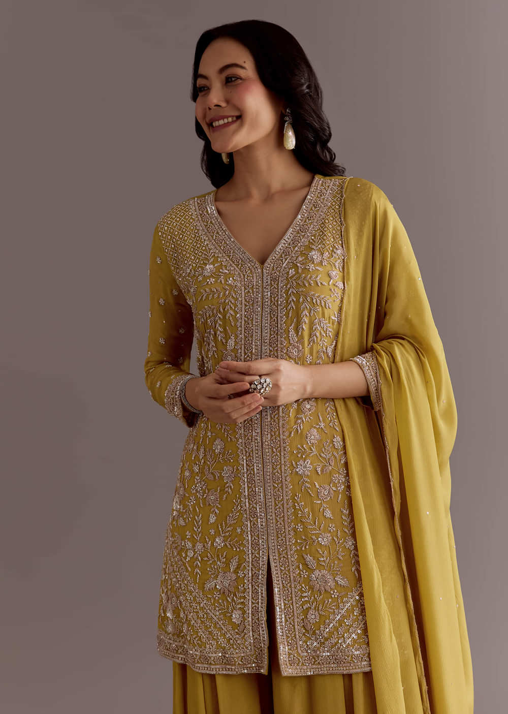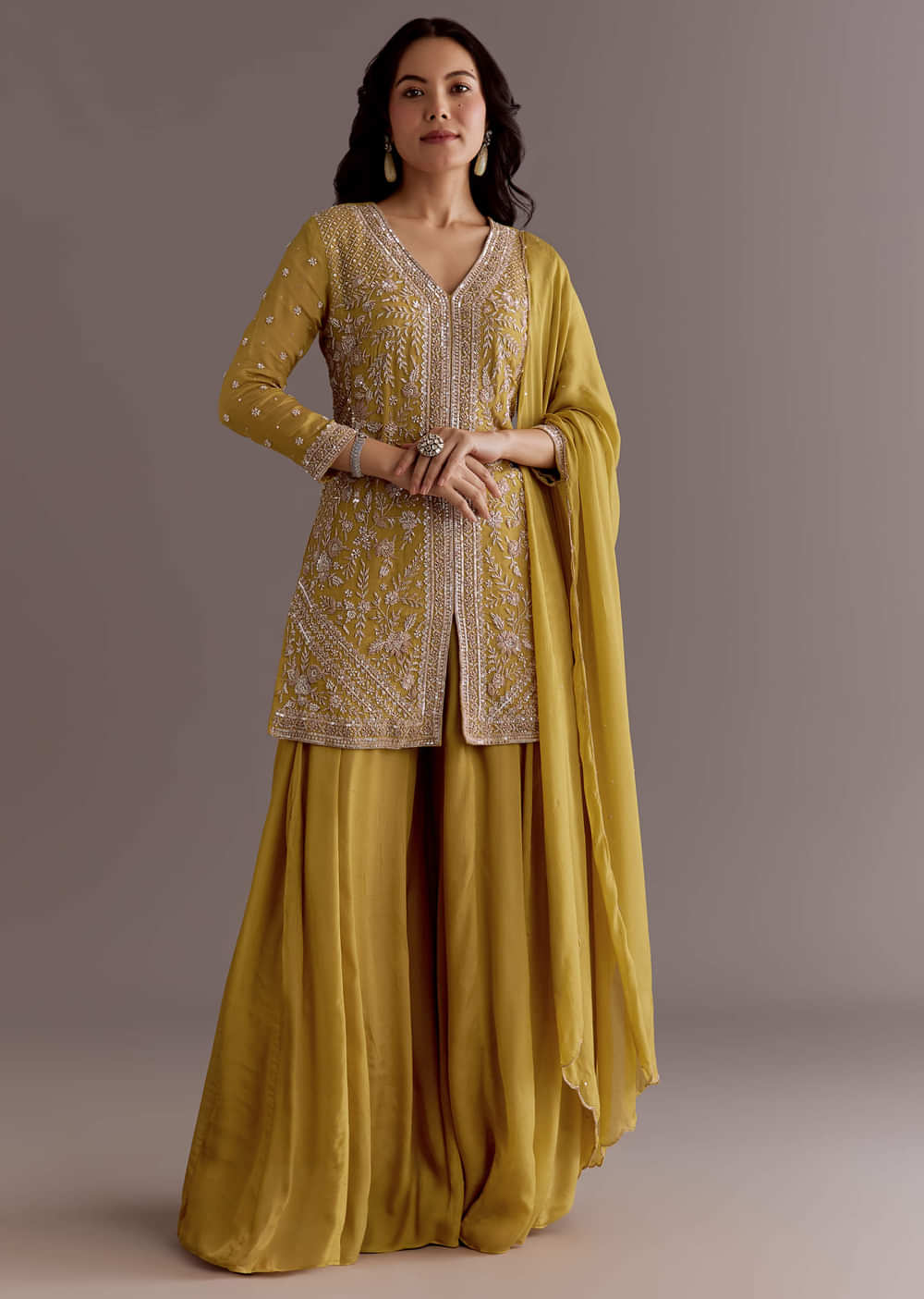 A soft yellow kurta sparkles with cut dana and sequins embroidery, its chinon dupatta twinkling like morning light. A haldi-ready stunner.Standard length for Palazzo is 41 Inches. Awarded as the... More Product Details