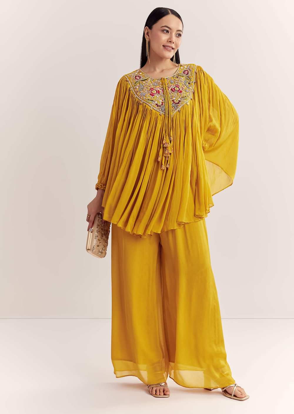 Yellow Chinon Kaftan Kurta Set With Zardosi And Thread Work